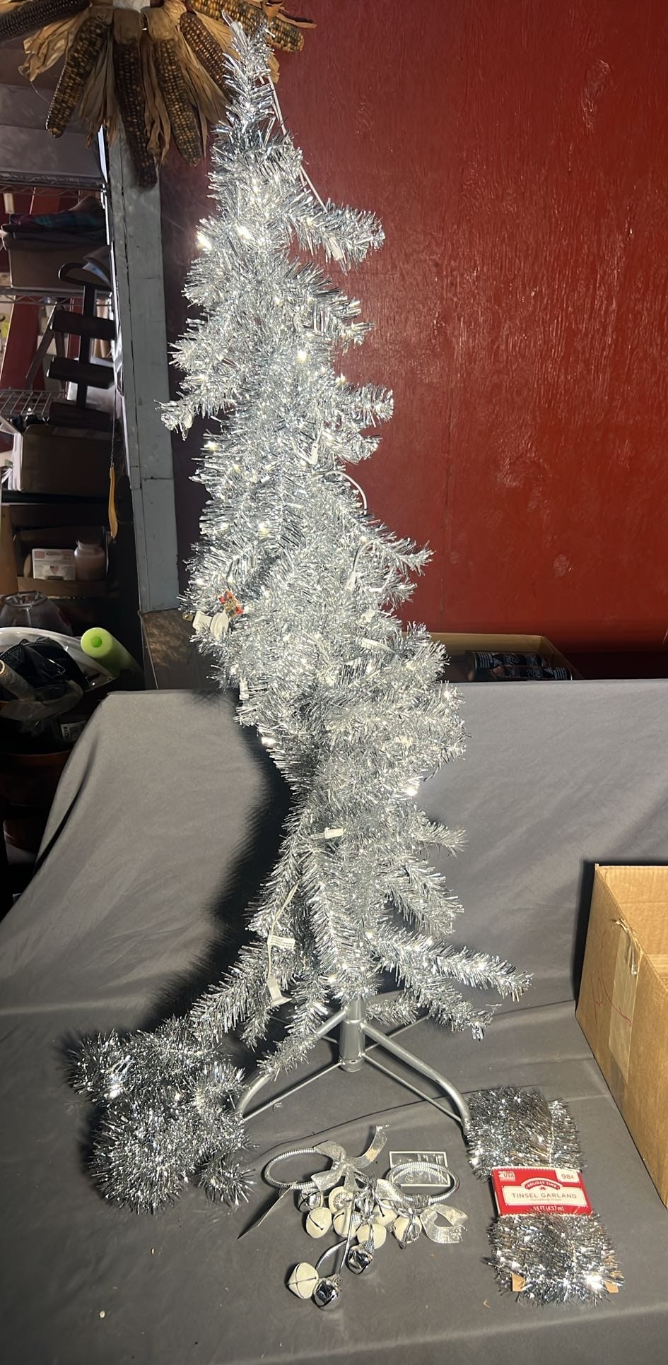 118 Lighted Silver Christmas Tree , 45” , tinsel , bells
