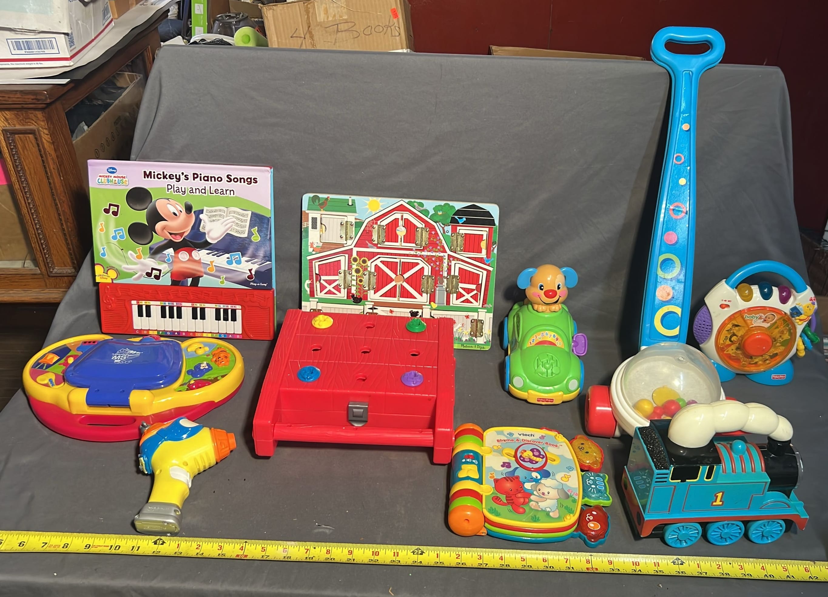 128 Mickeys Piano Songs Play and Learn book , Melissa and Doug Door Board , Fisher Price push popper , Thomas the Train ,battery operated , Vtech Rhyme &Discover Book , miscellaneous toys