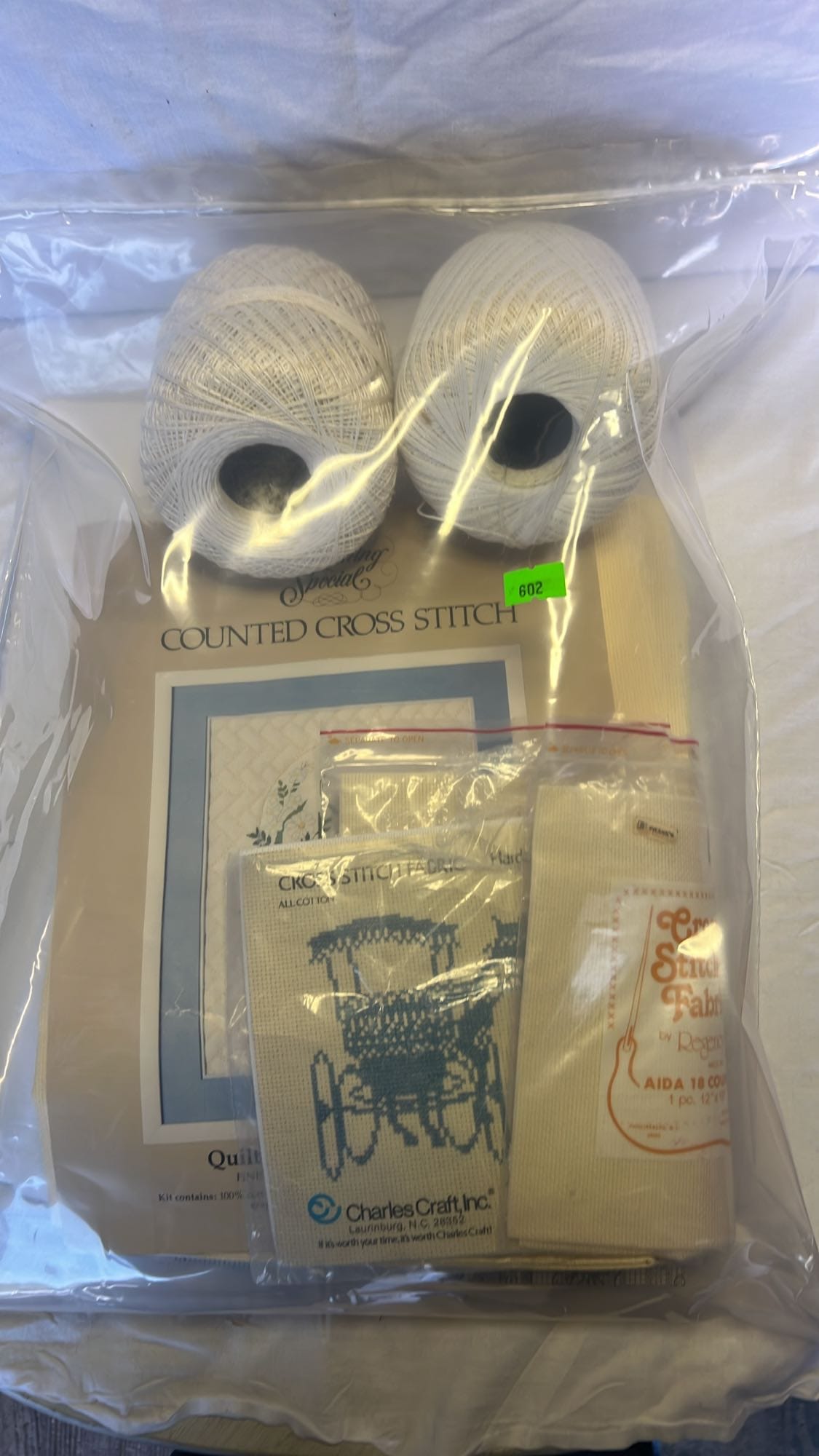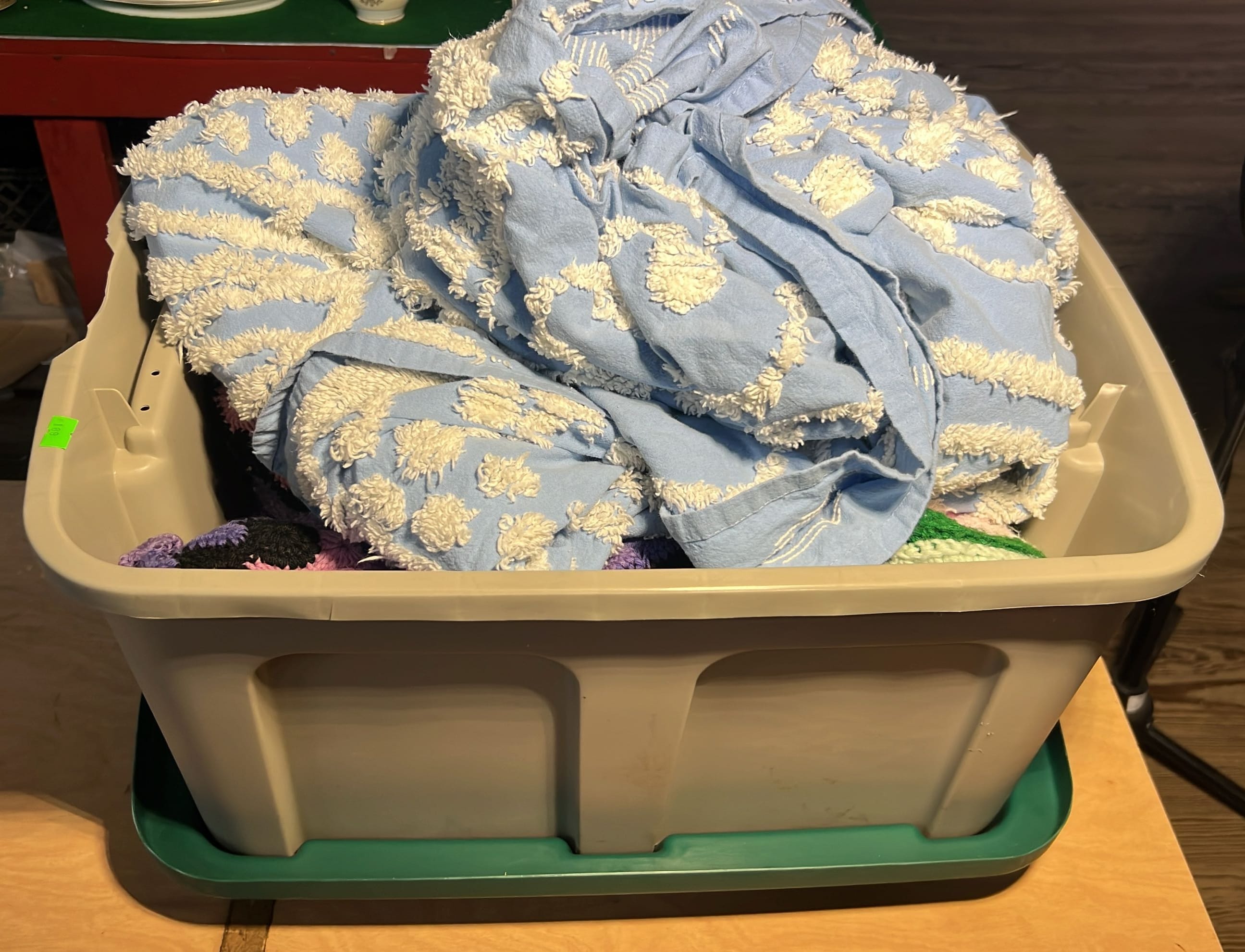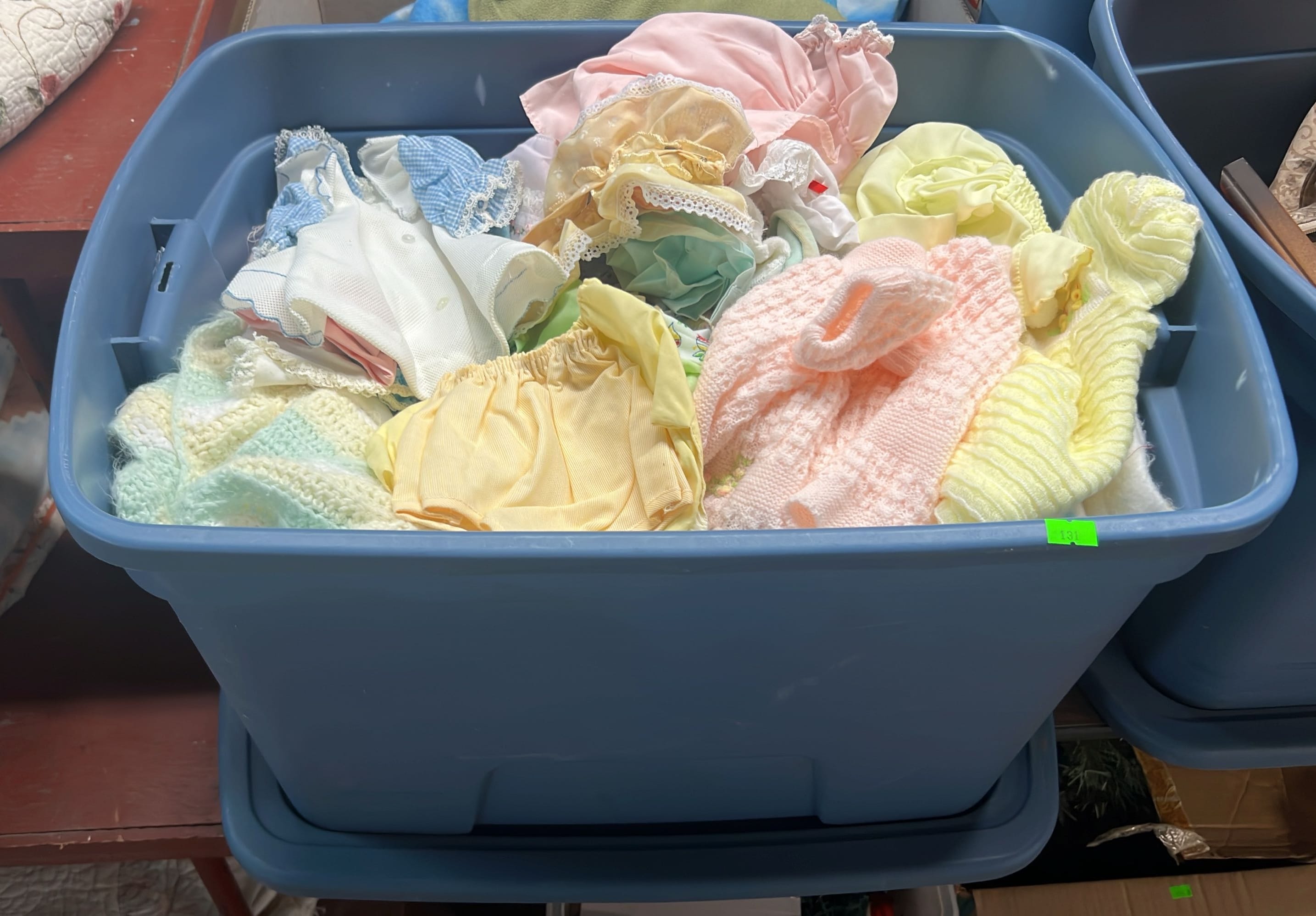 131 Doll/ Baby Clothes Assortment , baby afghans in tote with lid