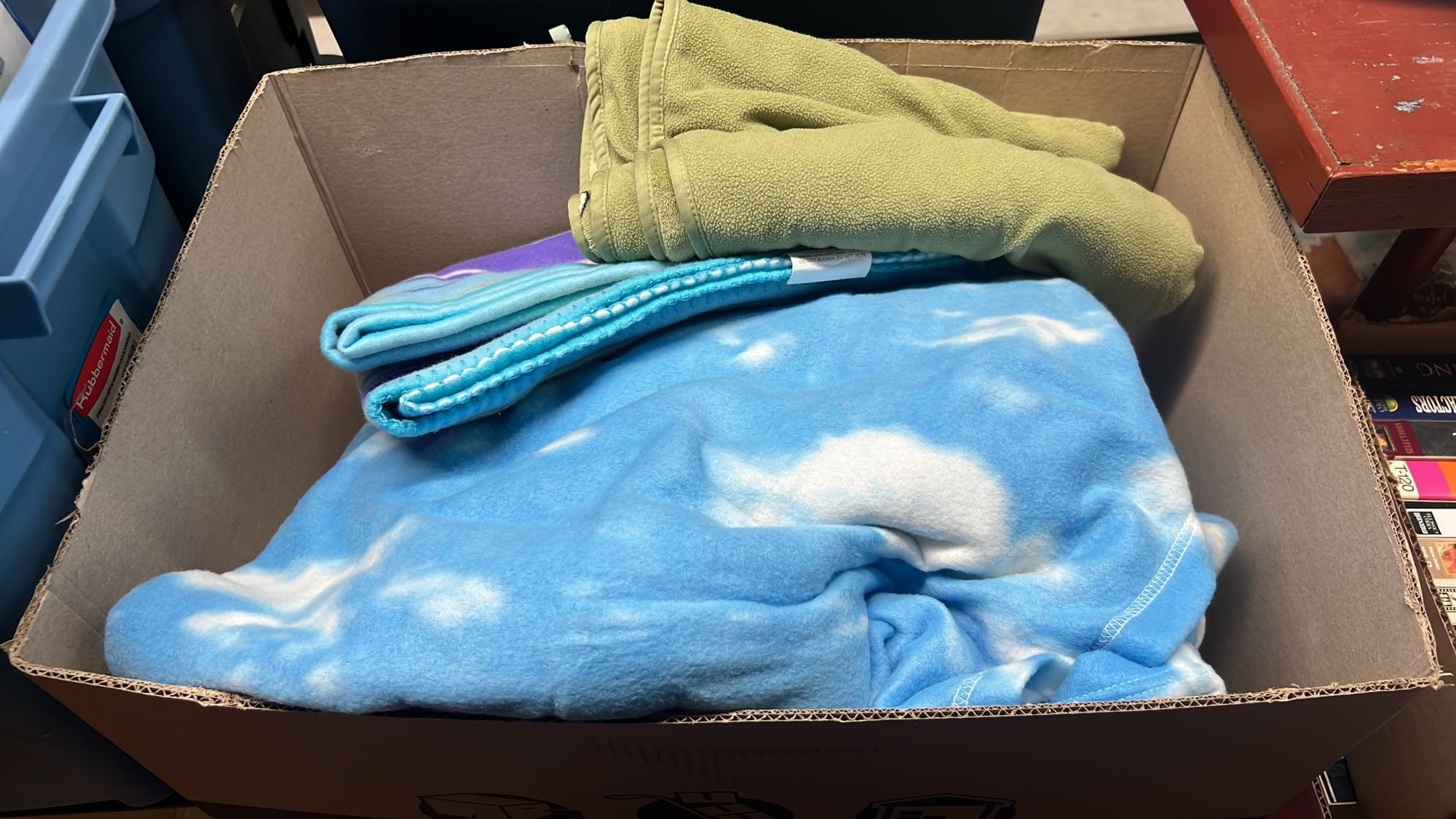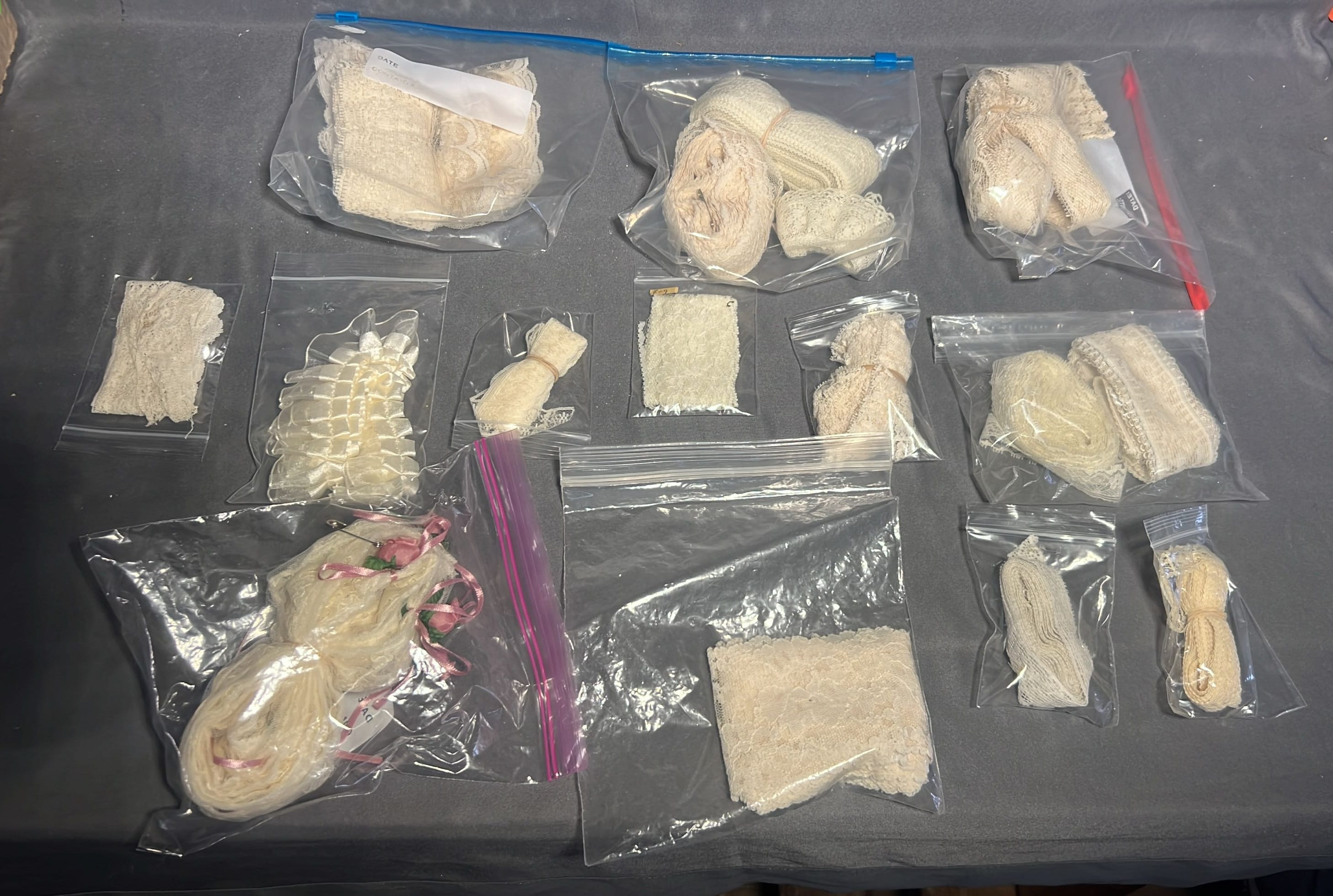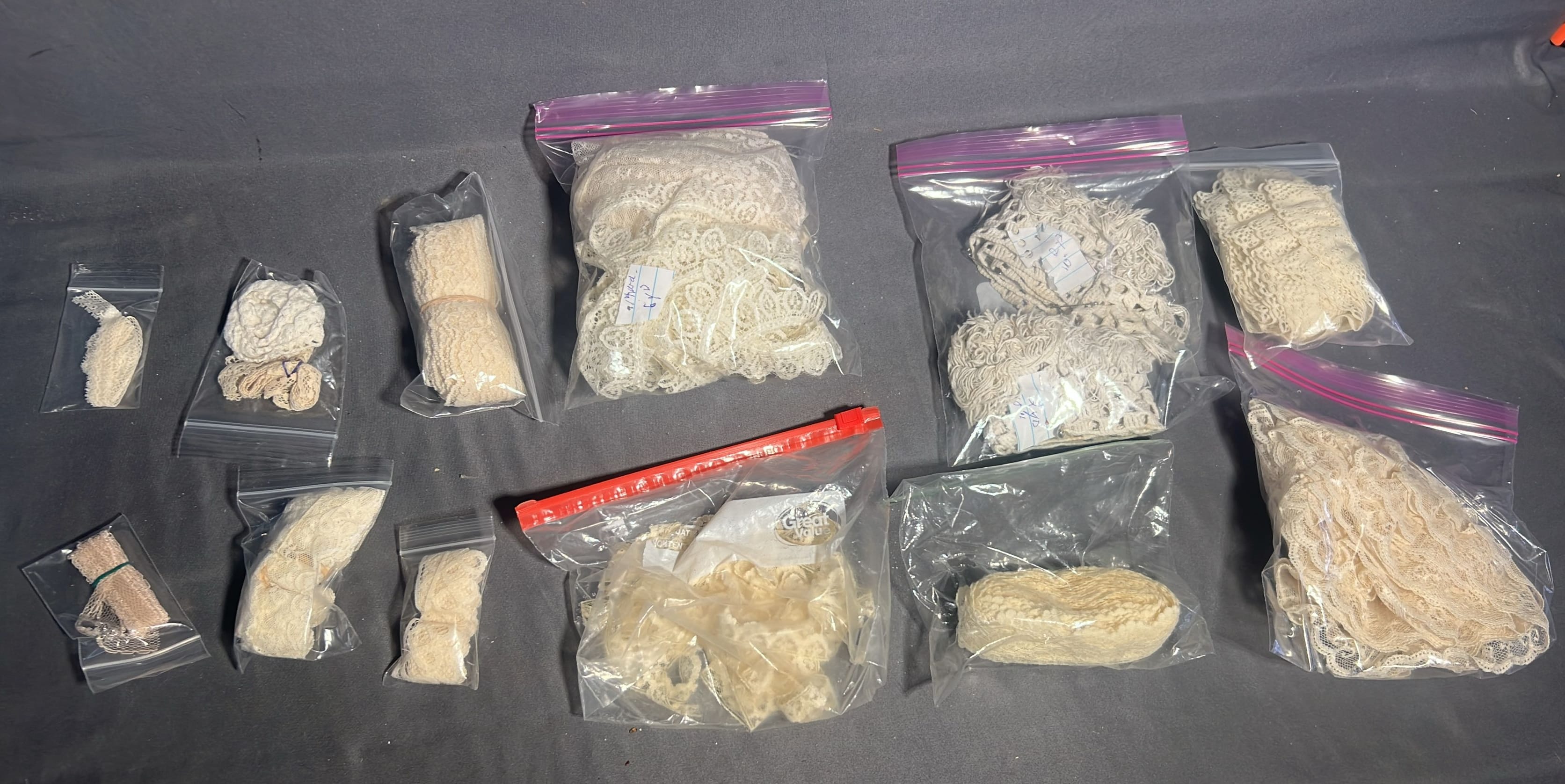 131 Doll/ Baby Clothes Assortment , baby afghans in tote with lid
