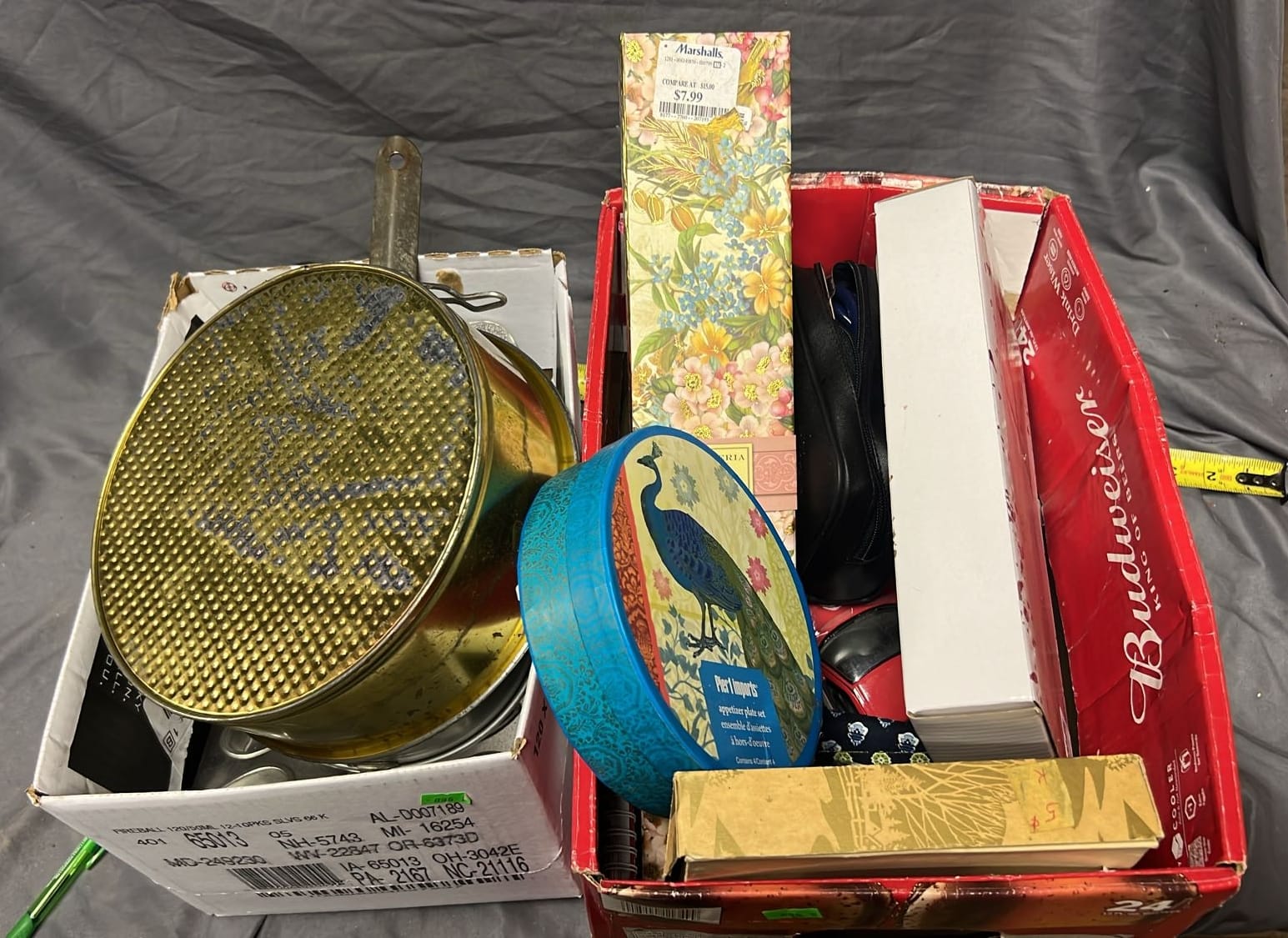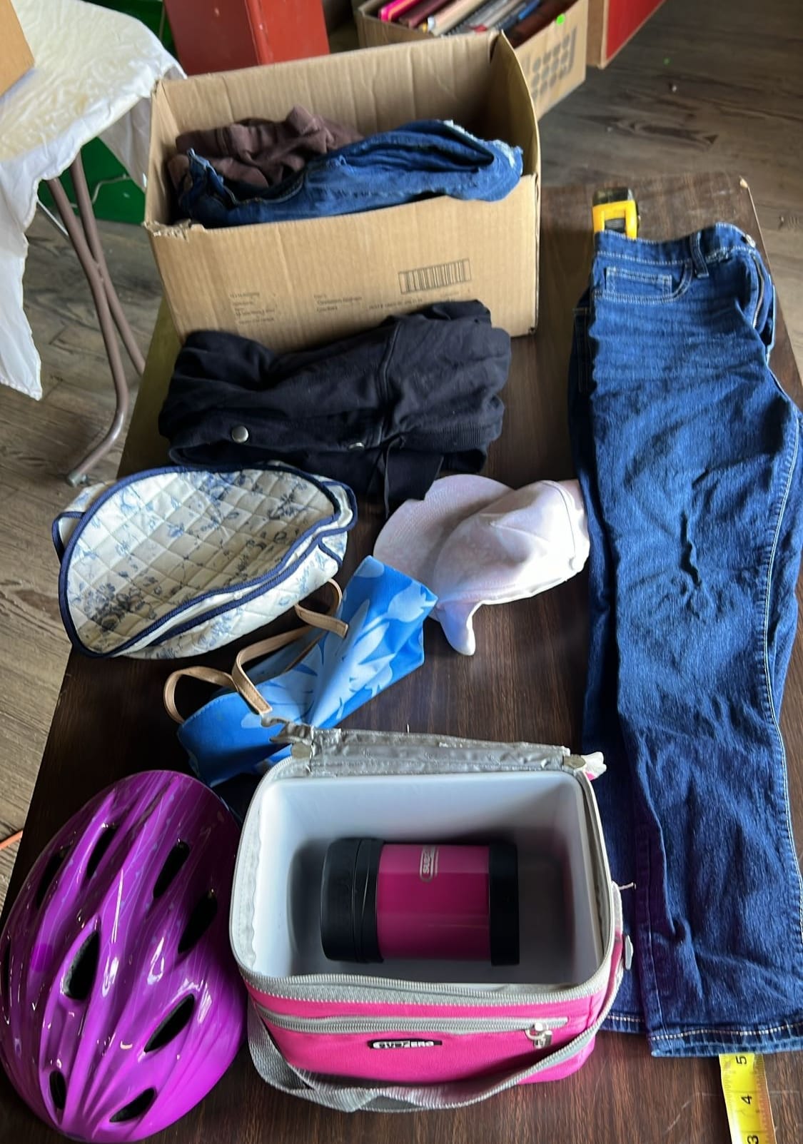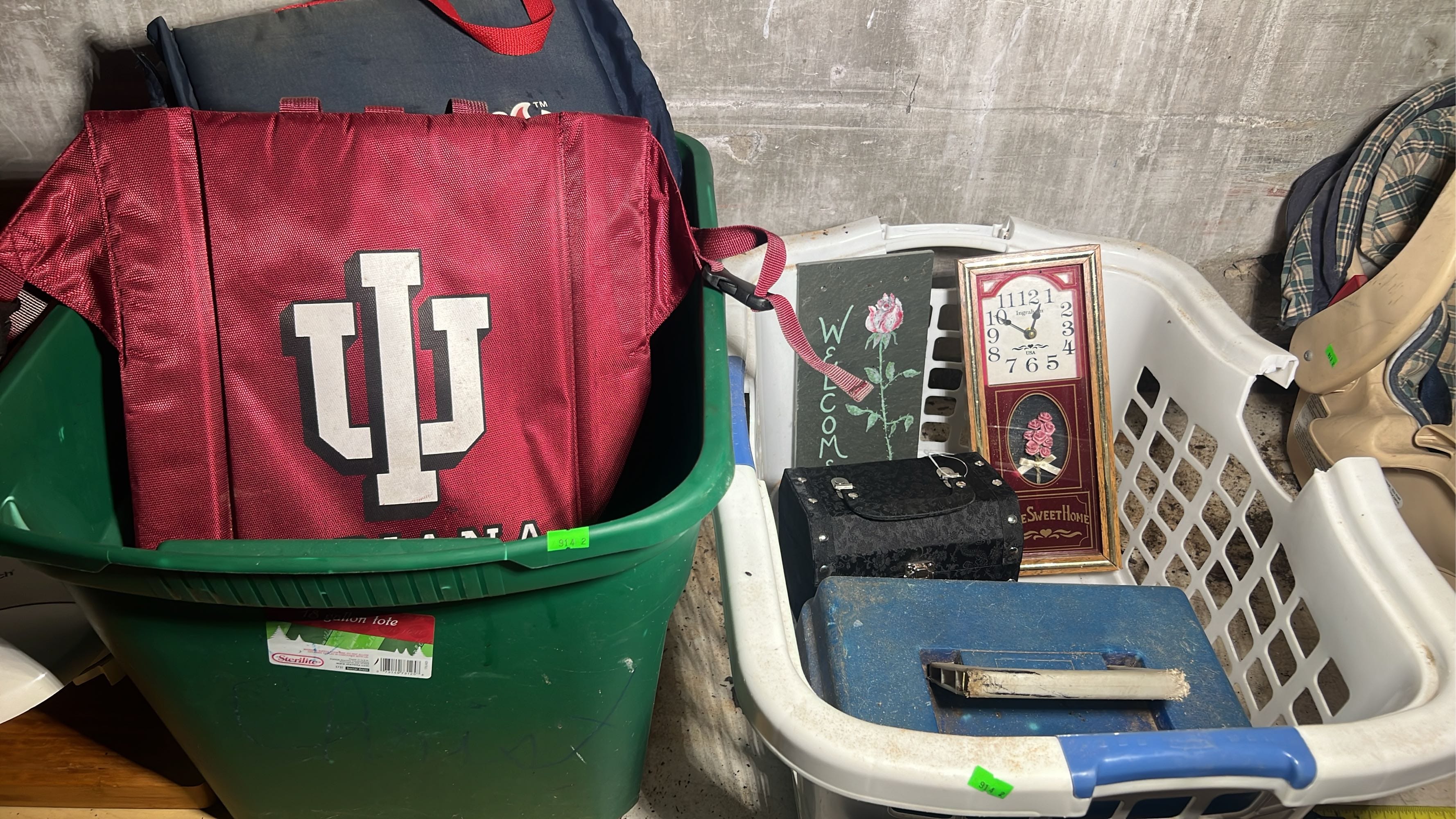 914 Clocks , jewelry box , laundry basket ,Bell Motorcycle helmet liner loose inside , IU seat , ,miscellaneous in tote no lid