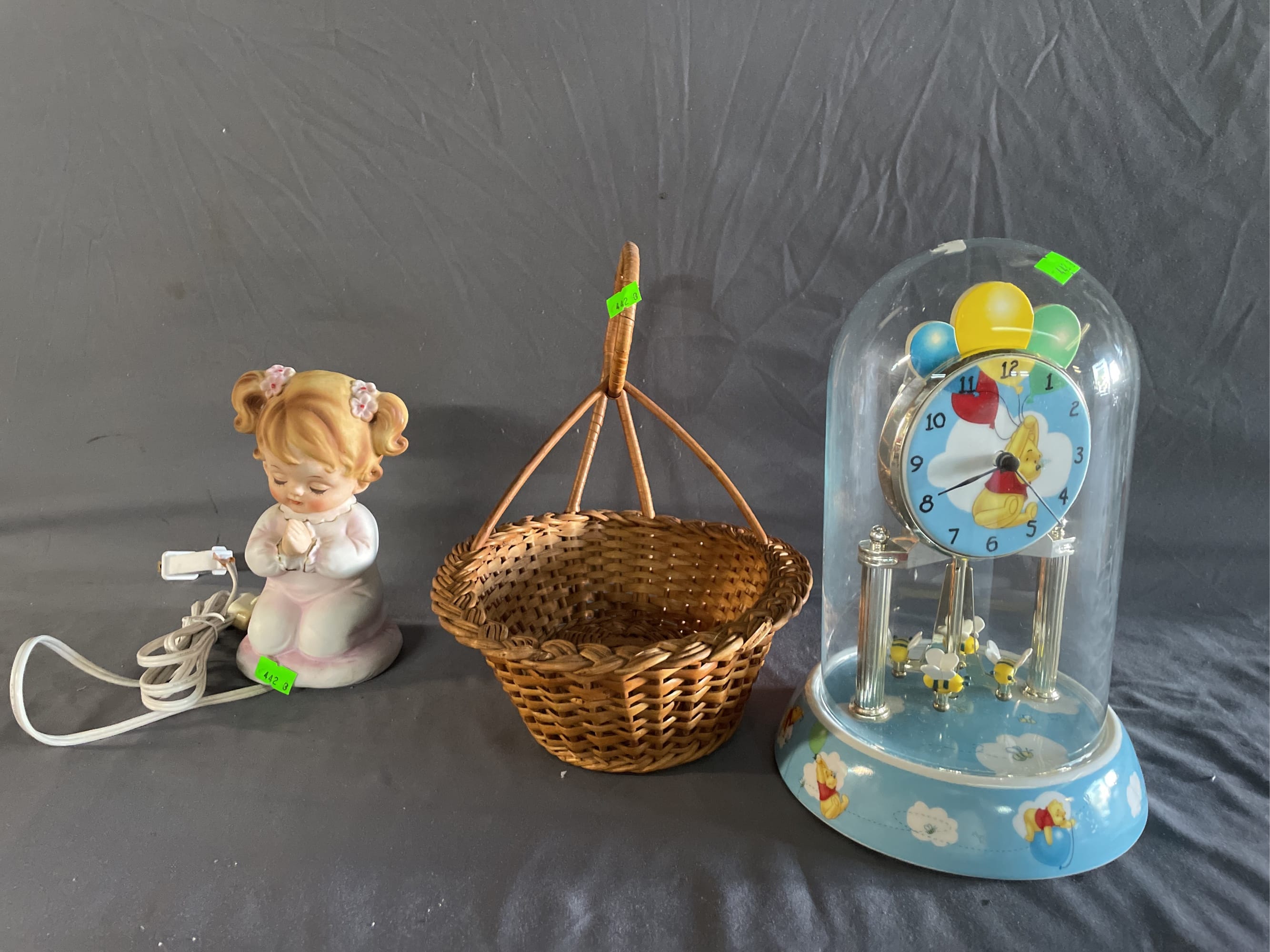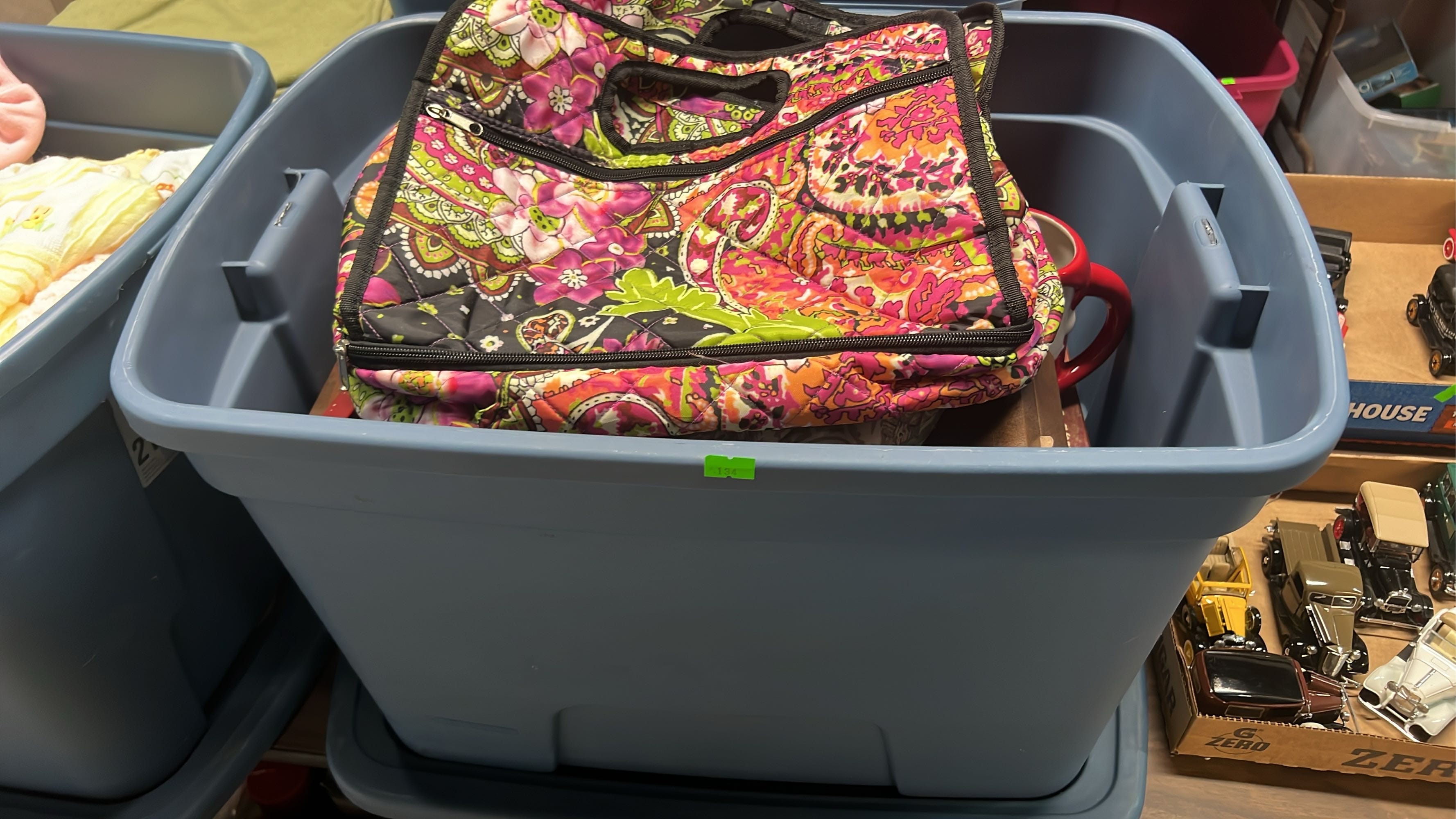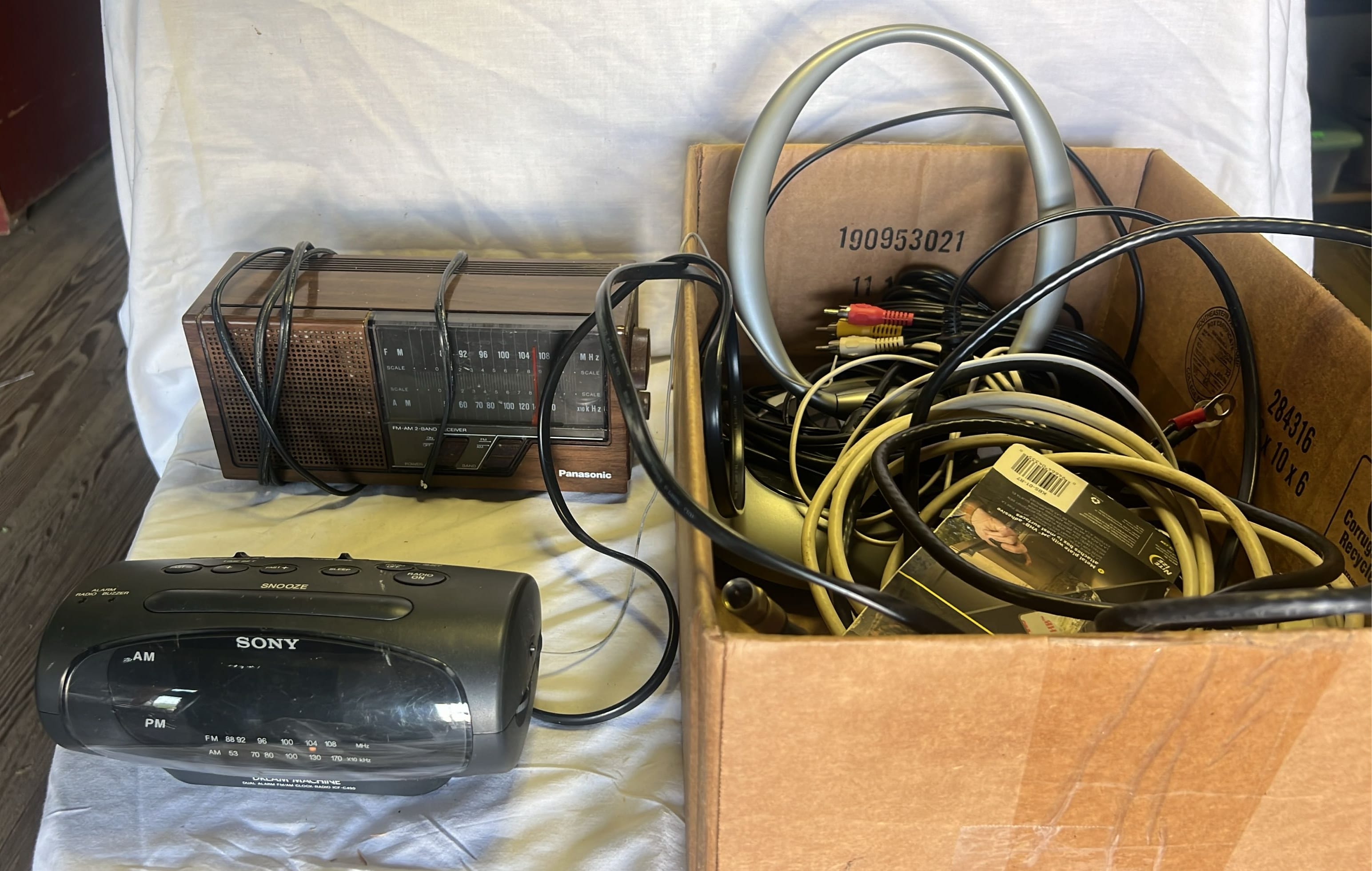 914 Clocks , jewelry box , laundry basket ,Bell Motorcycle helmet liner loose inside , IU seat , ,miscellaneous in tote no lid