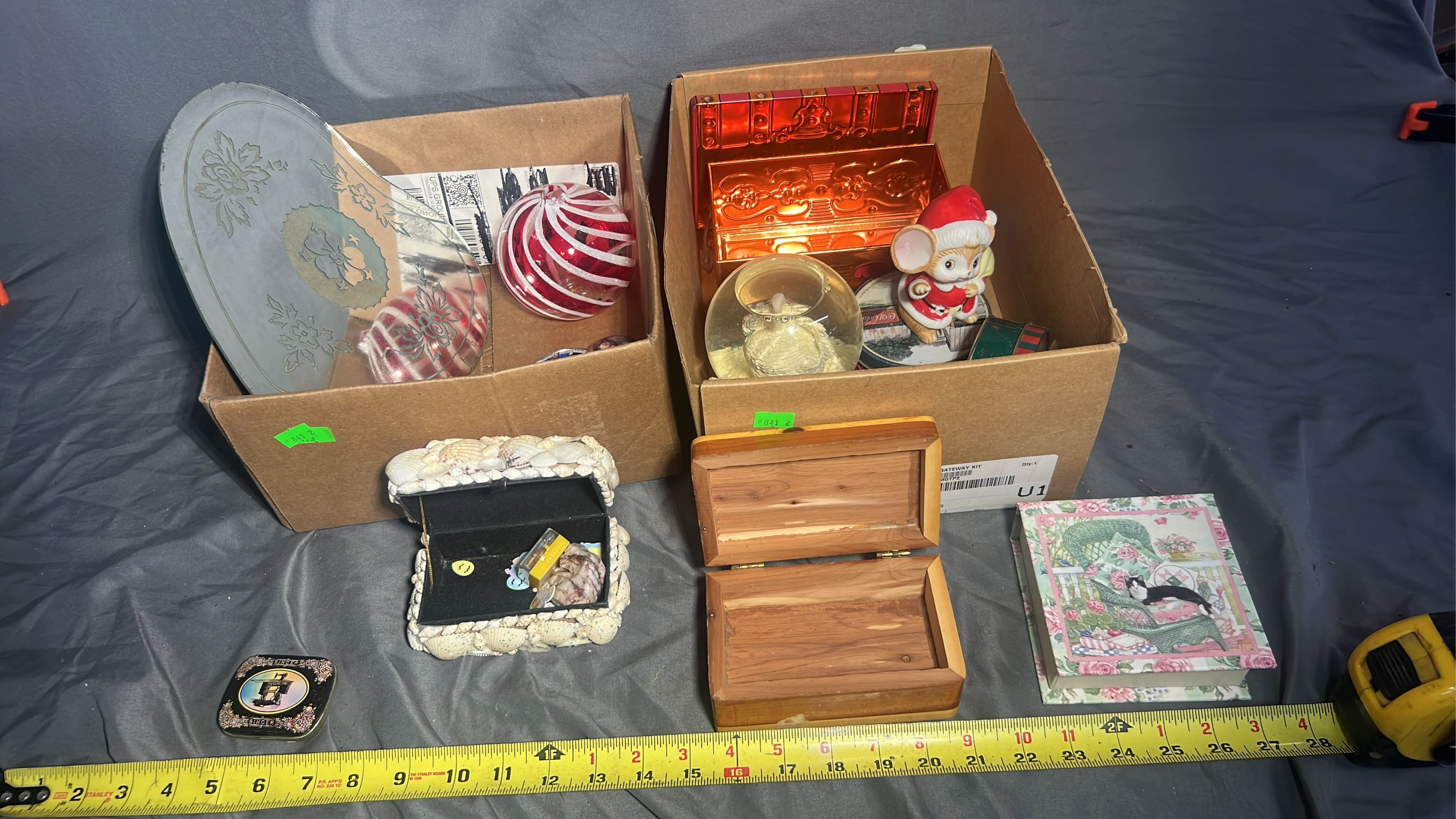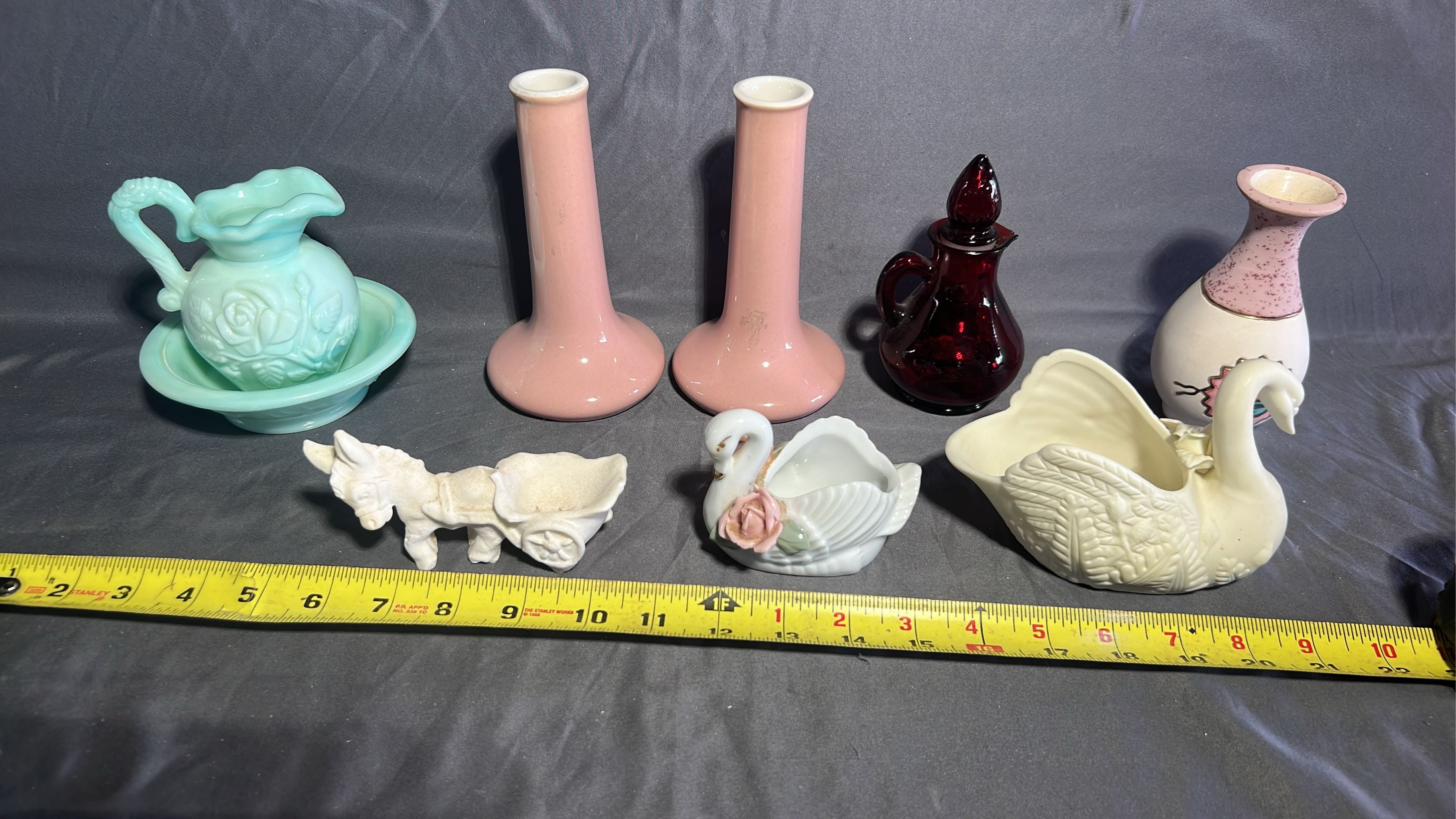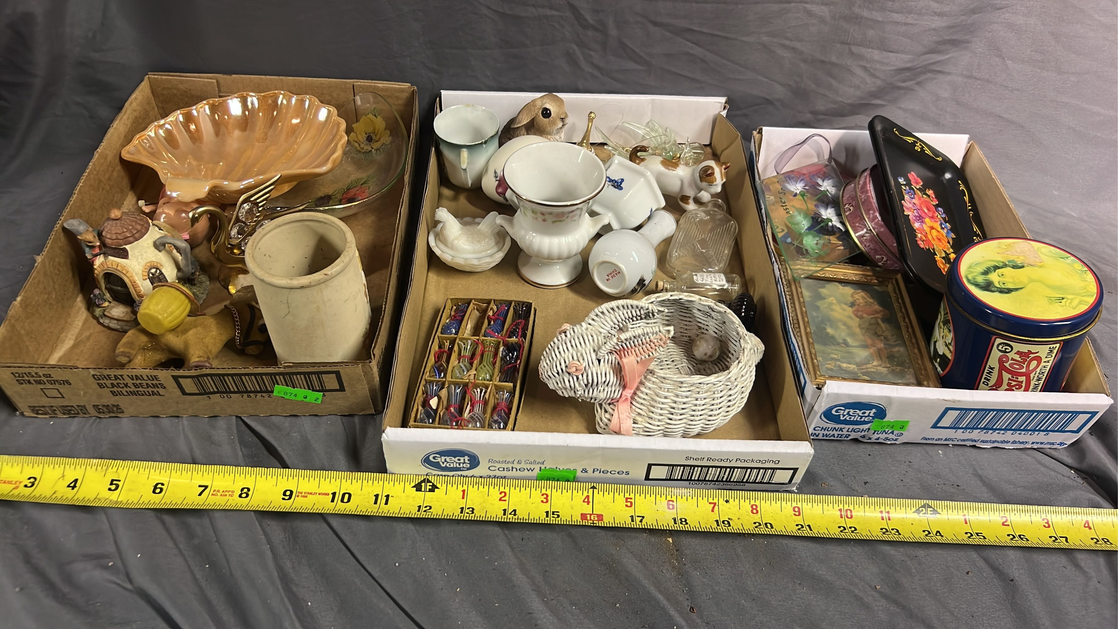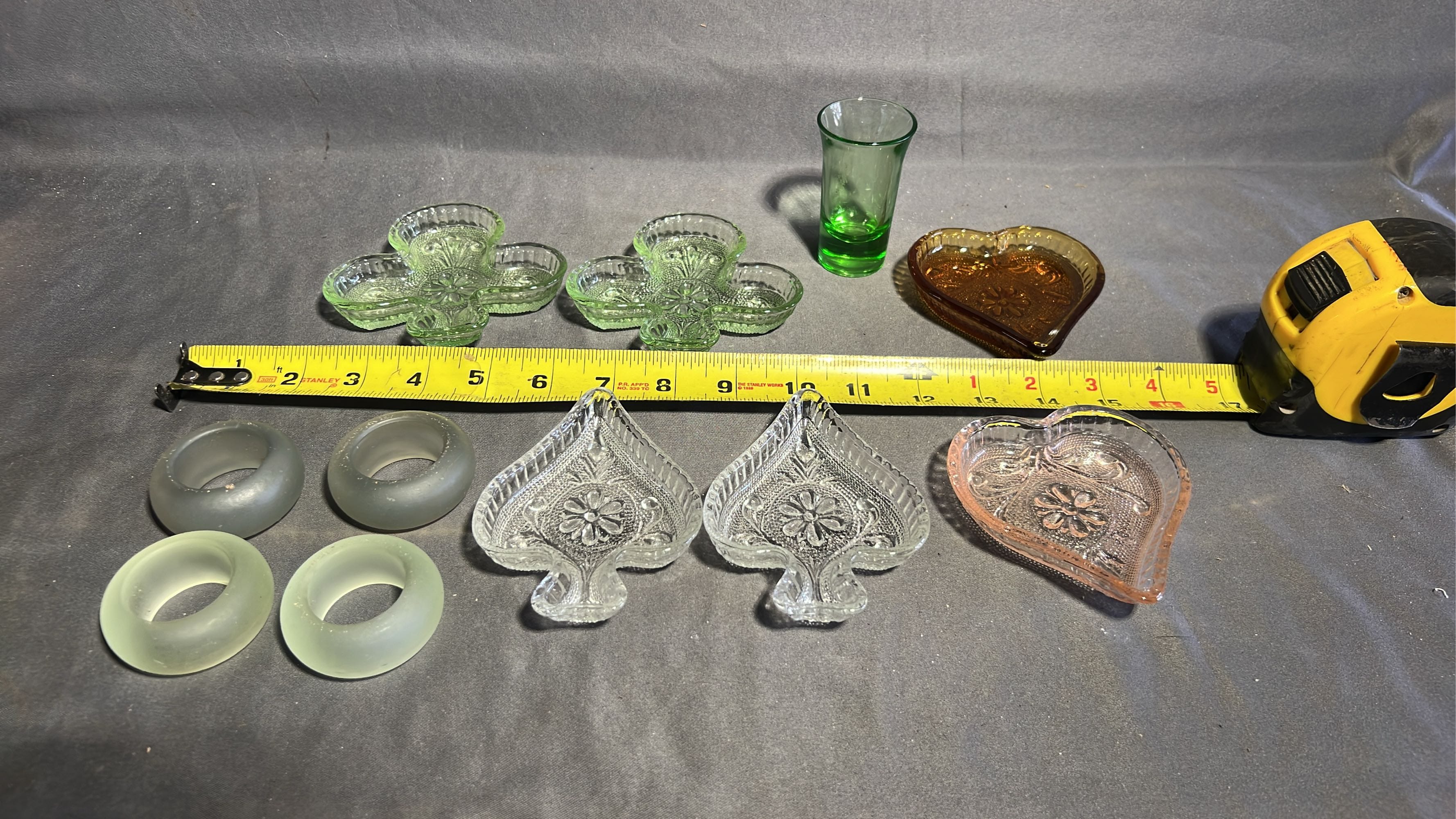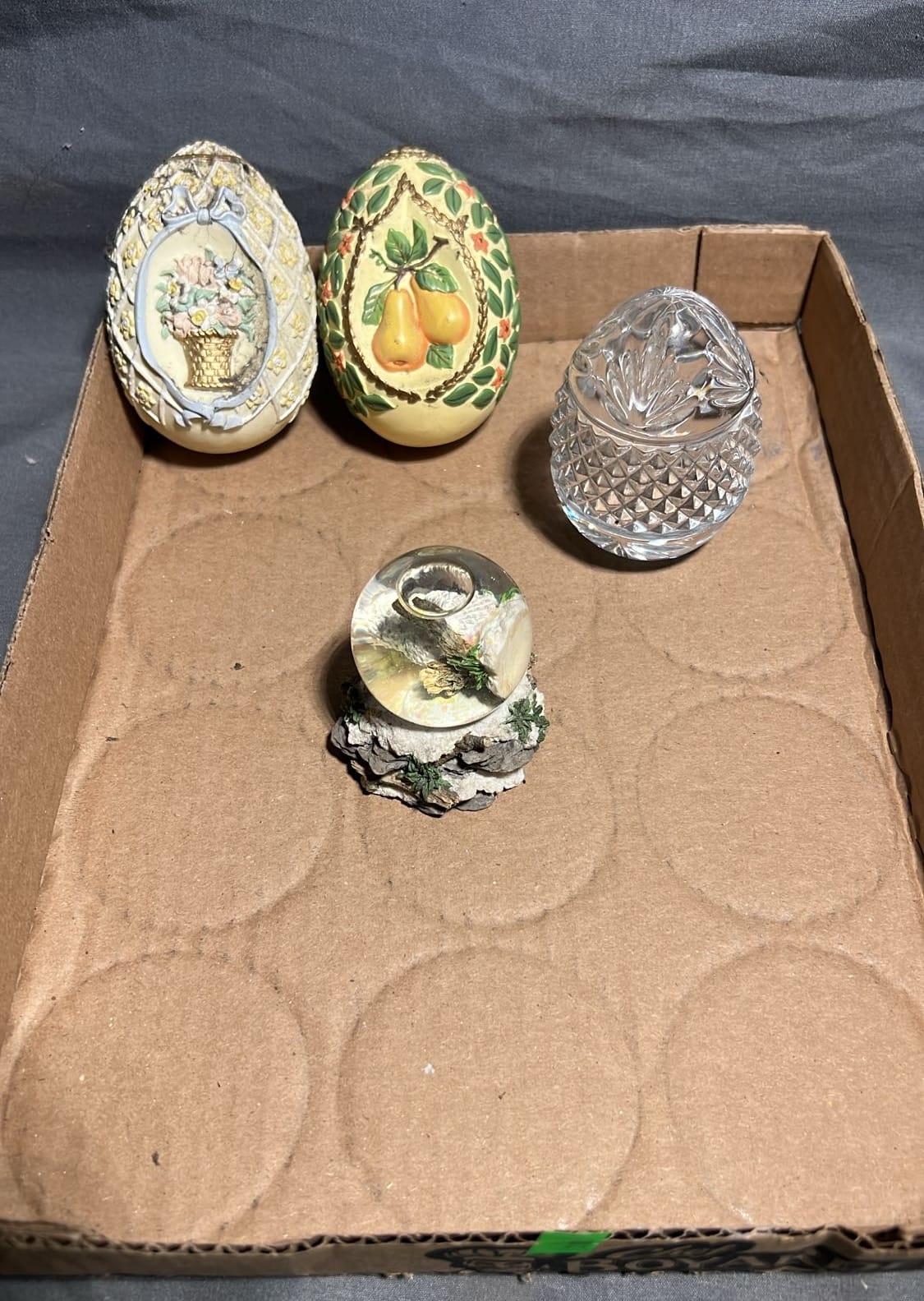 874 Glass Shell Dish , mini Hen on nest , mini glass vases , tins , miscellaneous decorations