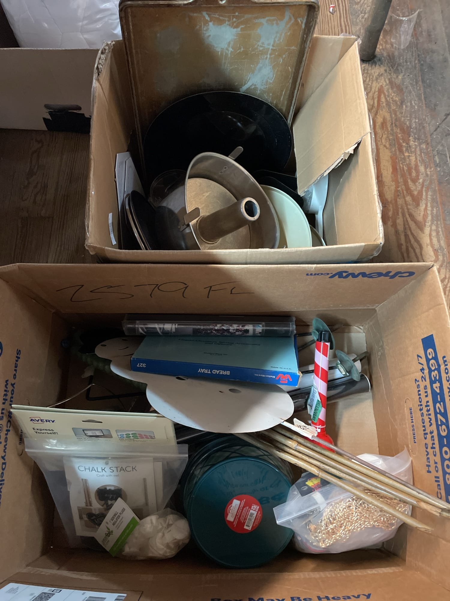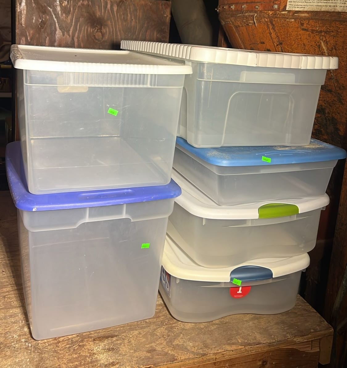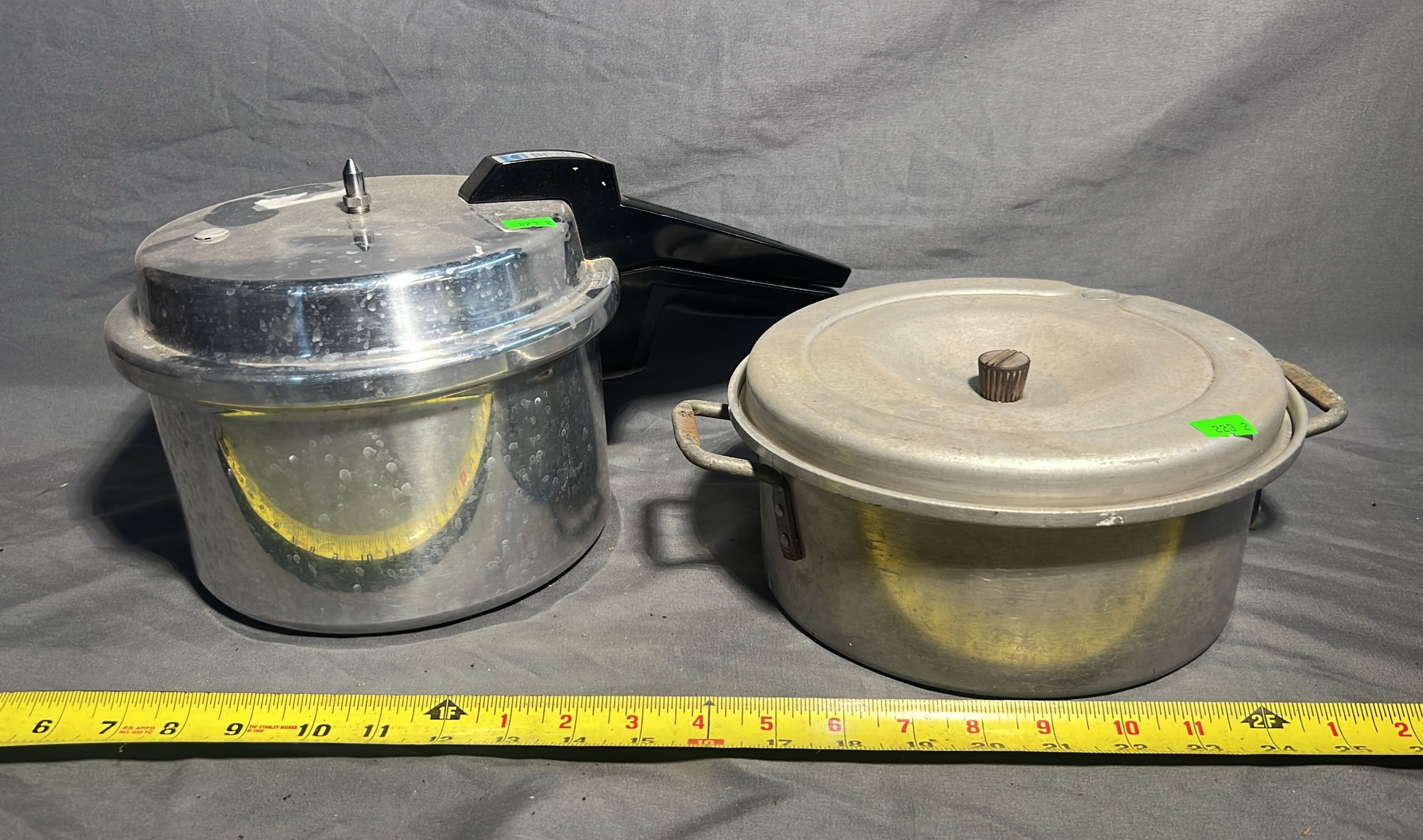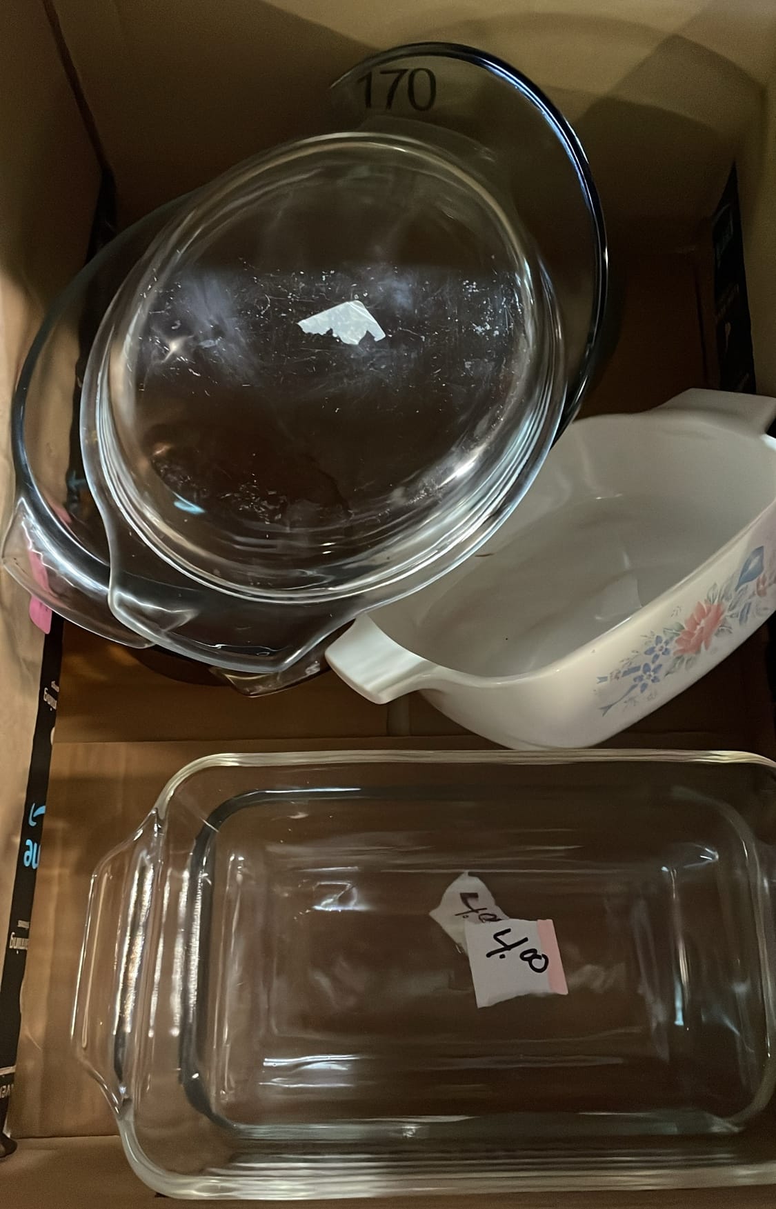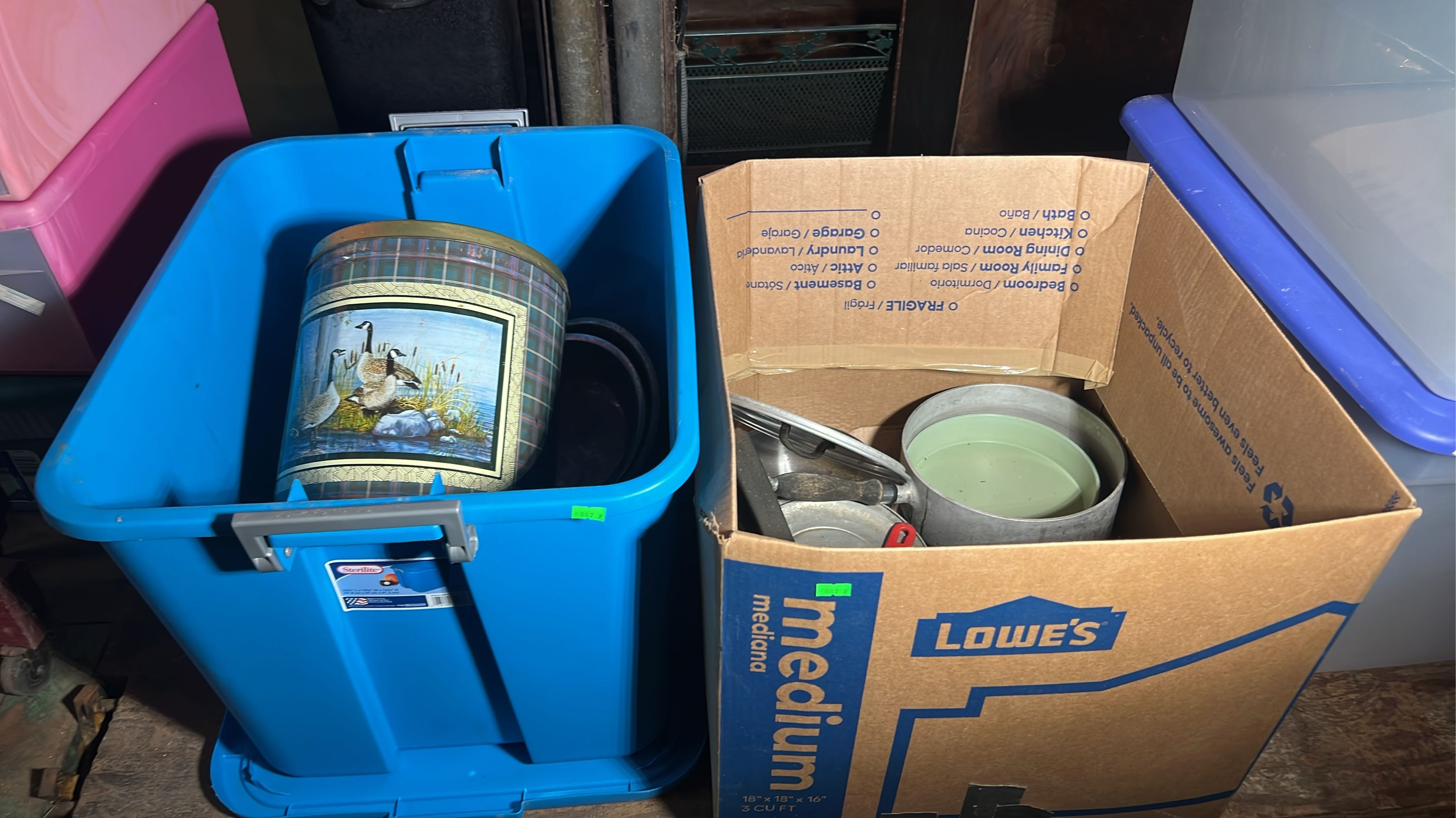 867 Pots and Pans Assortment , Miracle Gro Evergreen Spikes ,miscellaneous in tote with lid