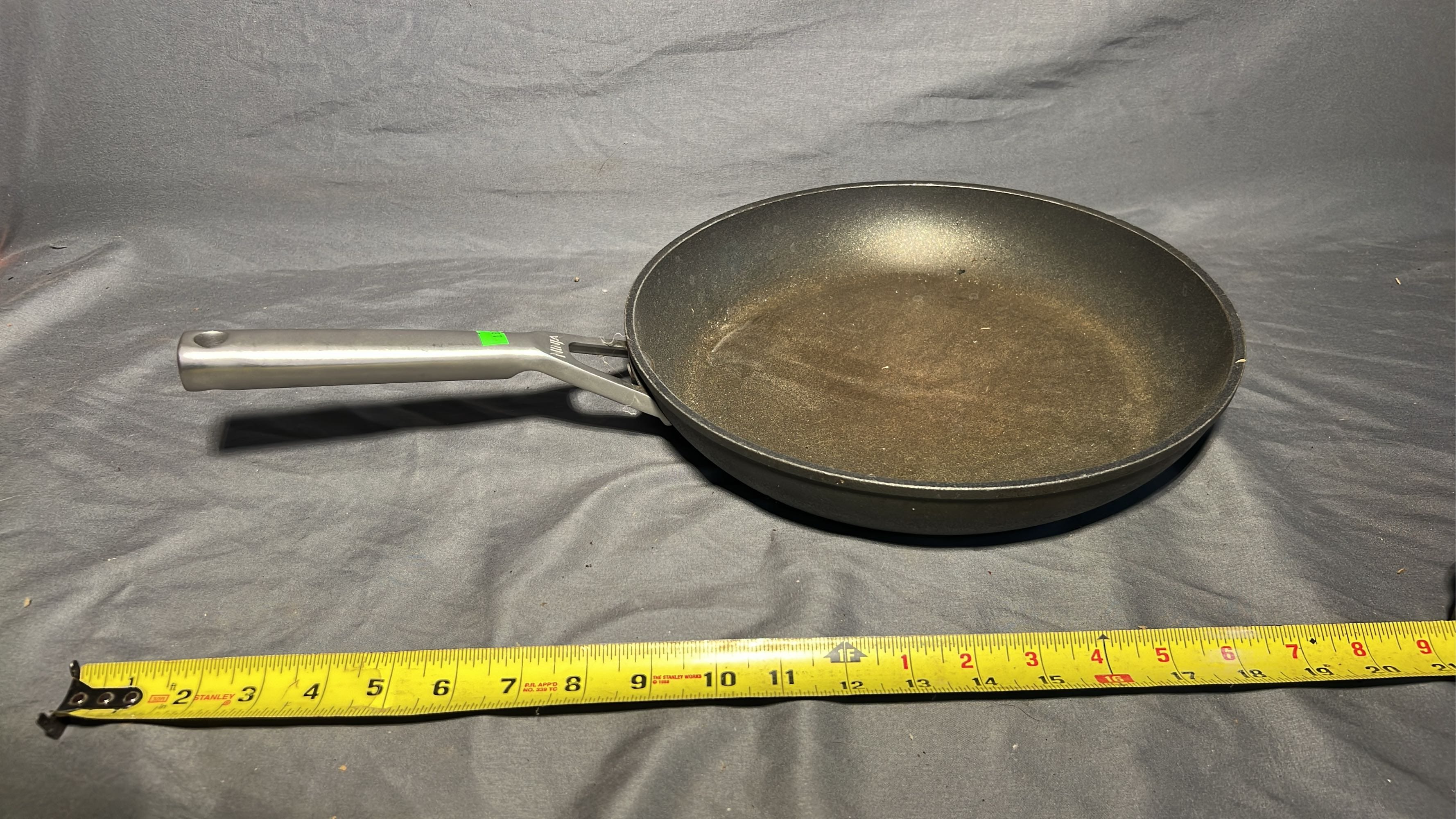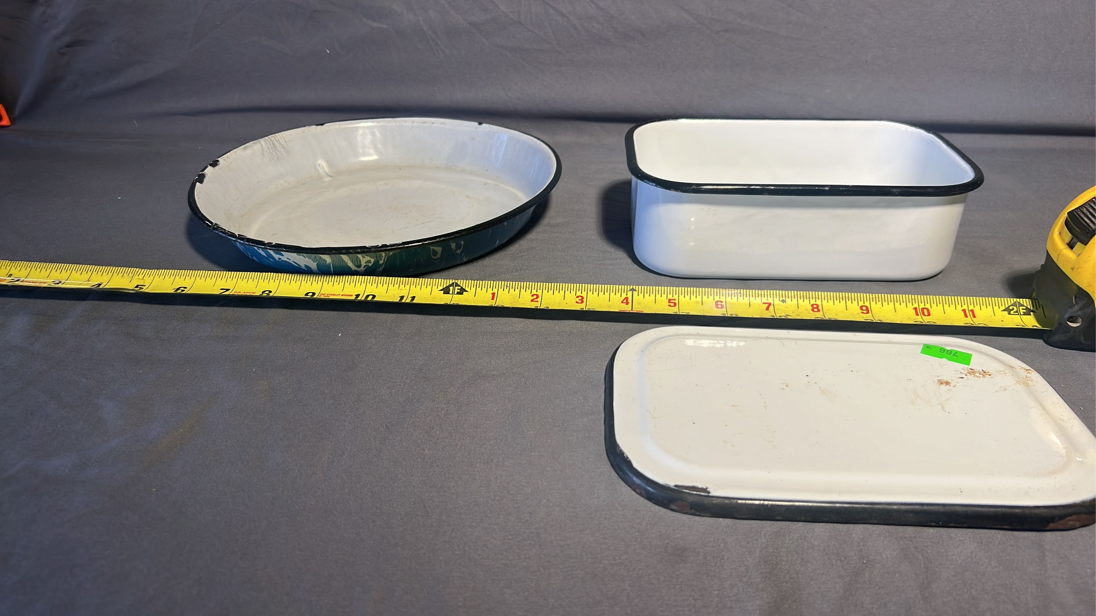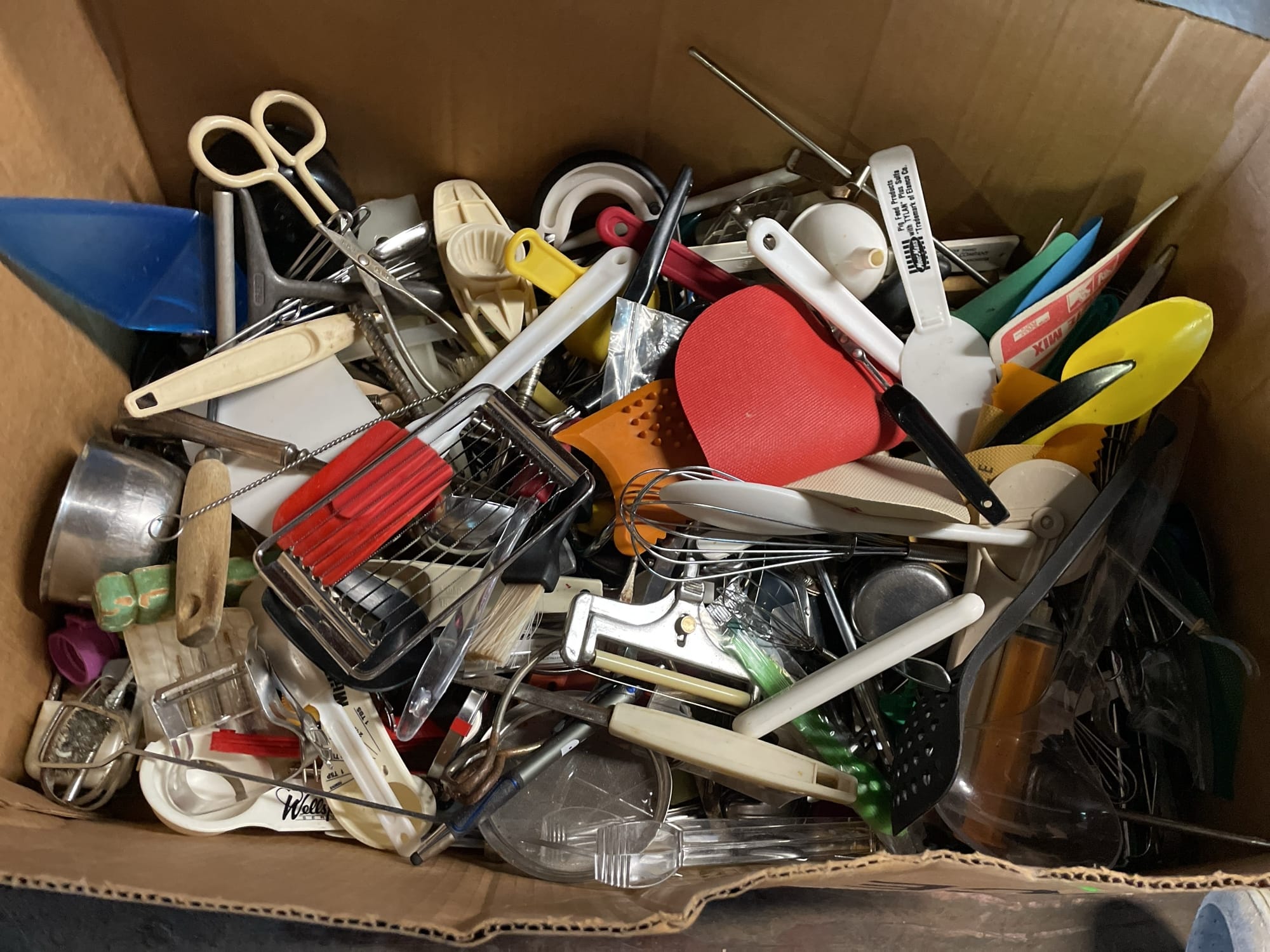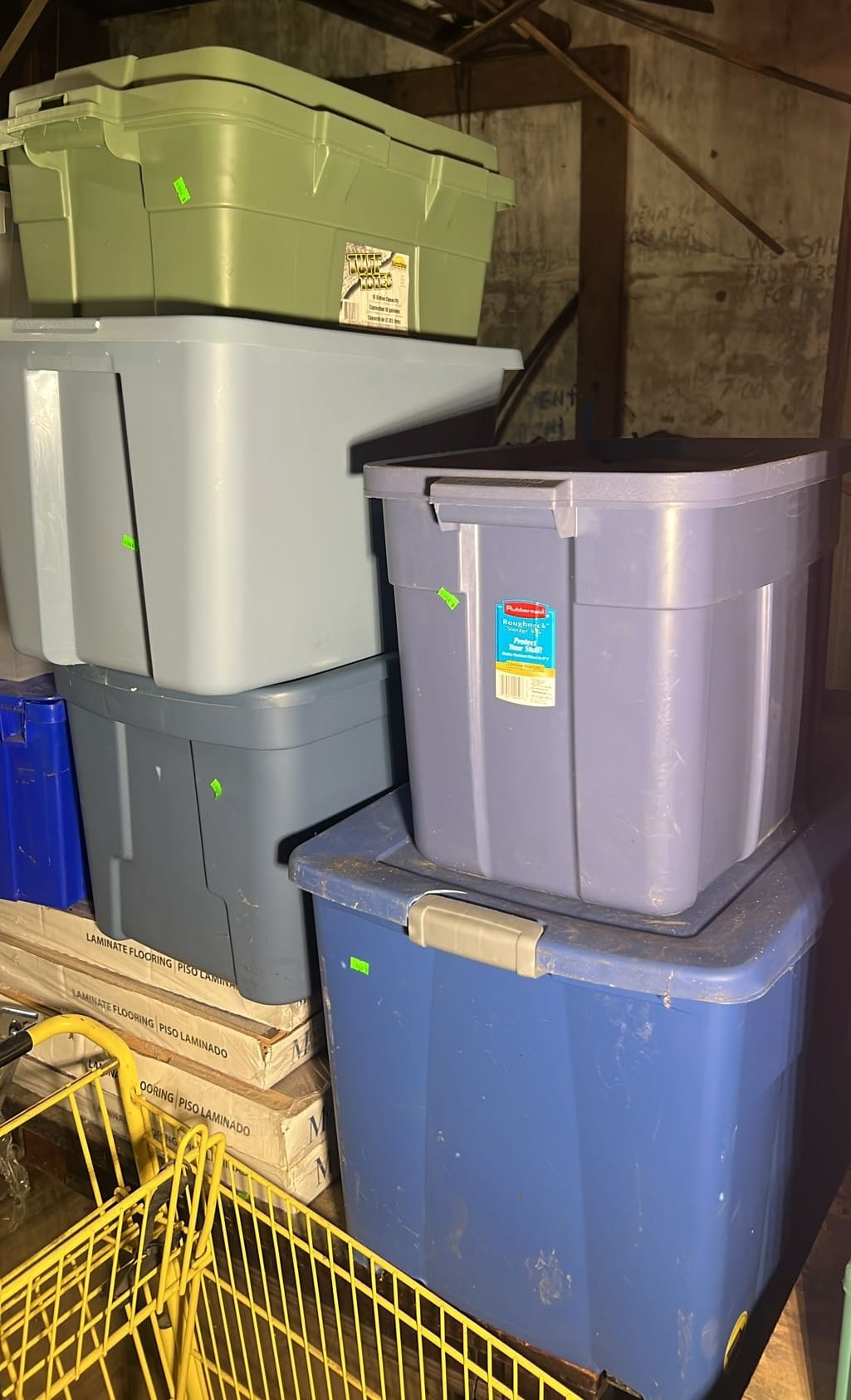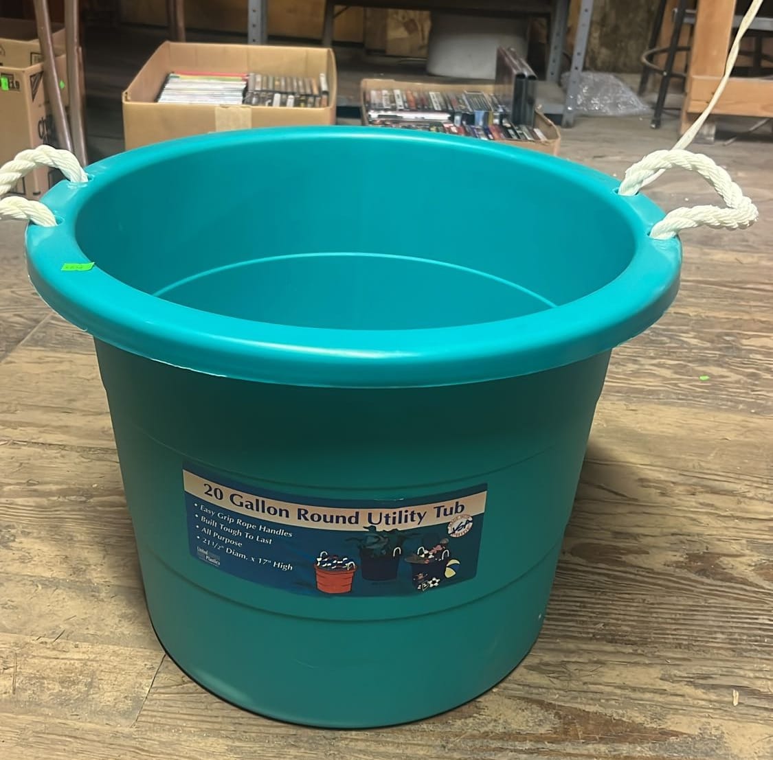 867 Pots and Pans Assortment , Miracle Gro Evergreen Spikes ,miscellaneous in tote with lid