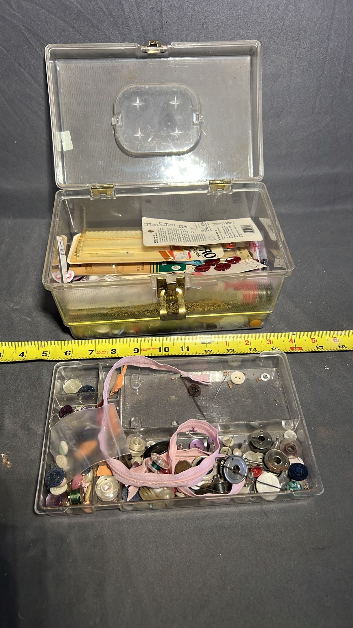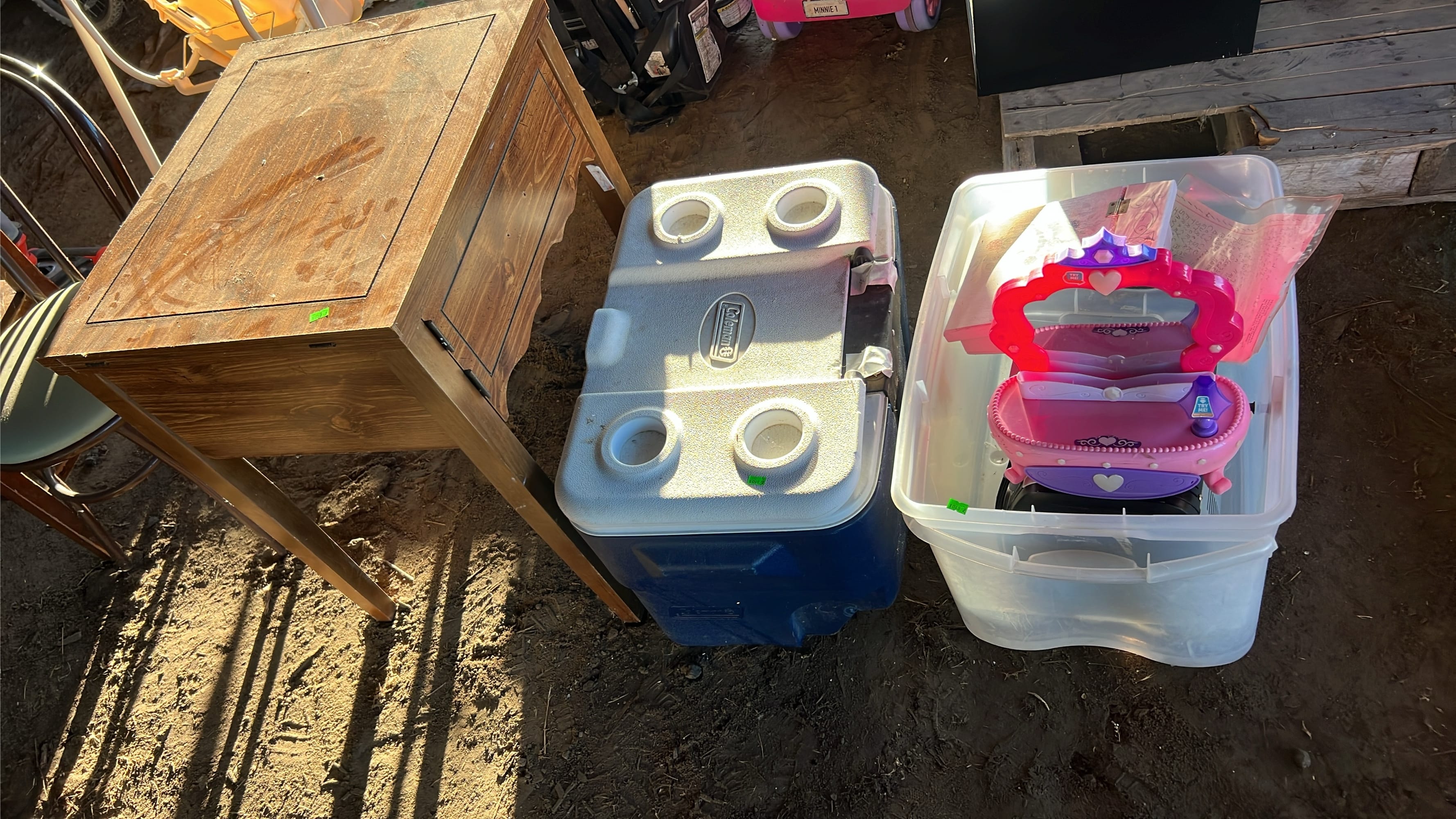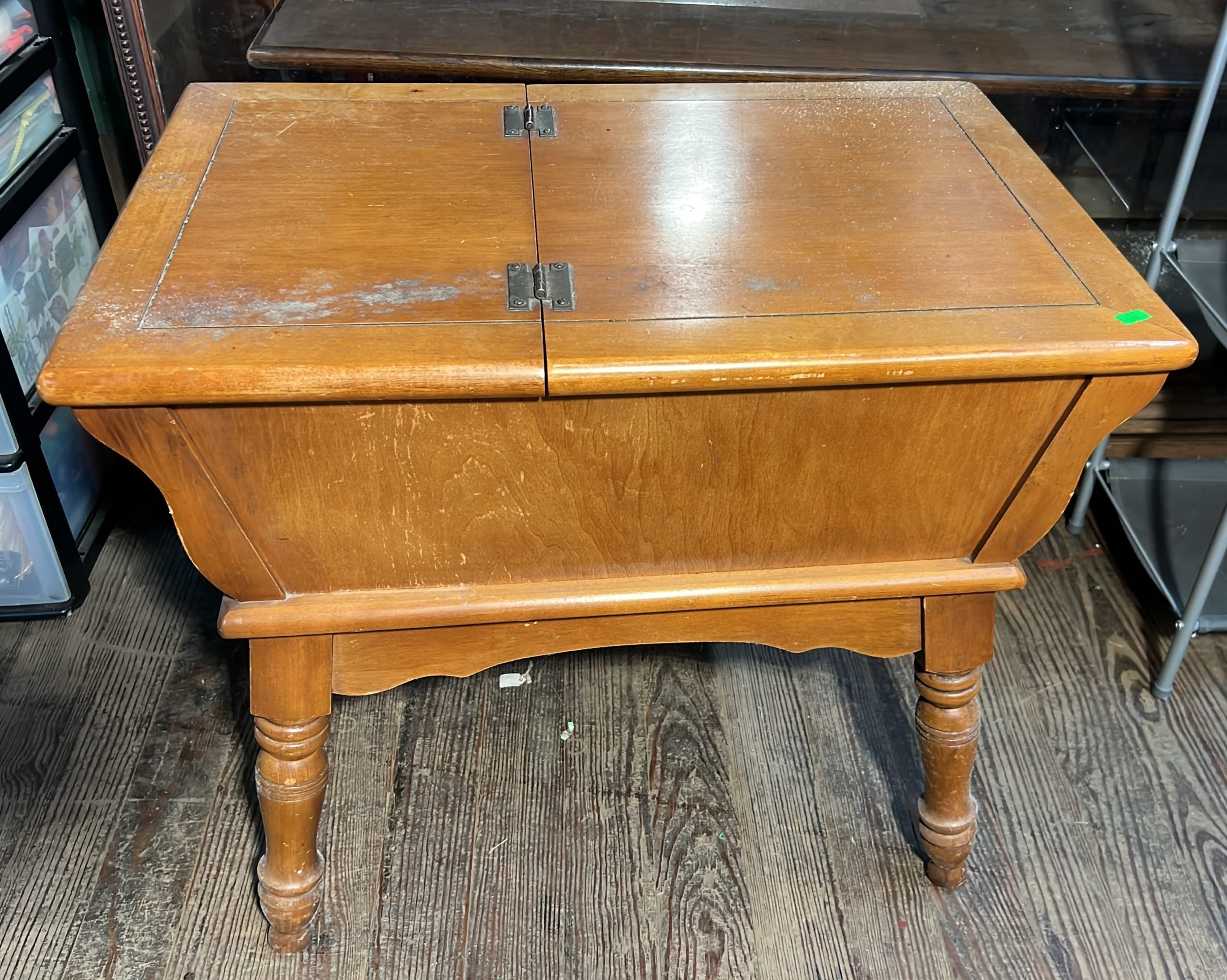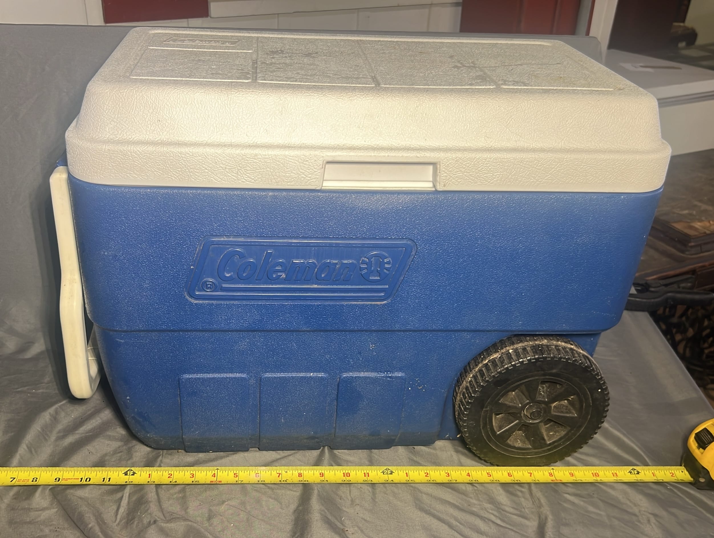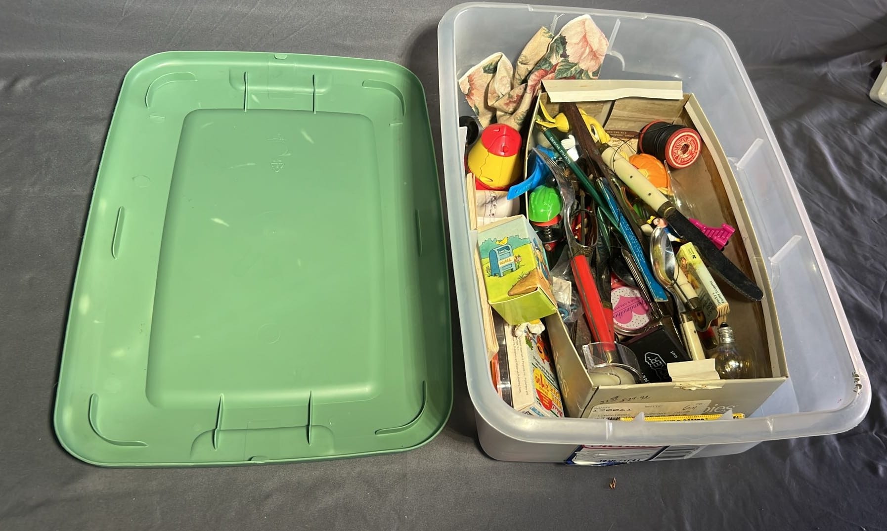 1049 Sewing machine cabinet , 20”x24”x 29”, Coleman Cooler , missing wheels , toaster oven,miscellaneous in 2- totes no lids
