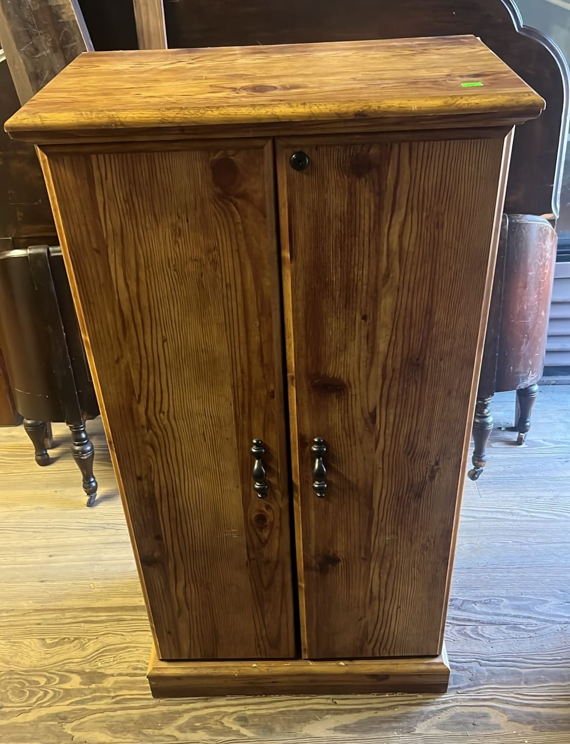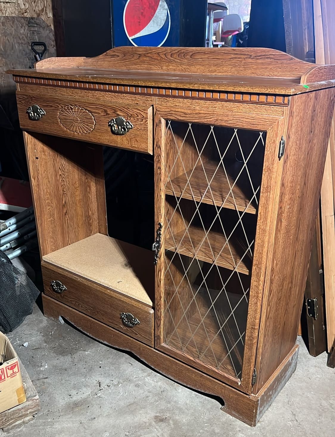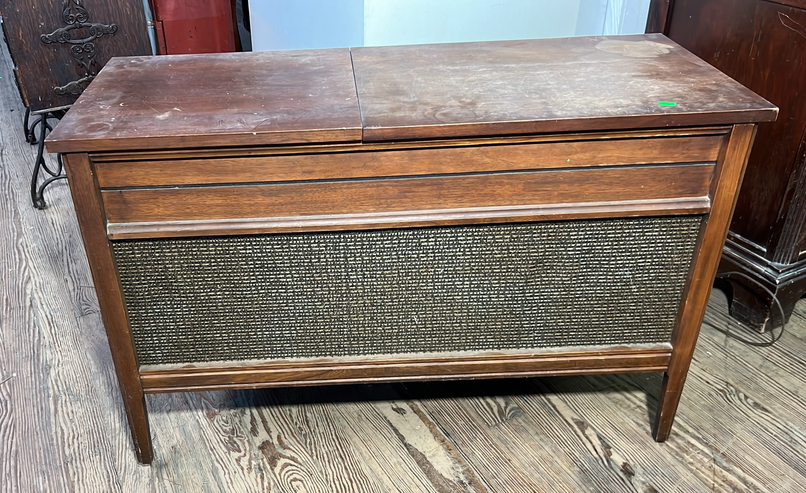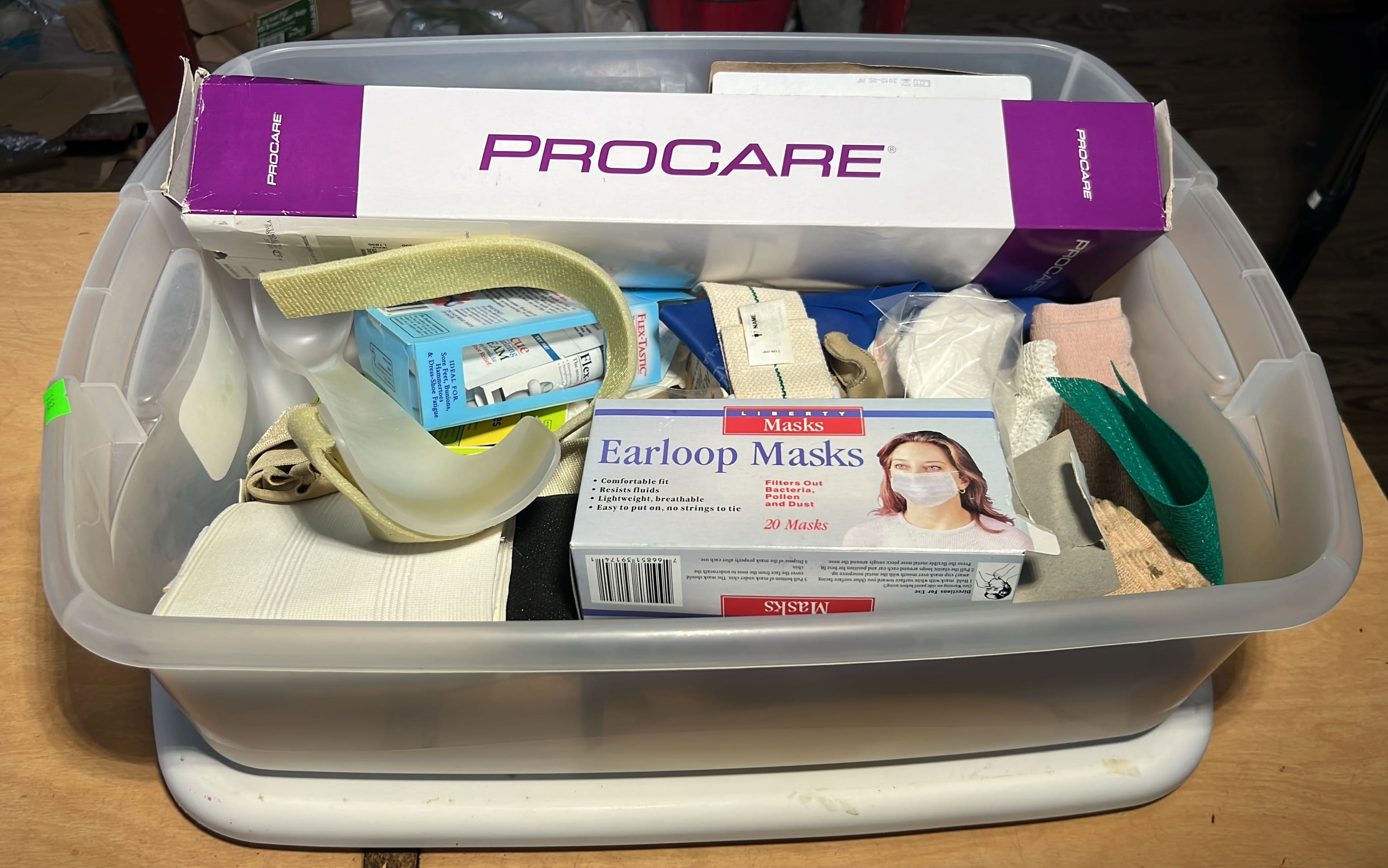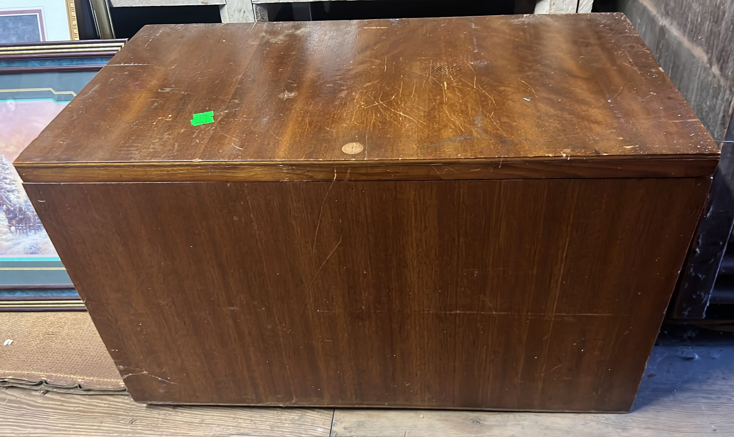 1049 Sewing machine cabinet , 20”x24”x 29”, Coleman Cooler , missing wheels , toaster oven,miscellaneous in 2- totes no lids