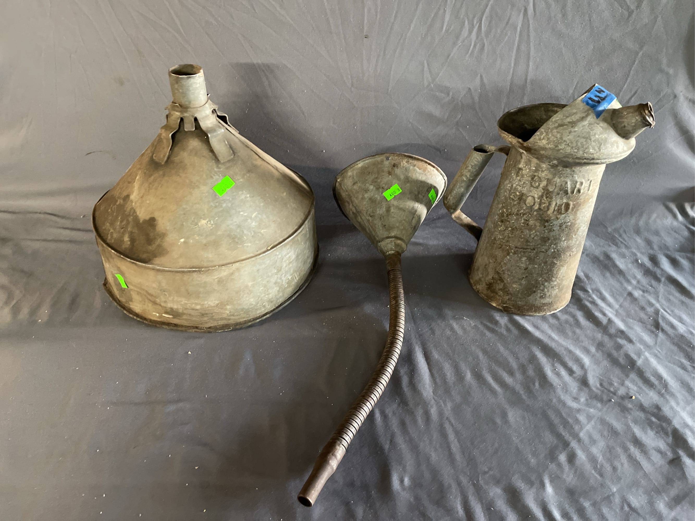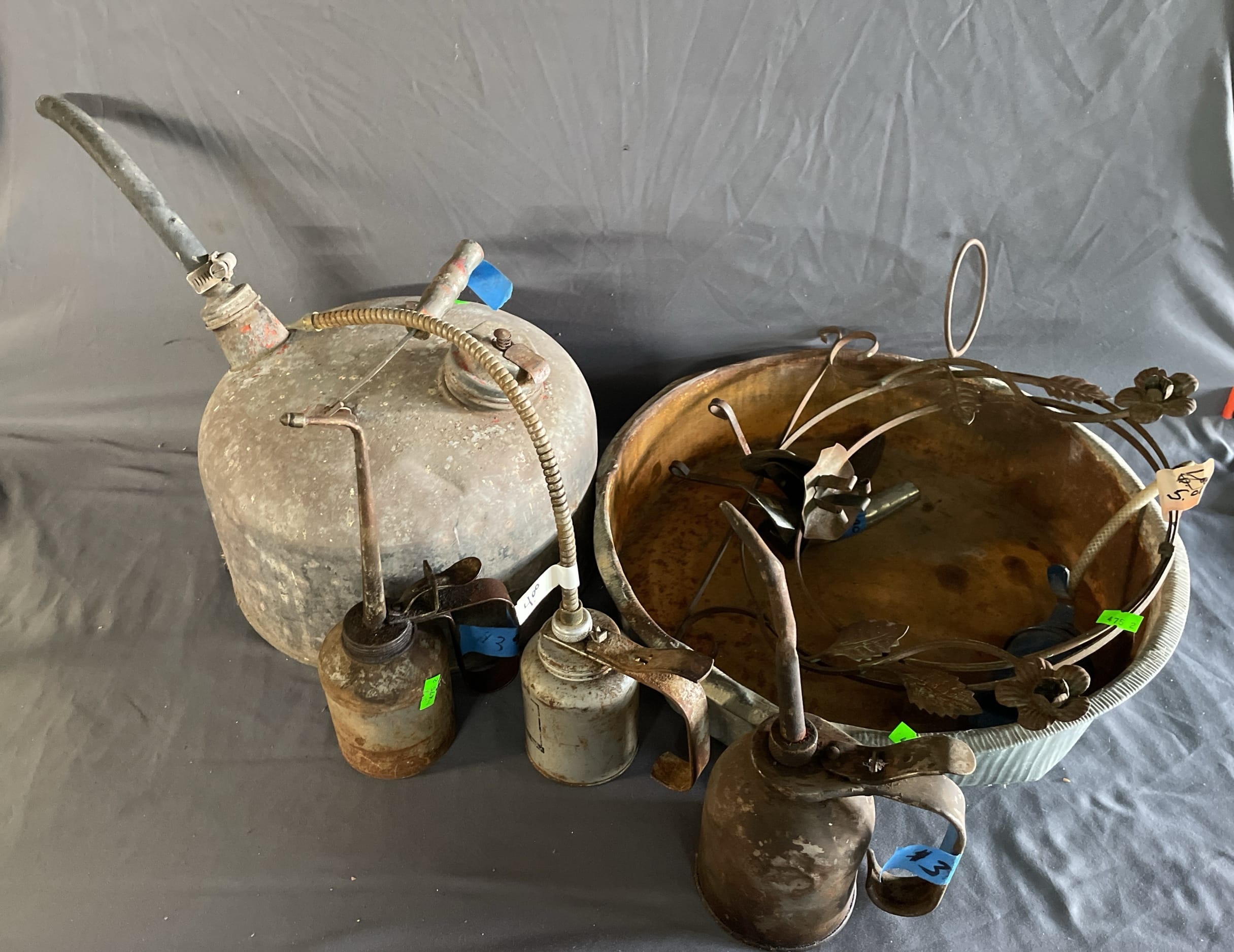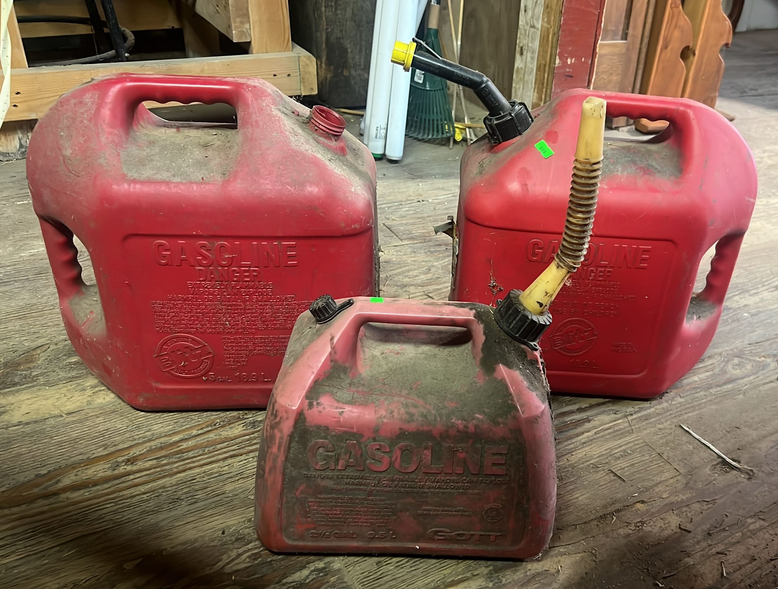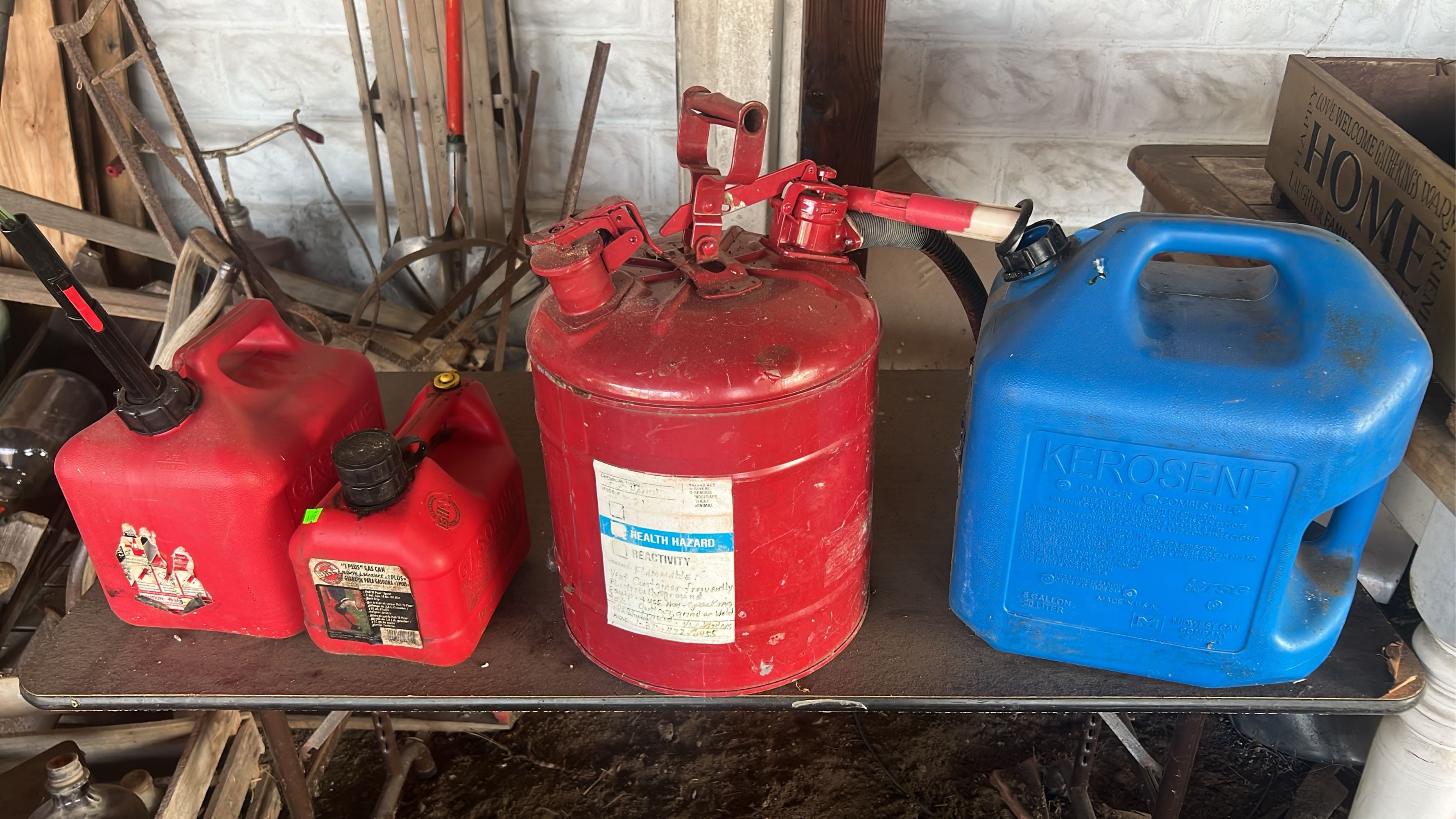1036 Gas Can Assortment 5gal metal safety can , 5gal plastic kerosene can ,spout broke, 1gal ,2.5gal plastic cans