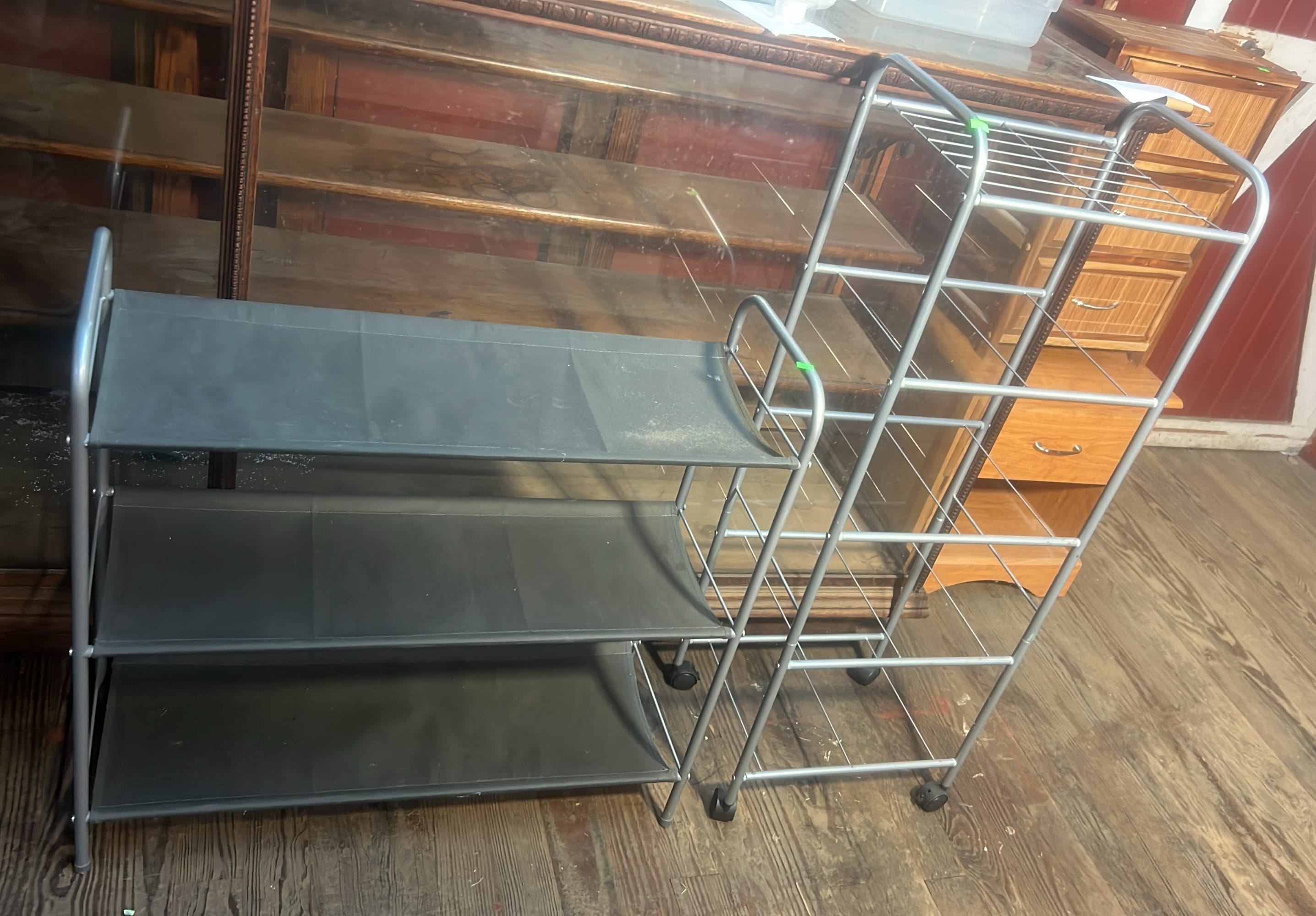 1041 Plastic Shoe Rack on rollers , 8.5”x26”x31”, wall hanging magazine holder , 11.5”x20” x corner Shelf Stand , 36”