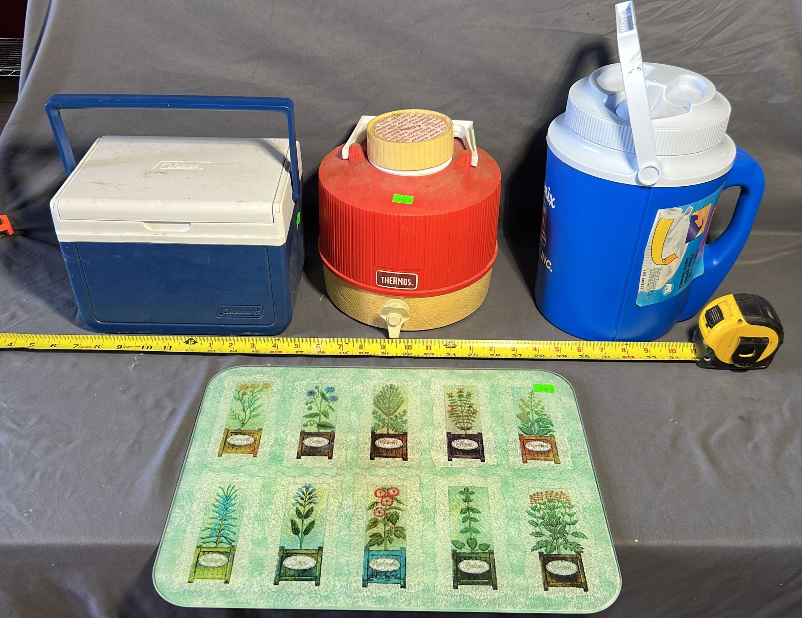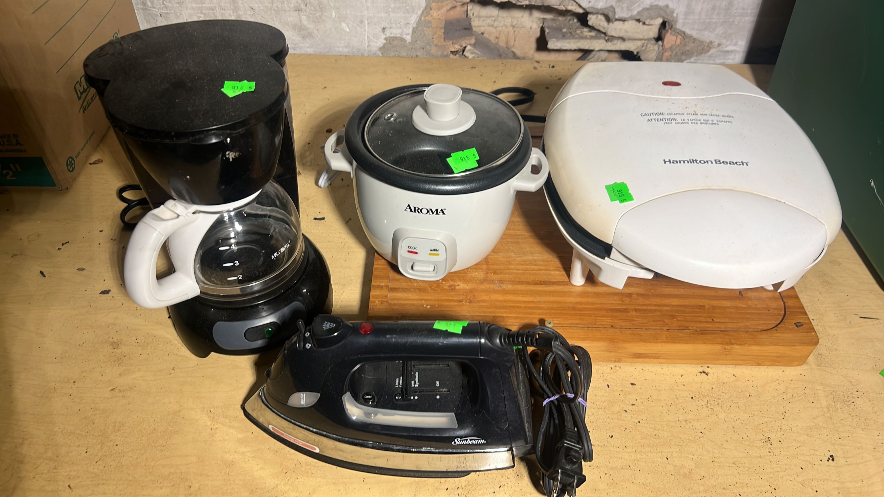 915 Hamilton Beach Grill , Aroma mini Crock Pot , Sunbeam Iron , Mr Coffee Coffee maker , wood cutting board