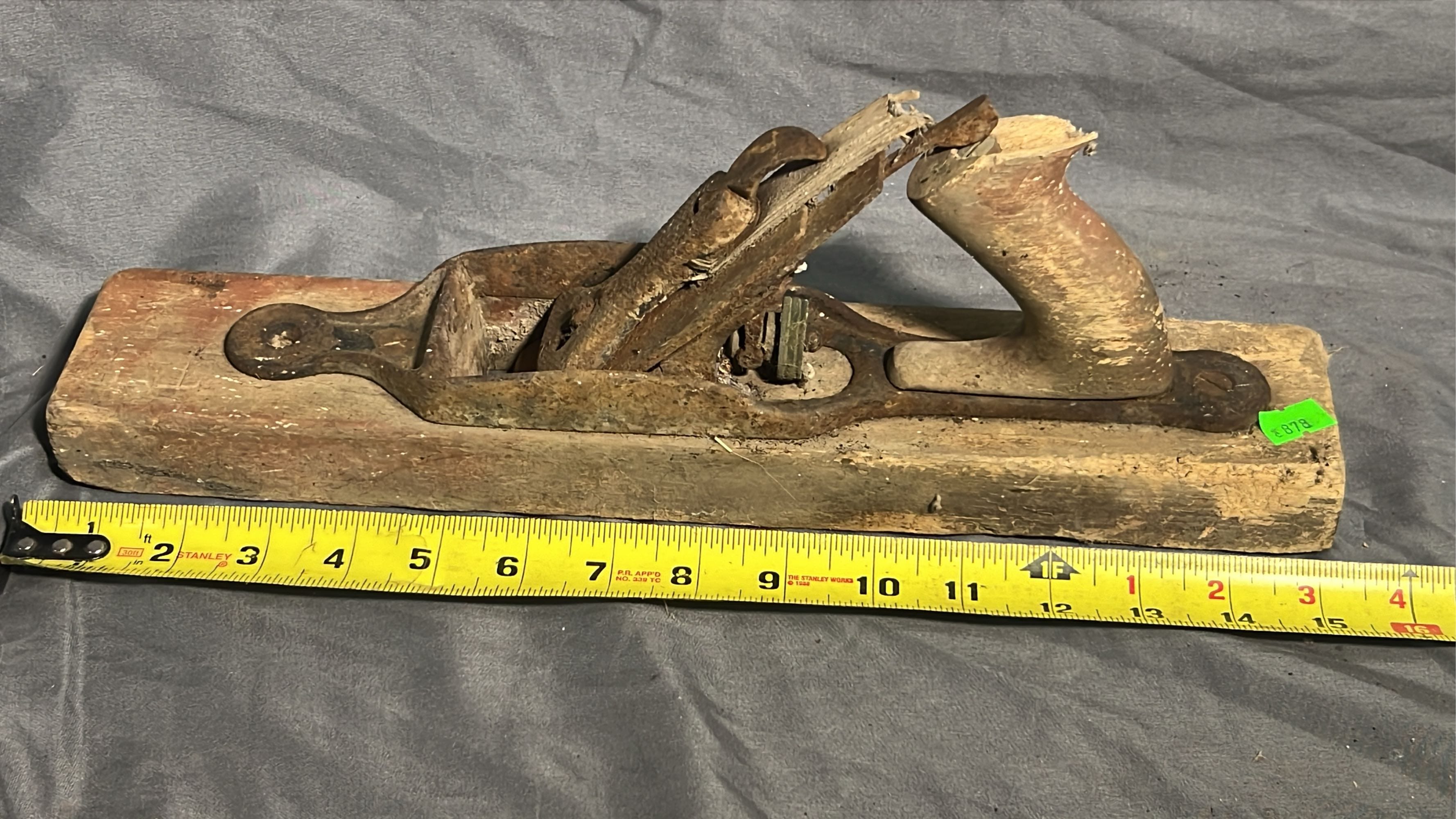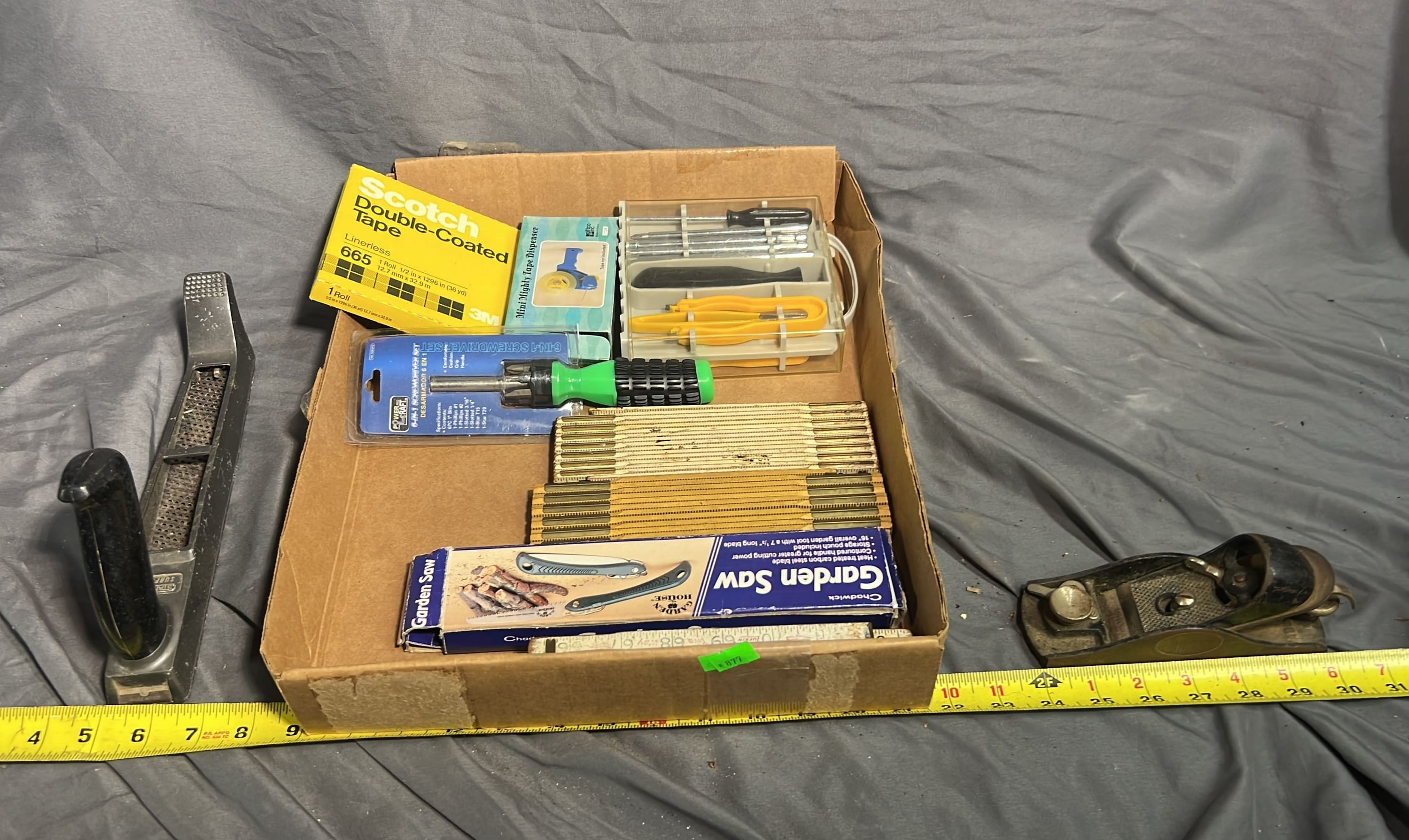 877 Metal plane 6”, folding wood Rulers . Rasp , garden saw , miscellaneous