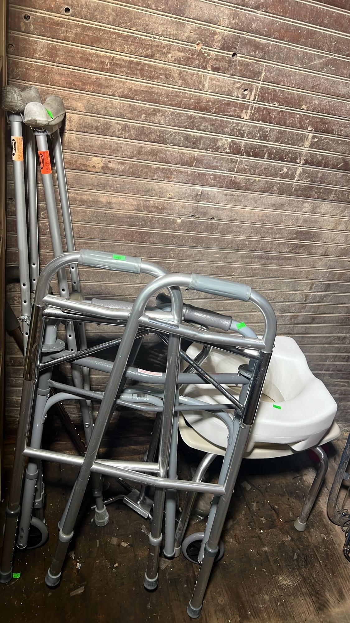 885 2- folding Walkers , crutches , shower seat , raised toilet seat