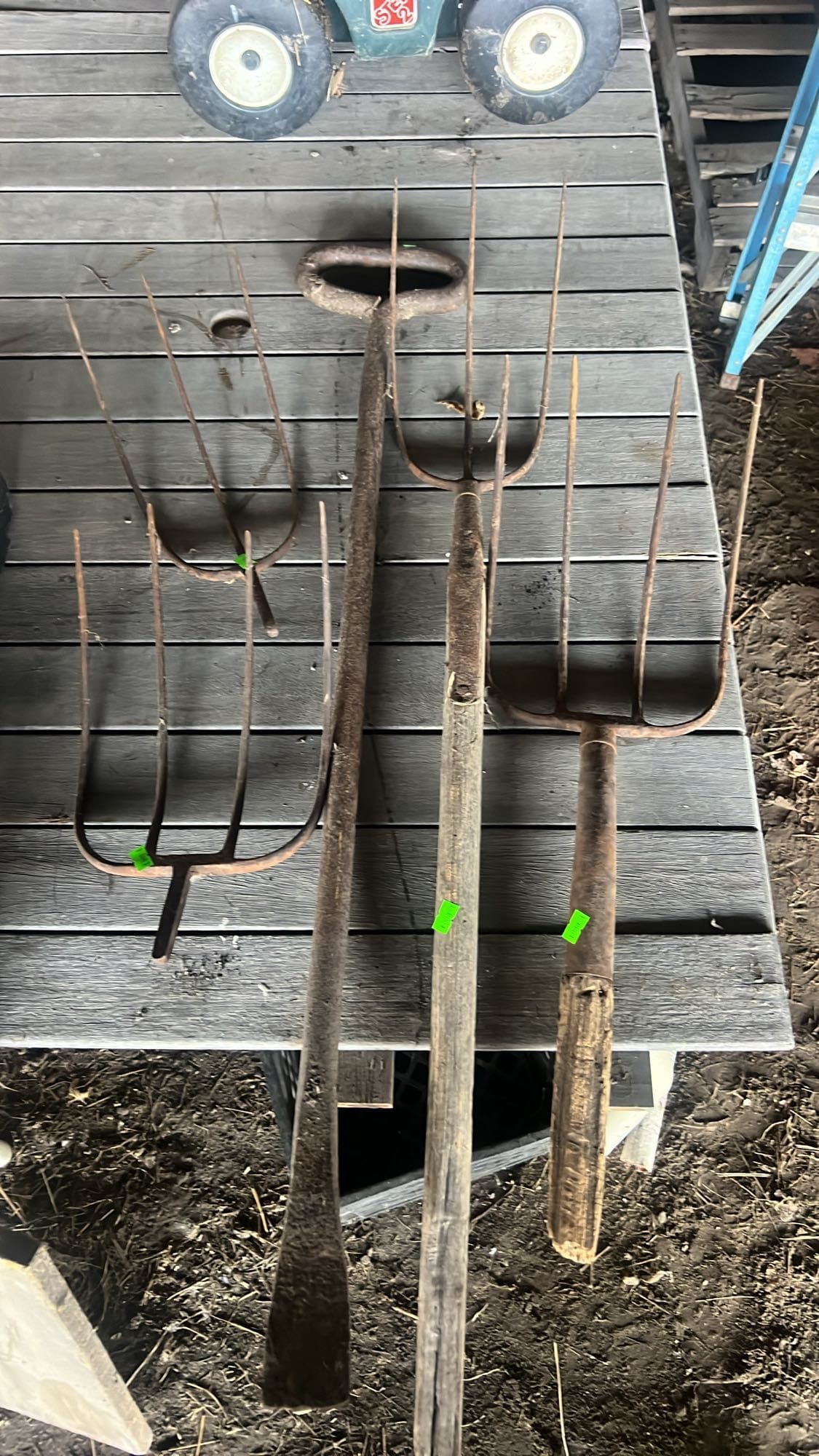 1000 4- pitchfork heads , 2- 3tine ,2- 4tine , prybar , 40”
