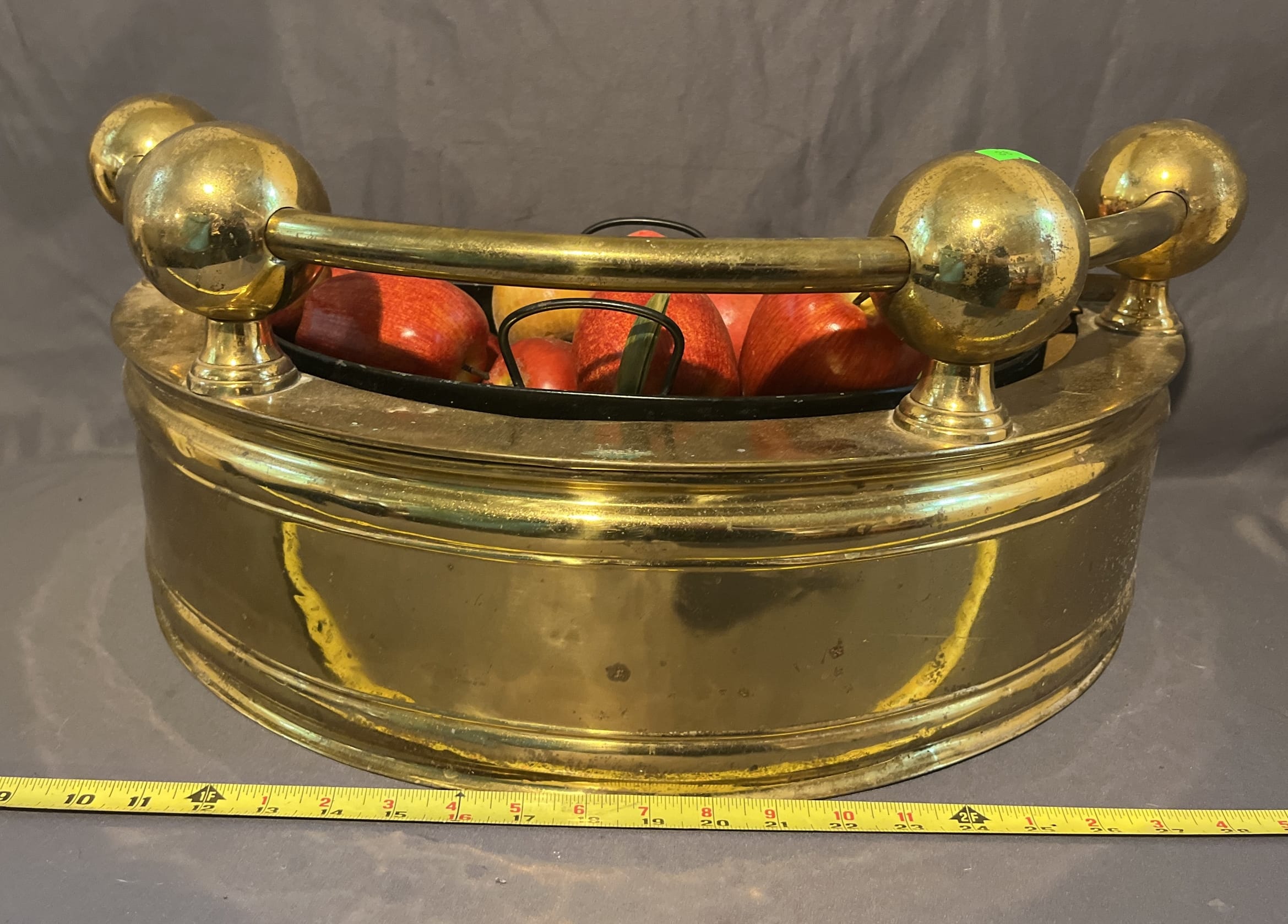 36 Brass planter half round with faux apples, tin insert 23x12x10"