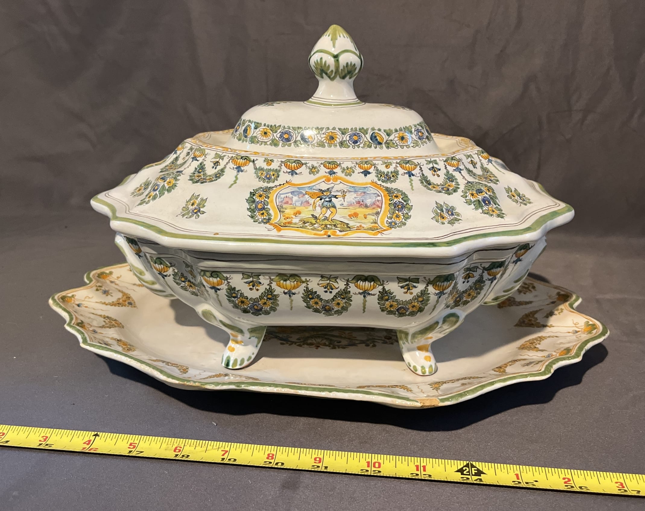 51 Moustiers J French covered dish 12x9" and platter 16x11" - some chips