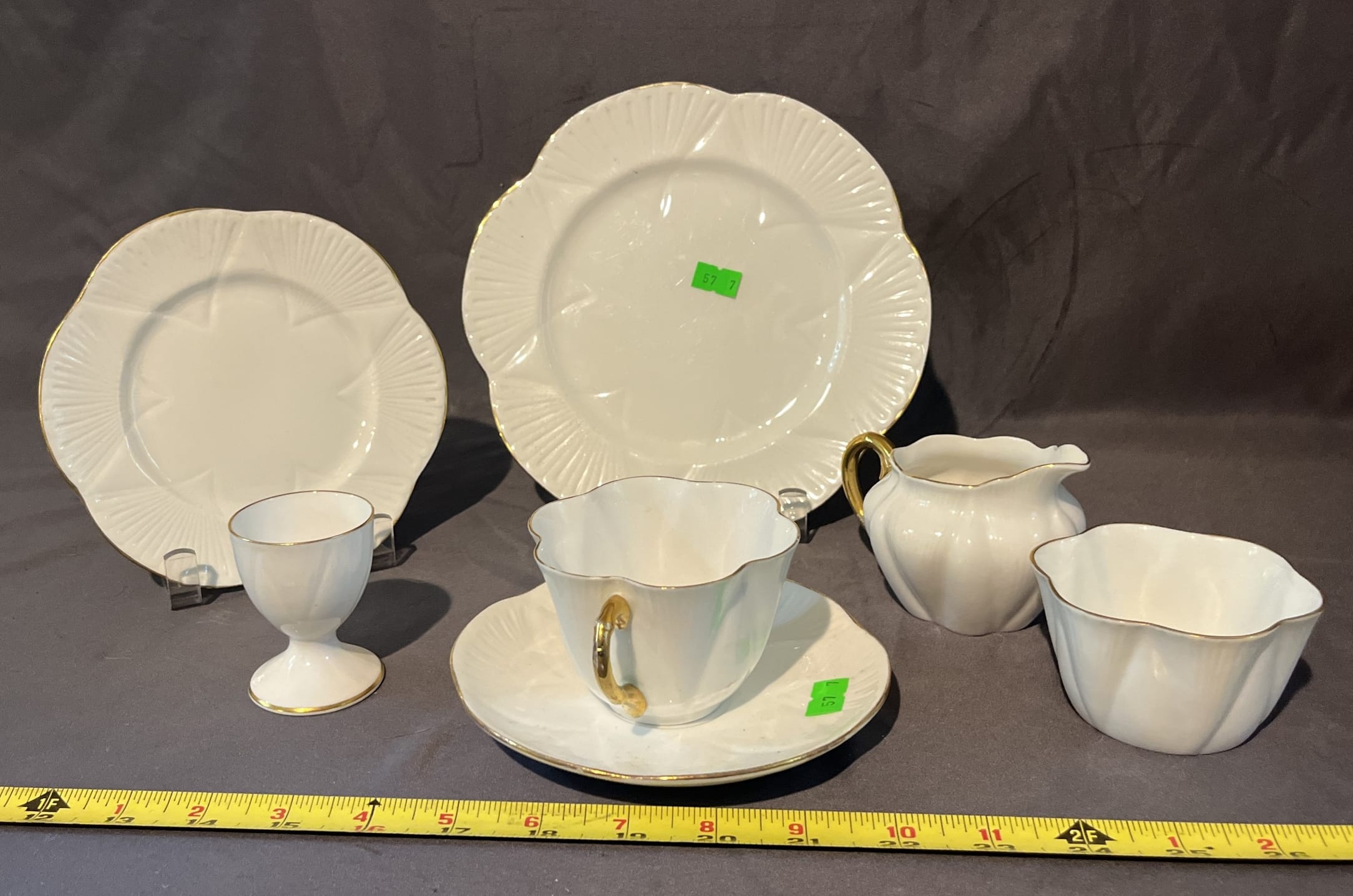 57 7pc Shelley Breakfast Set English Bone China Dishes inc. Cream & Sugar, Tea cup & Saucer, Plates, Egg Cup