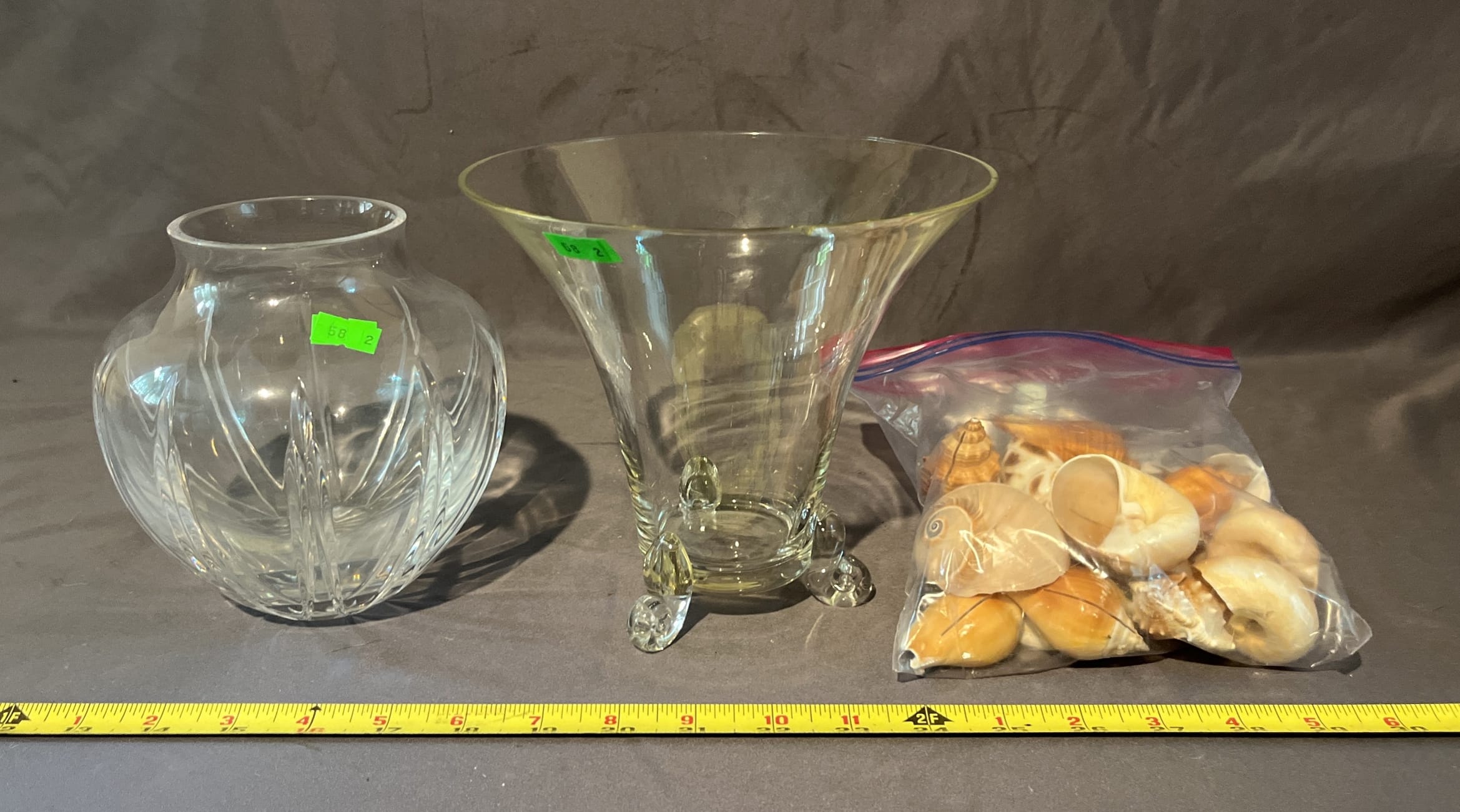 58 Glass Footed Vase 7", Cut Glass Vase 6”, Shell Assortment