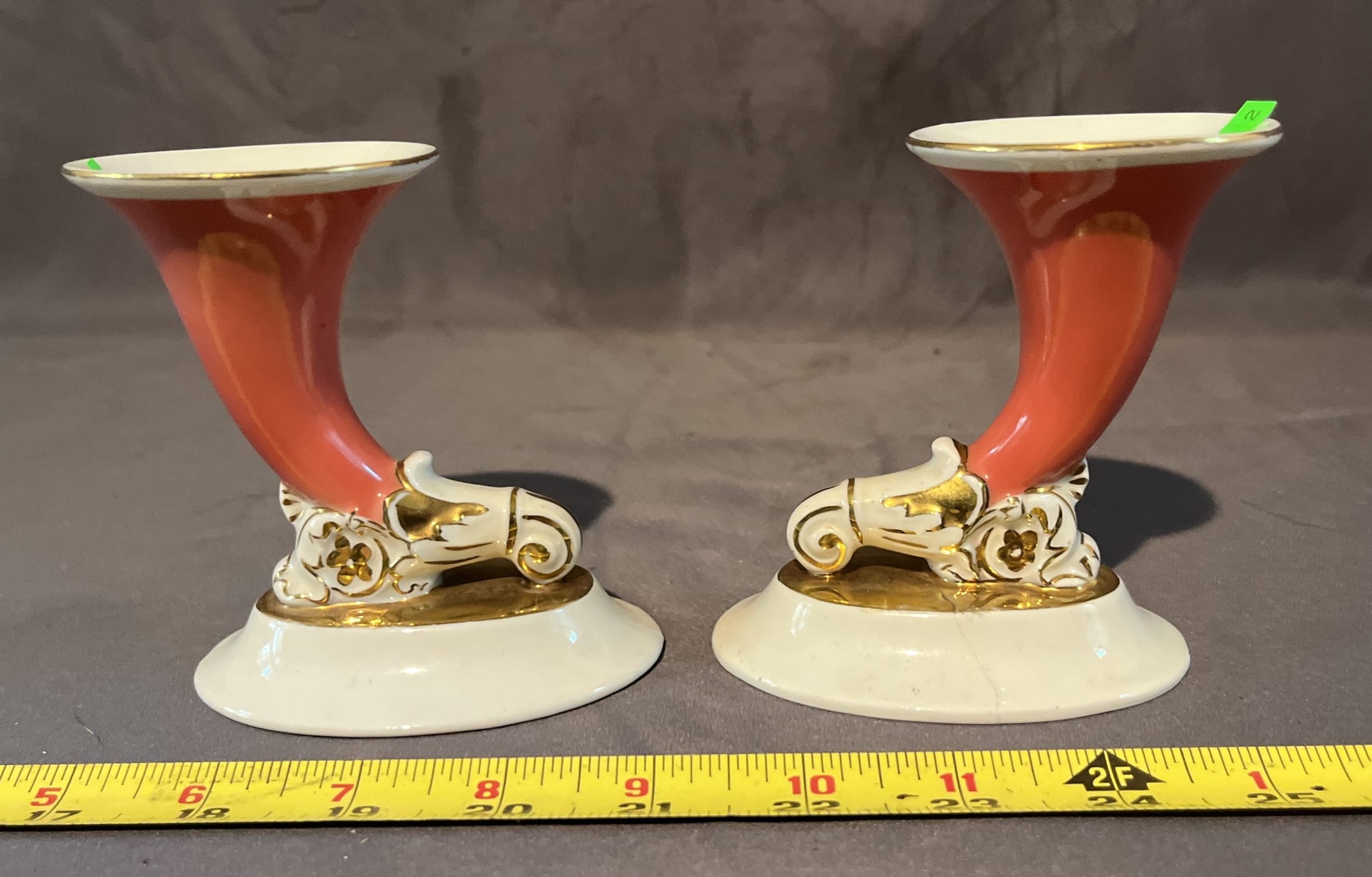 68 Pair Czechsolvkia porcelain horn vases - one has been repaired 5"