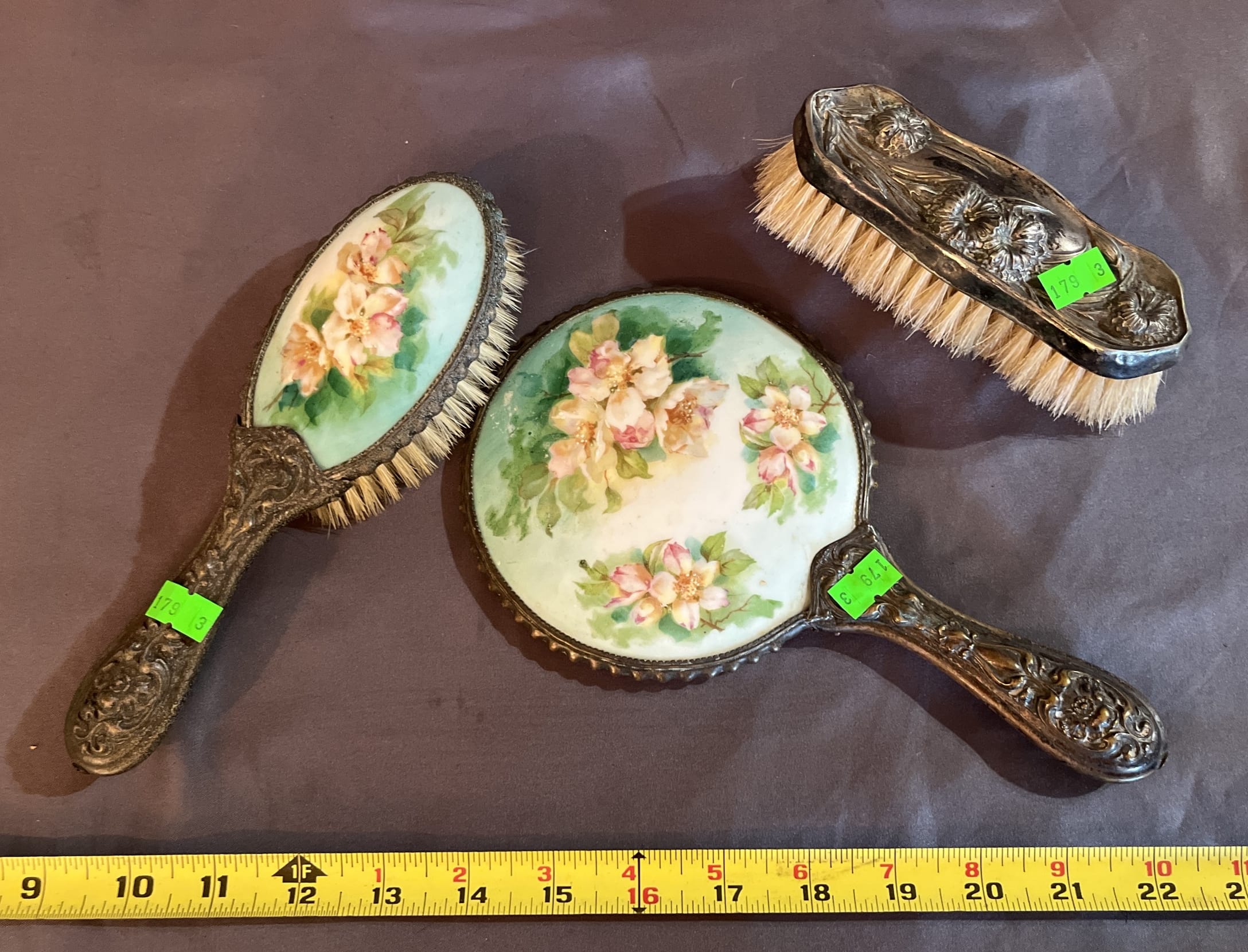 179 Dresser pieces quadruple plate inc. brush and hand mirror with porcelain backs