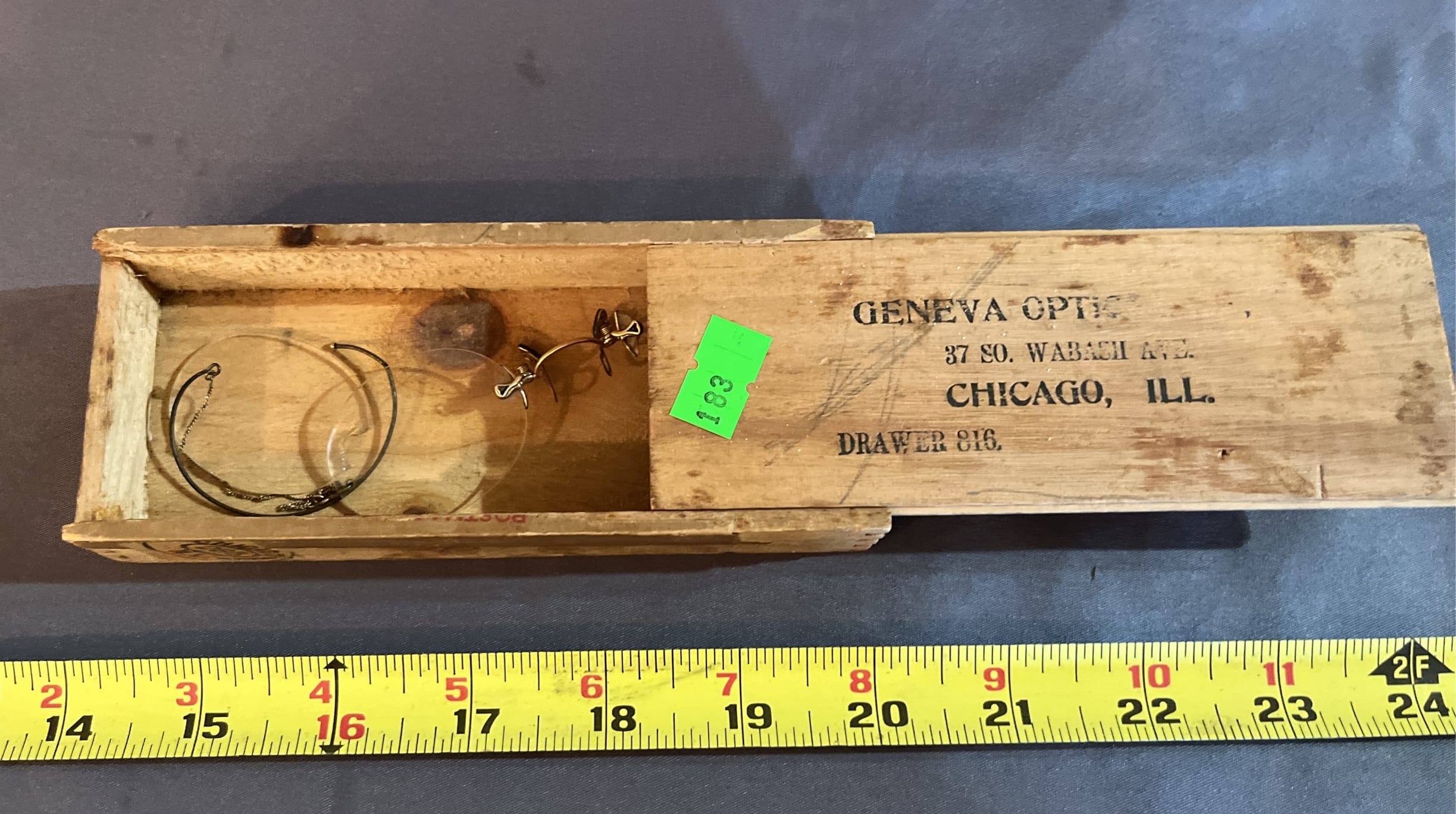 183 Geneva optic wood box with spectacles - needs repair 2.5x6"
