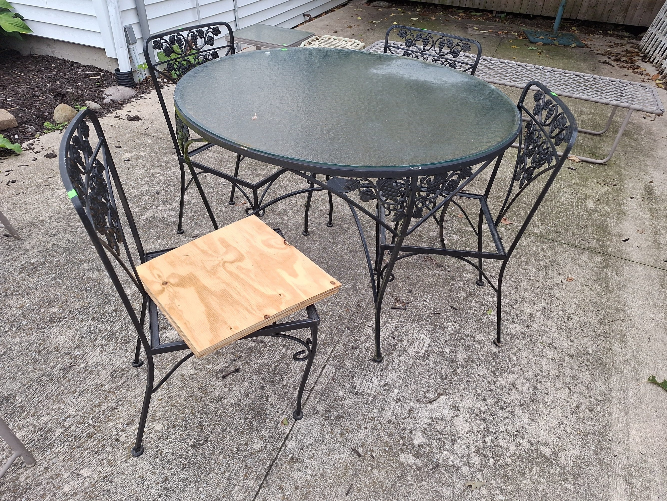 208 Wrought iron patio set table 42x29", four chairs with plywood cutouts - ready to add your own upholstery