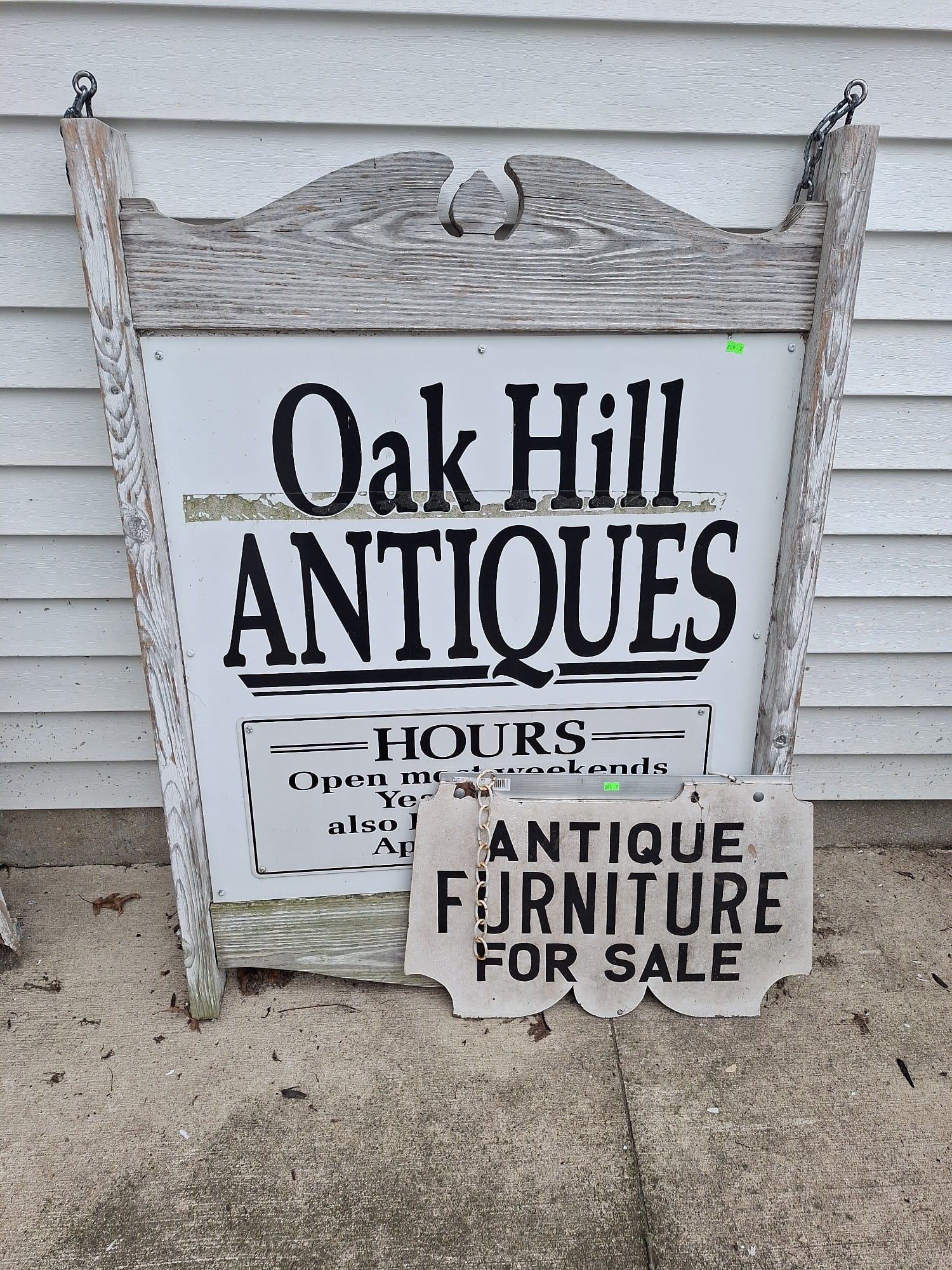 209 2 Antiques signs - wood with decals 22x15", aluminum in wood frame 34x46"