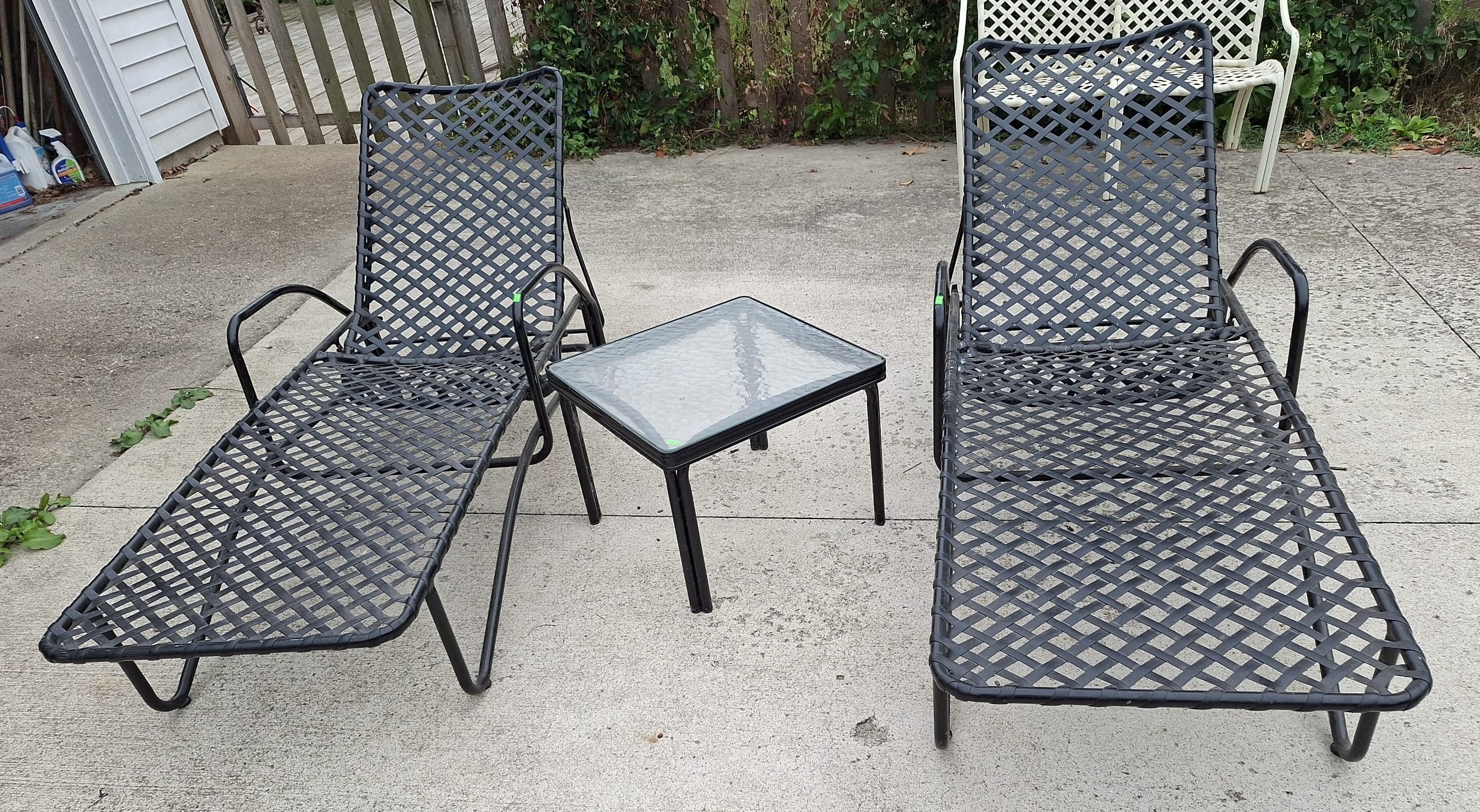 210 2 Tamiami Patio lounges and side table 20.5x20.5x15" Black, restored 24x60"