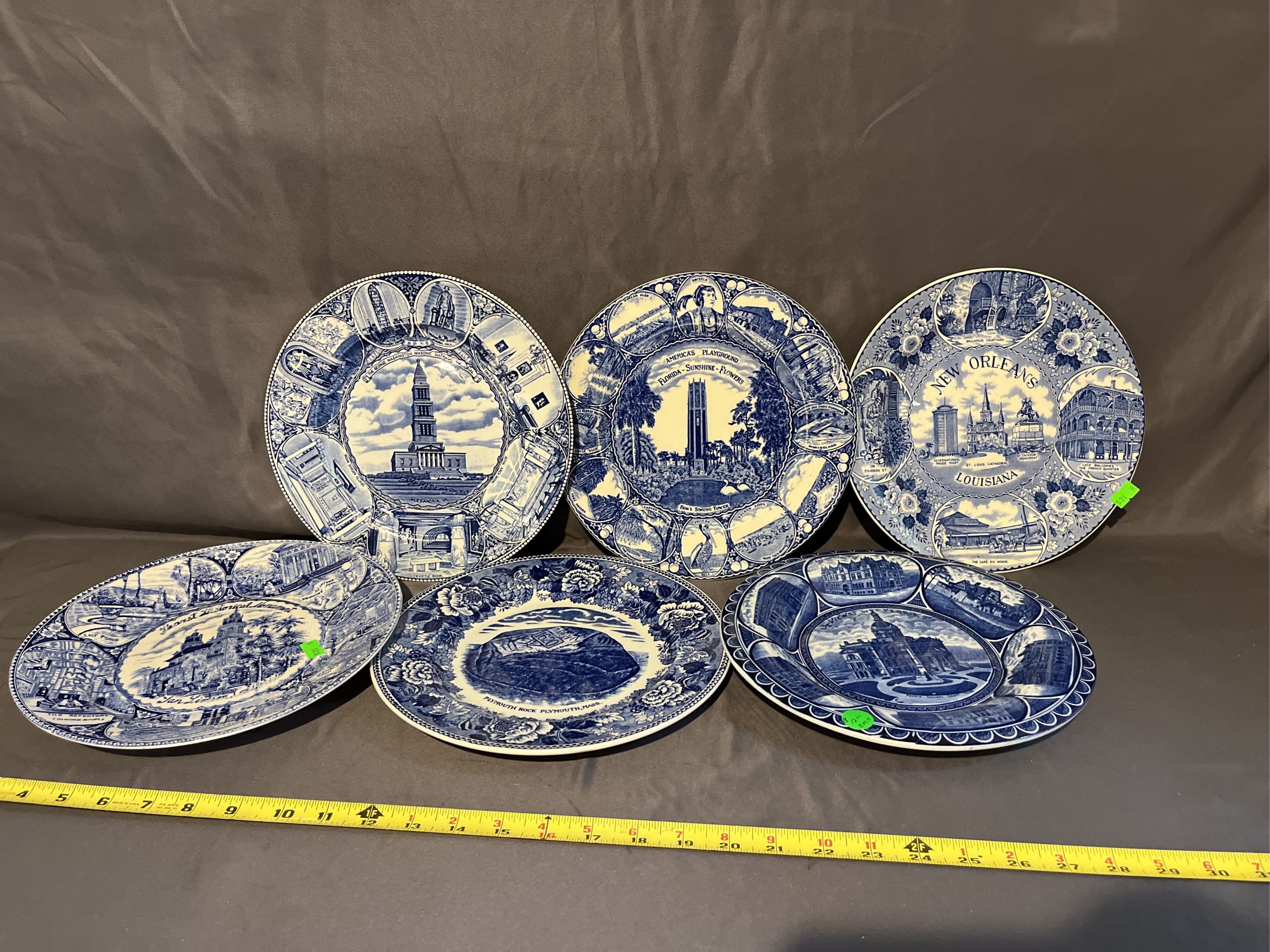 531 Souvenir transferware plates 6ct, Plymouth rock, Peoria, Florida, new Orleans ect.