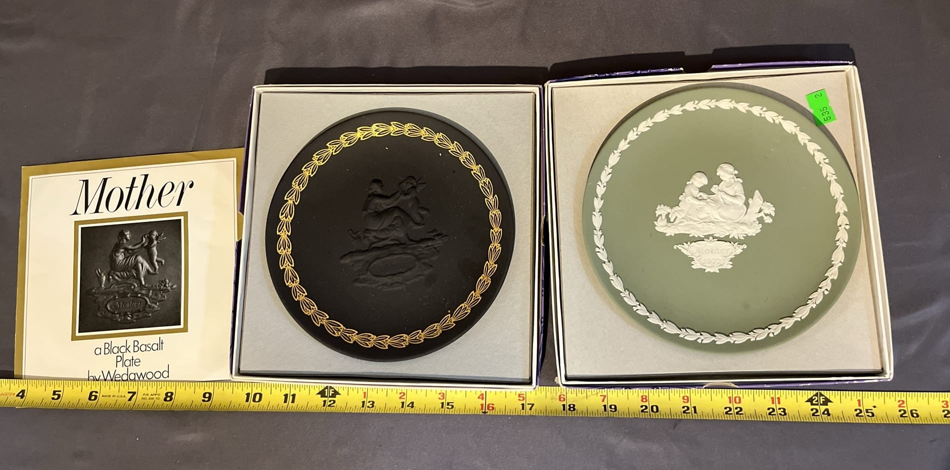 535 2- Wedgewood Mother's day plates, jasper sage Green 1972 and Black basalt 1971 plates, 6.5" each