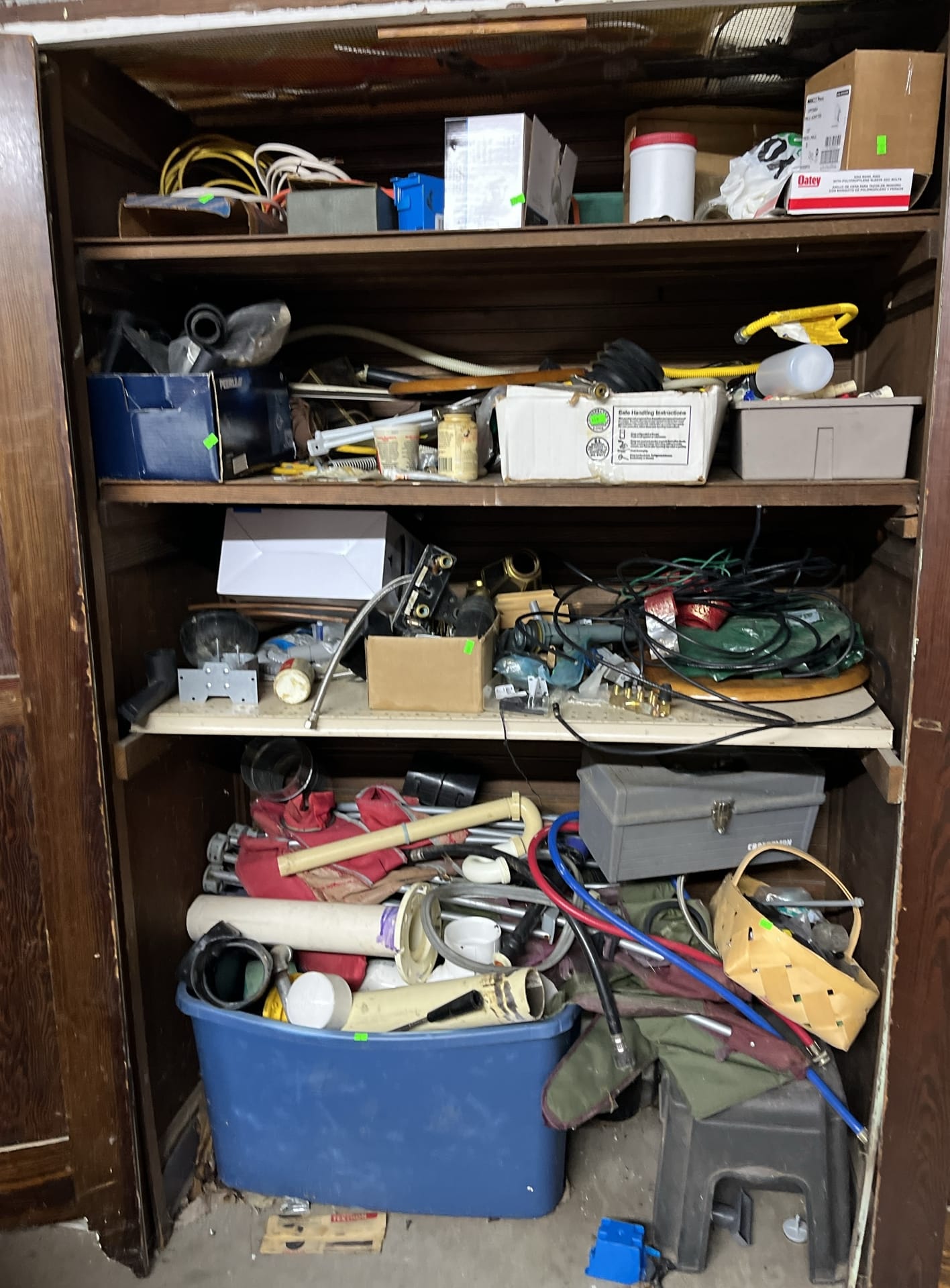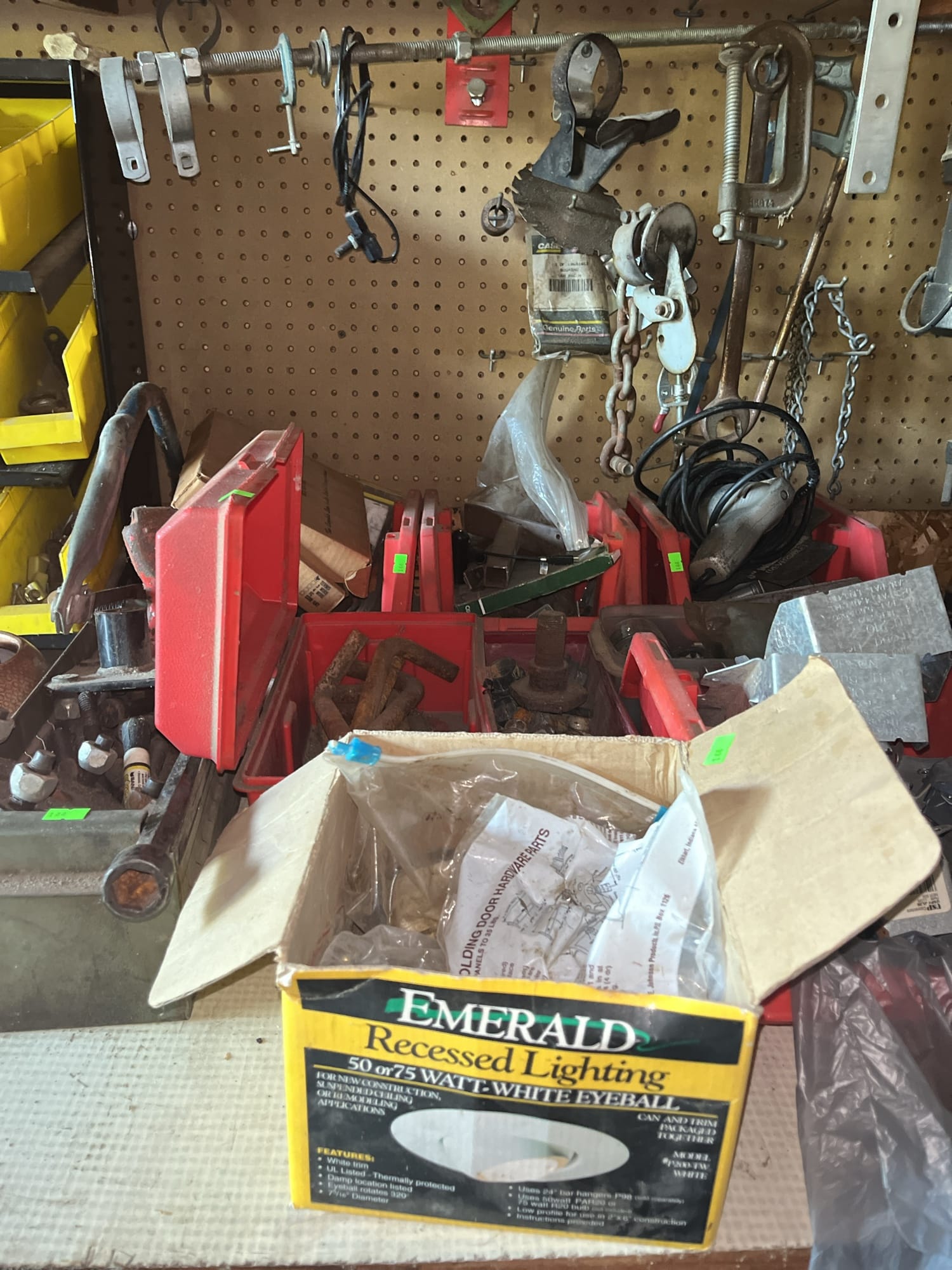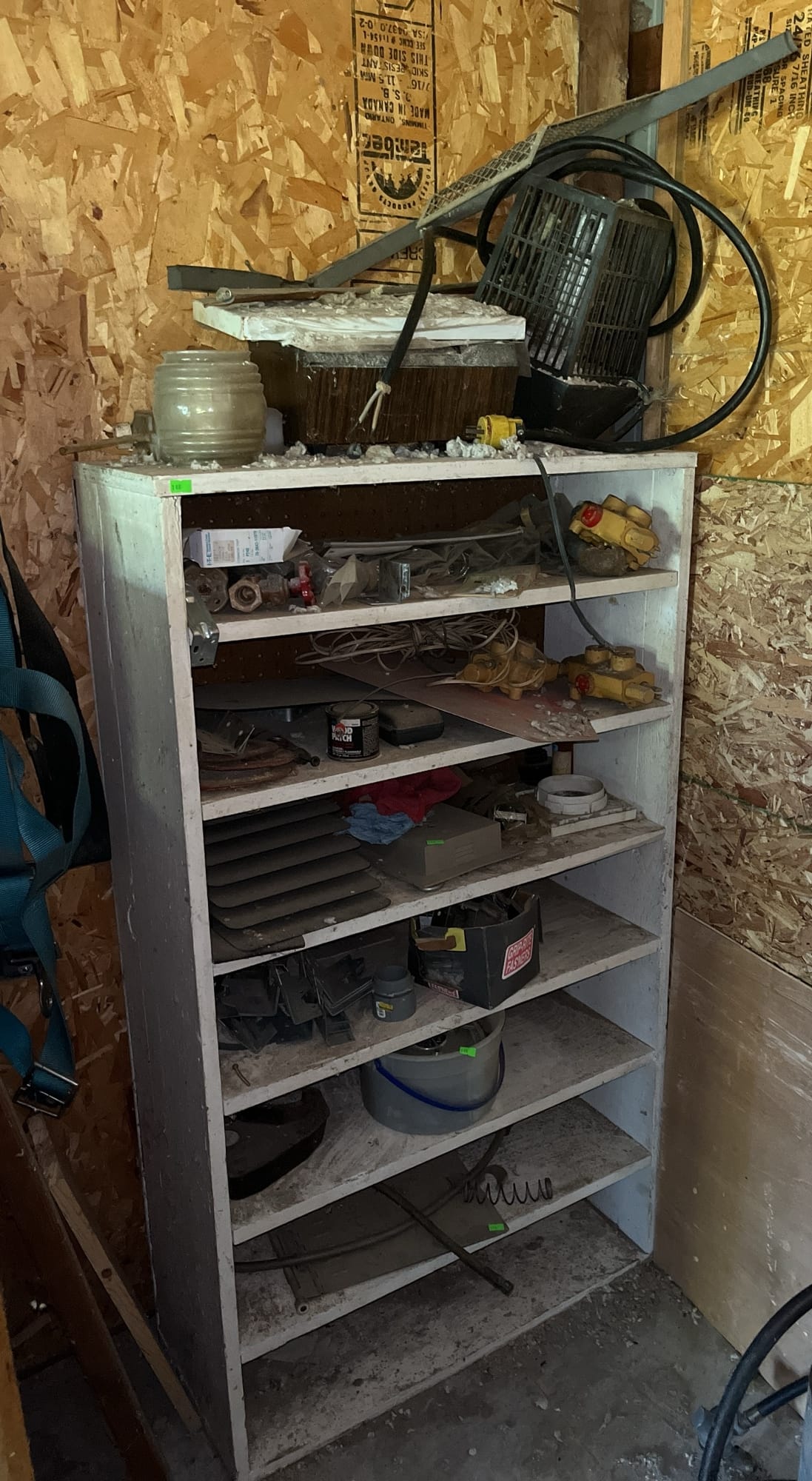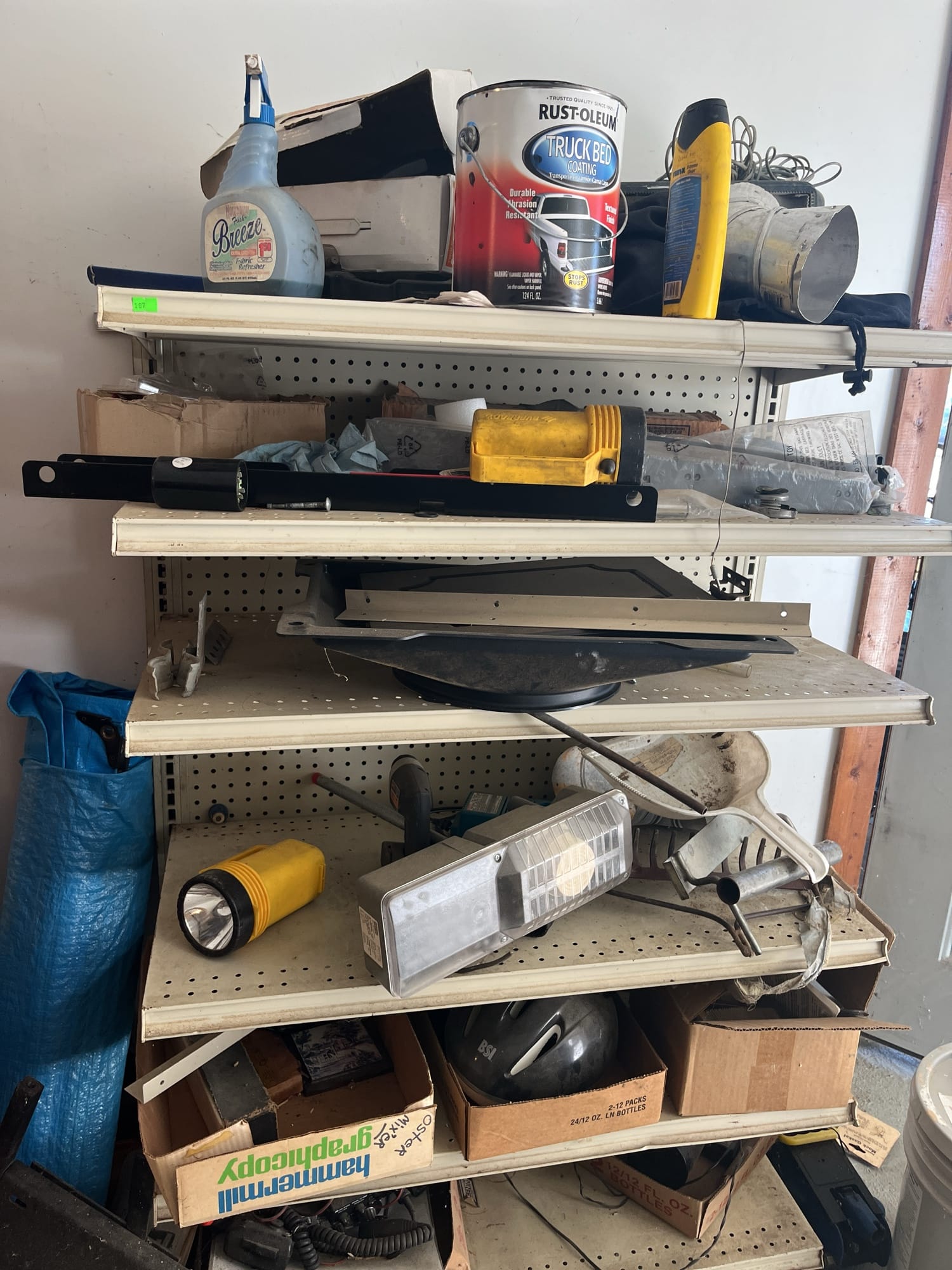 167 Loose contents on shelves inc. flashlights, paint supplies, helmet, duct, misc.
