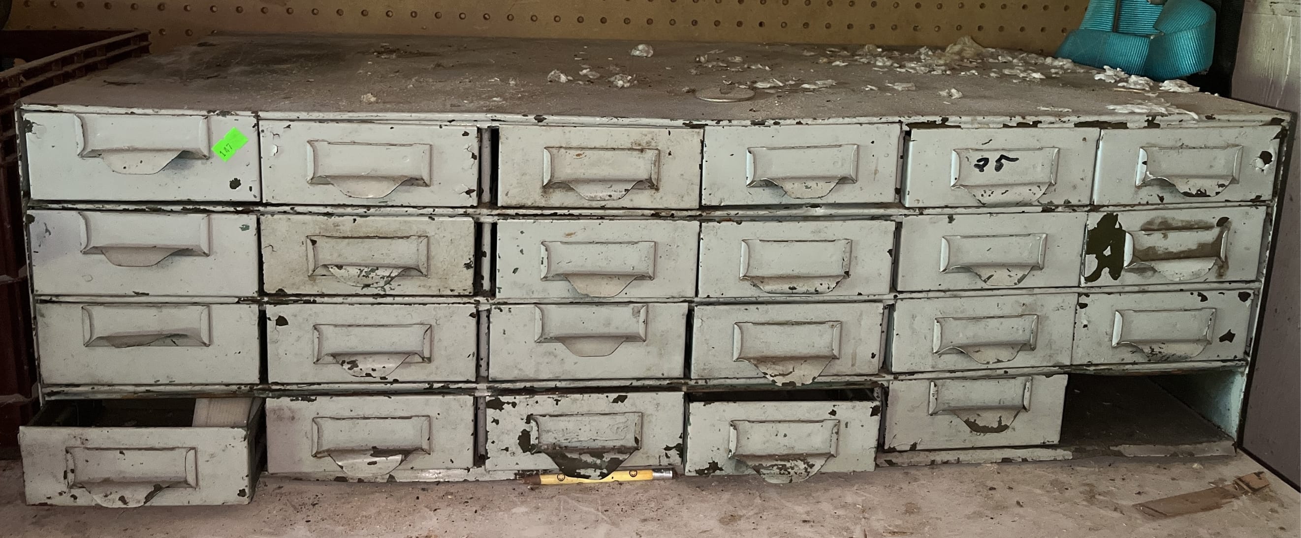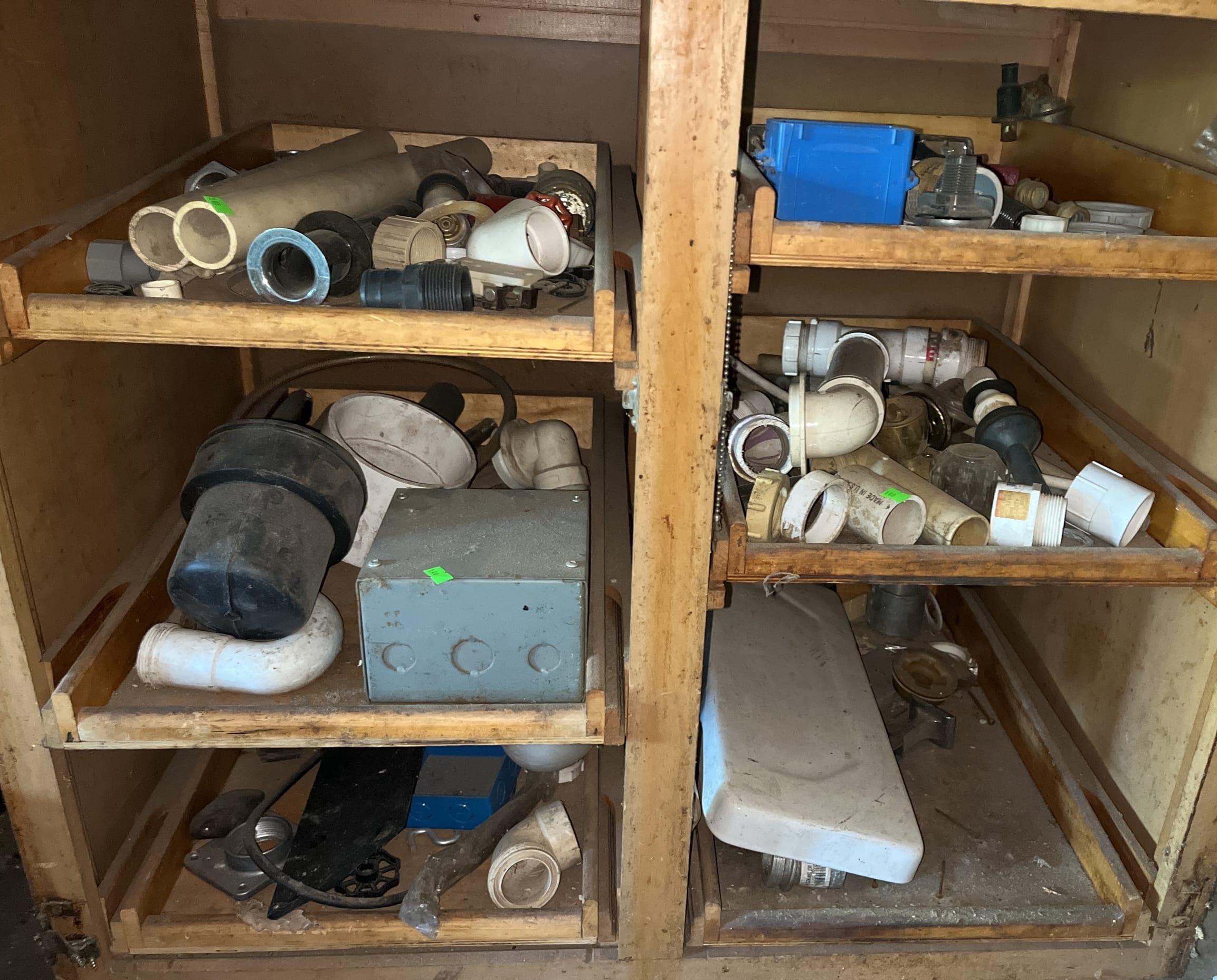 148 Wood shelf with contents inc. hardware, brackets, file organizer, misc. 28x50x12"