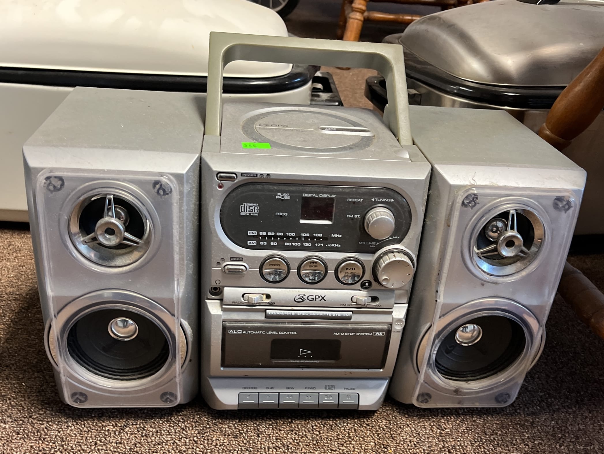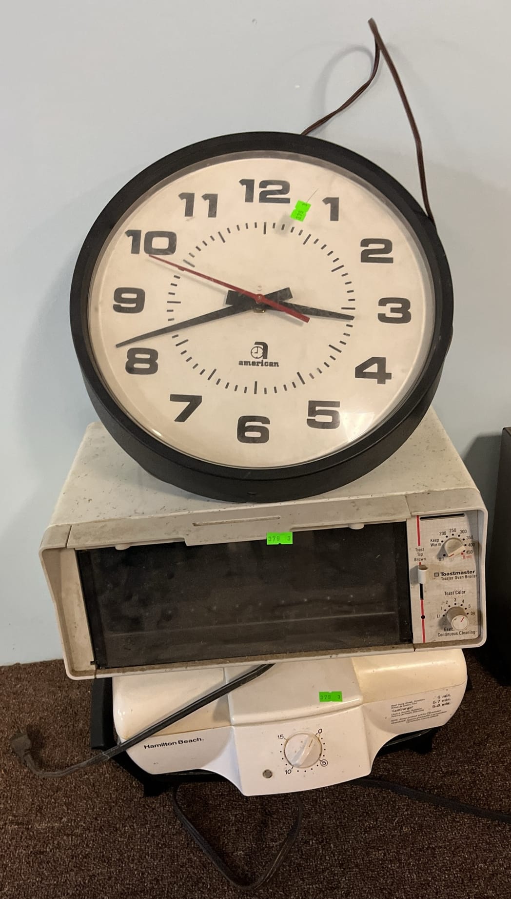 379 Plastic clock, toaster oven and Hamilton Beach electric grill