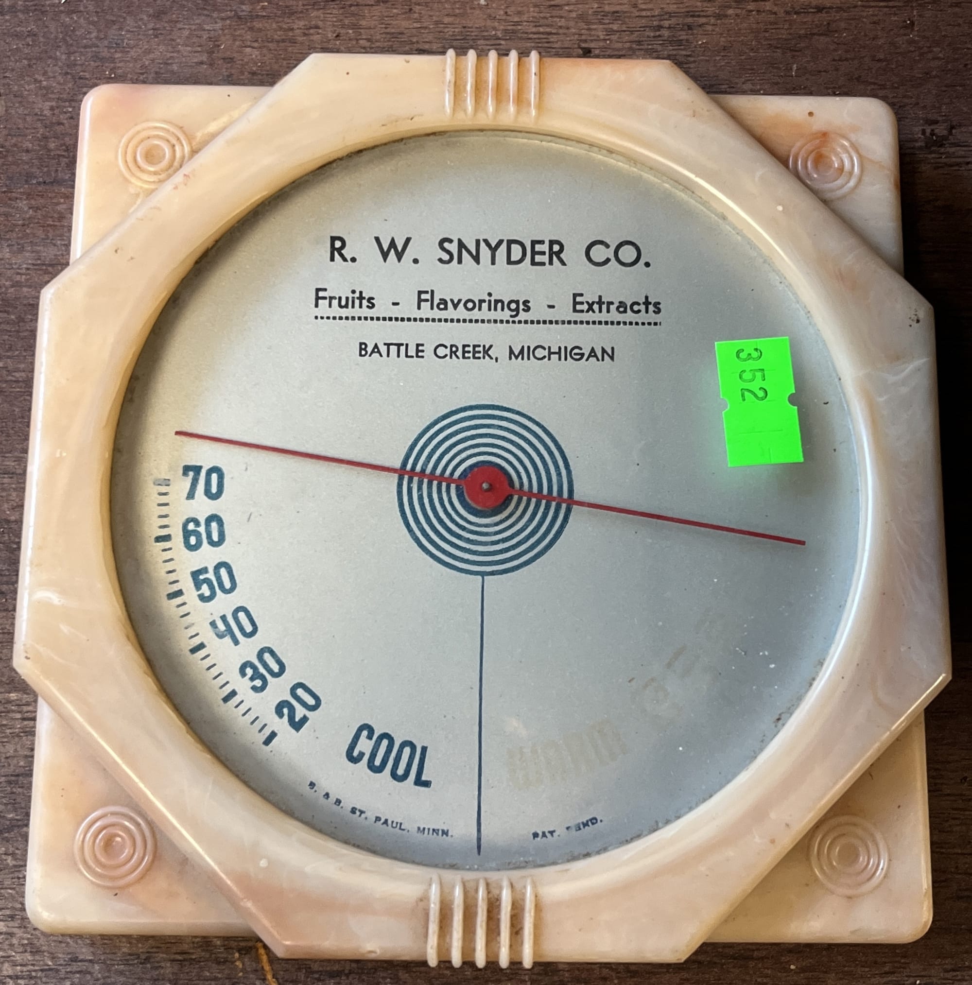 352 R.W. Snyder plastic thermometer - Battle Creek, Michigan 5.75"
