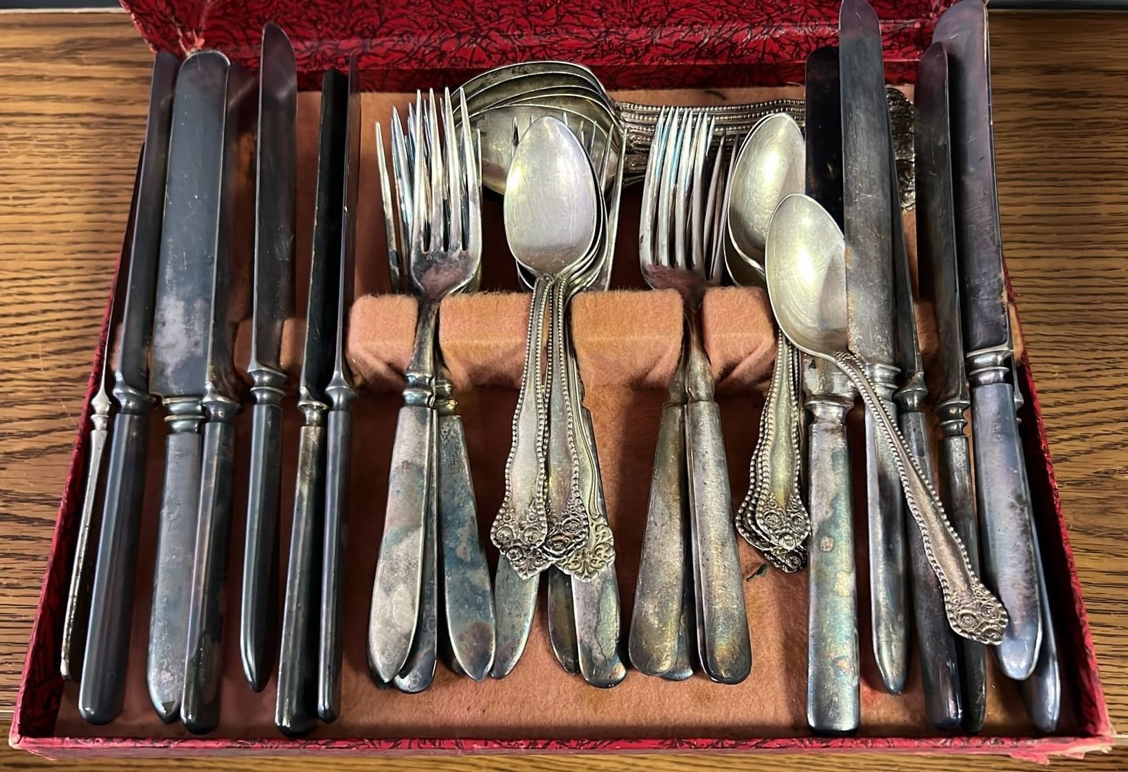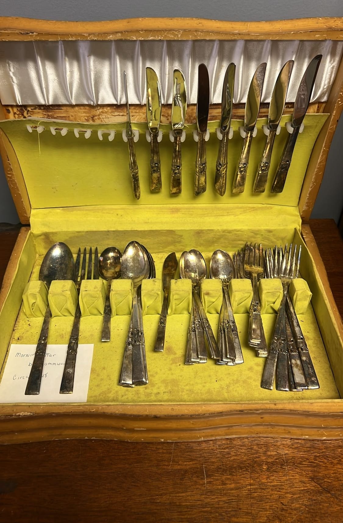 14 Morning Star by Community Circa 1948 Silverplated Flatware in Wood Box 16”x3.5”x11”
