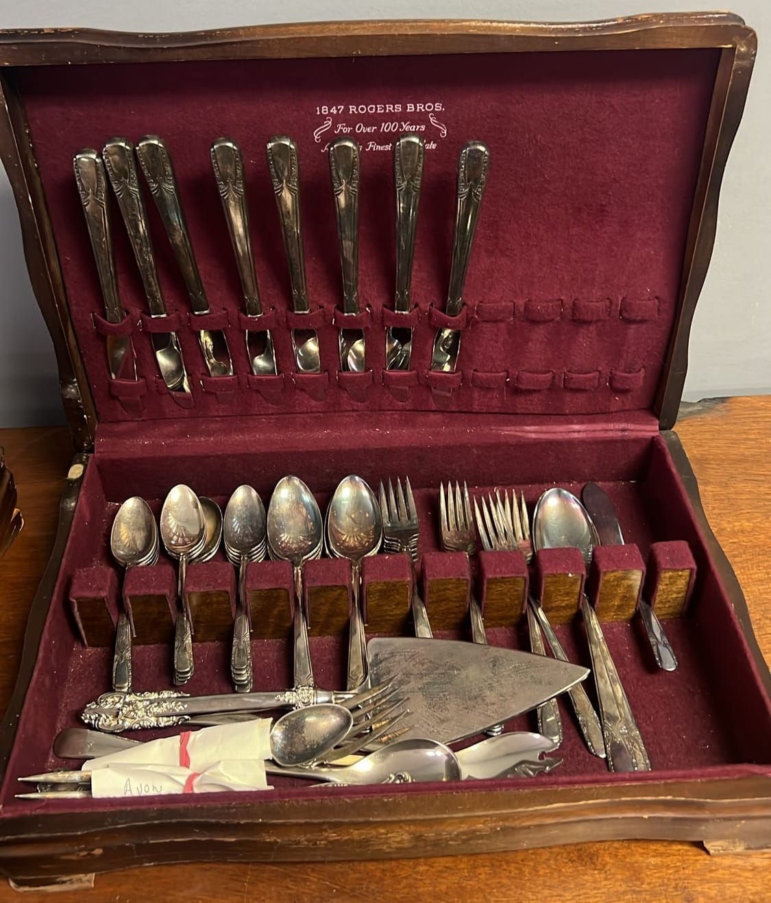 15 WM Rogers & Son IS Silverplated Flatware & 1847 Serving Pieces • Cake Server in Footed Wood Box 17”x3.75”x11”