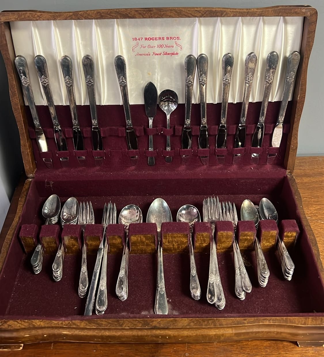 16 1847 Rogers Bros. IS Adoration Silverplated Flatware in Footed Wood Box 19”x4”x11.5”