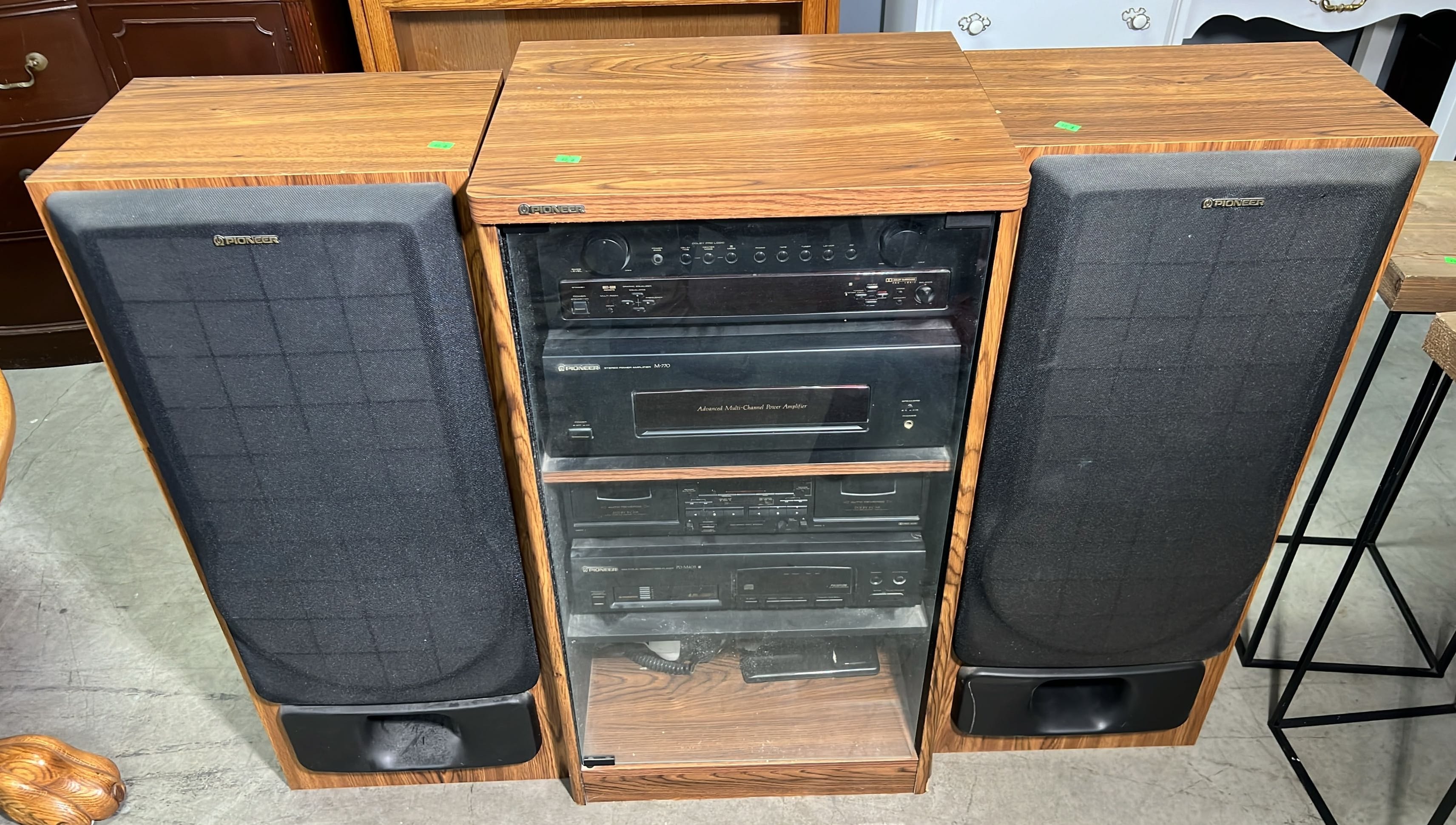 42 Pioneer Stereo System with in Cabinet 19”x35.5”x15.25” with Two Pioneer Speakers 15”x35.5”x11.25” (see photos)