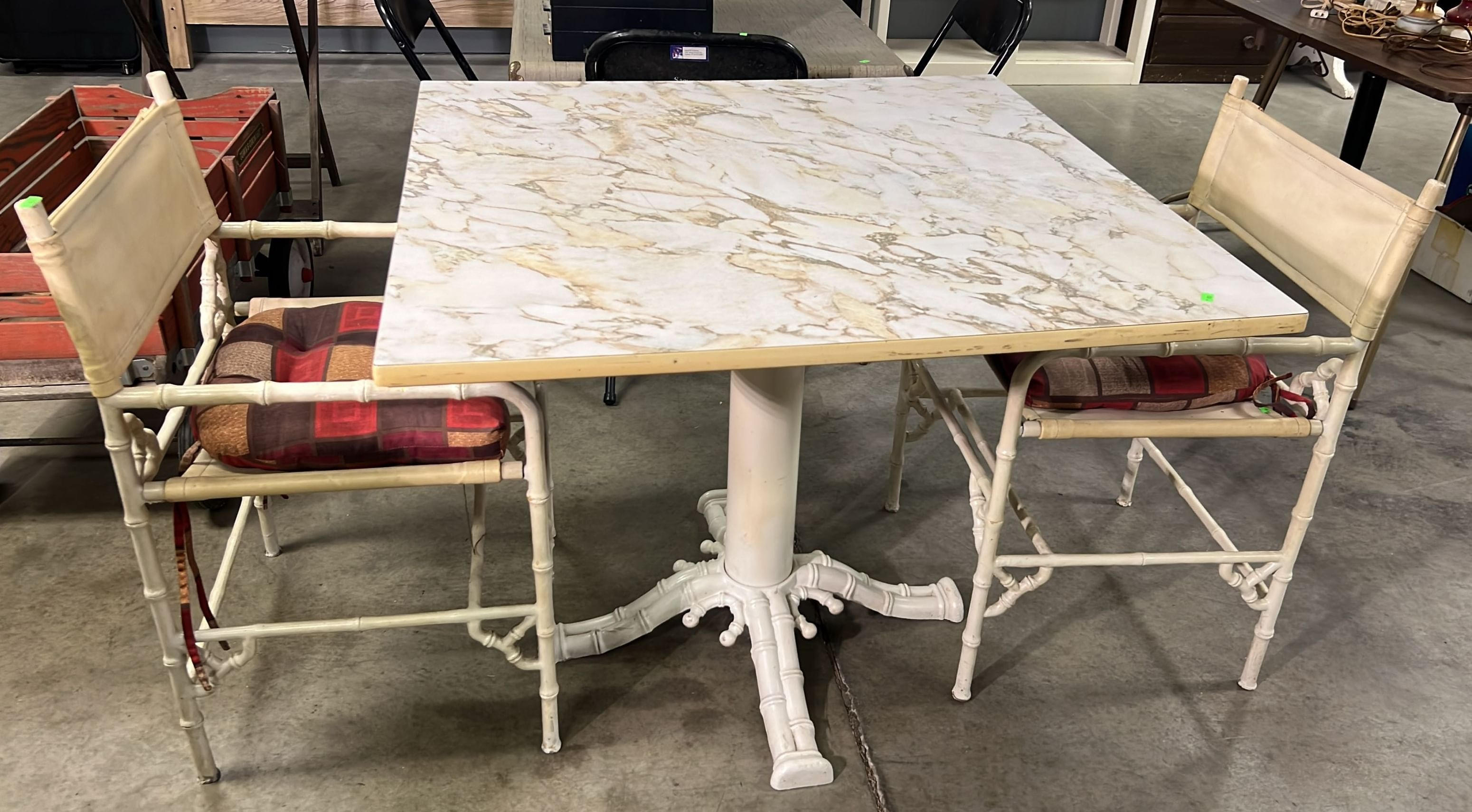 63 Square Formica Top Table 36”x29”x36” with Two Metal Chairs 20”W Seat Ht. 18”