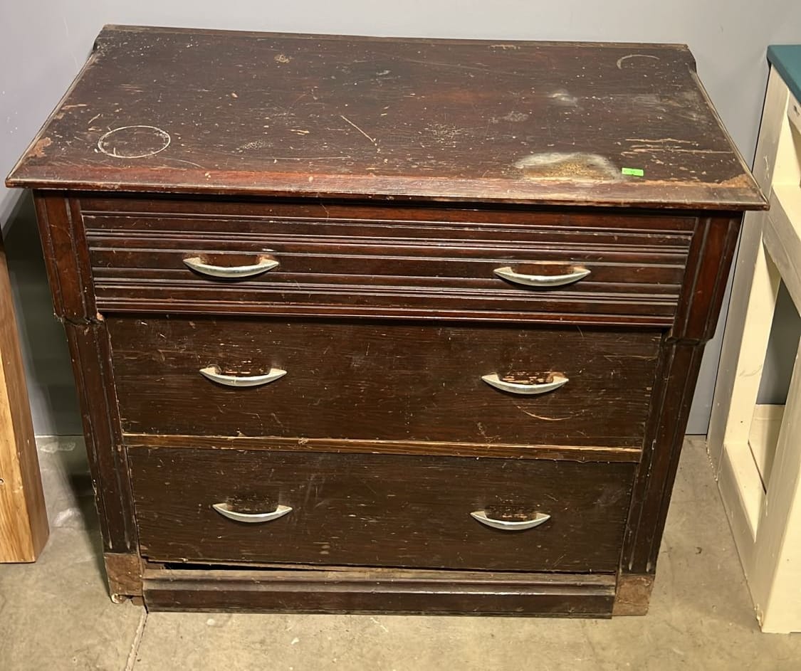 71 Three-Drawer Dresser on Rollers 31”x29.75”x16” (missing rollers needs work)
