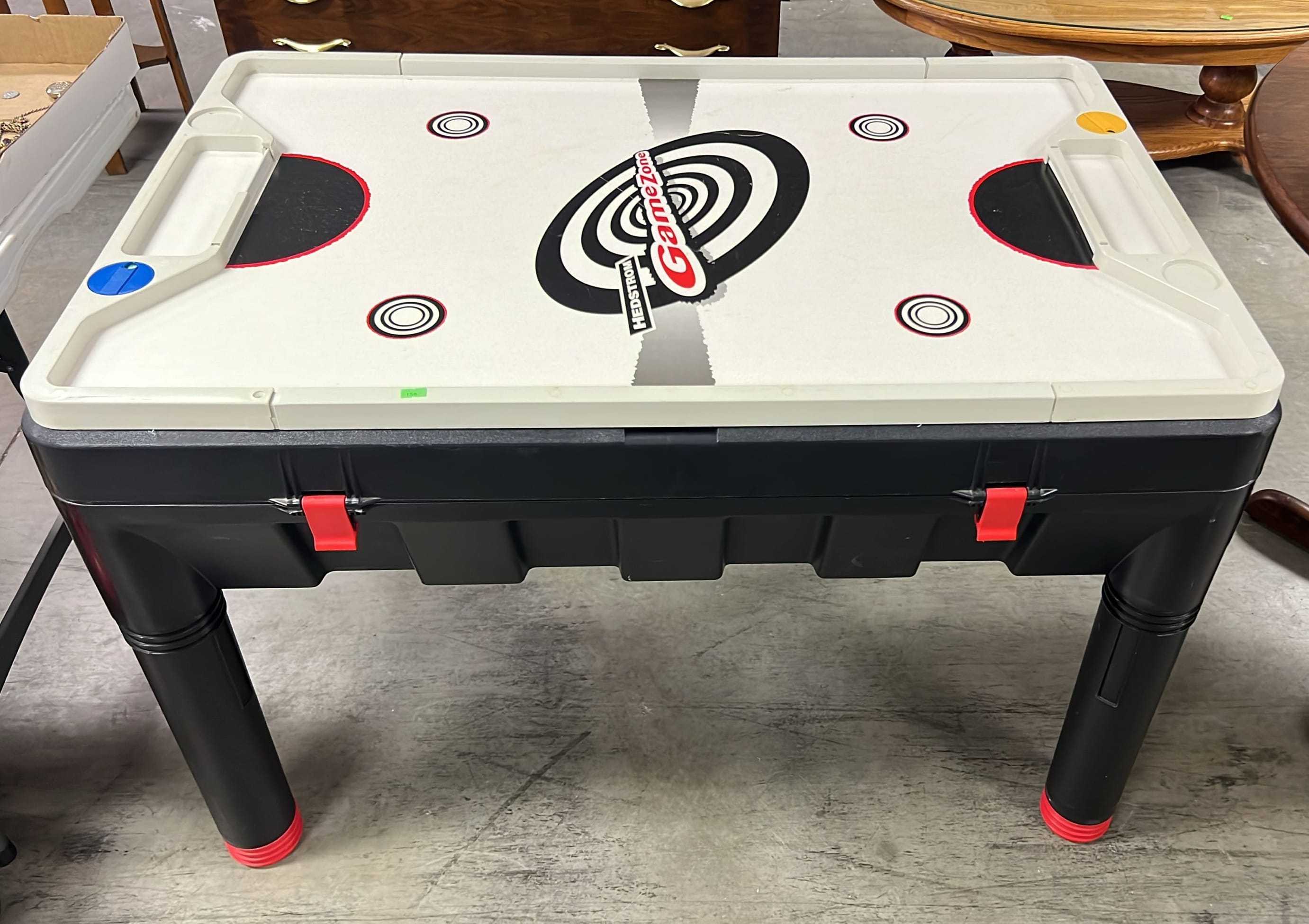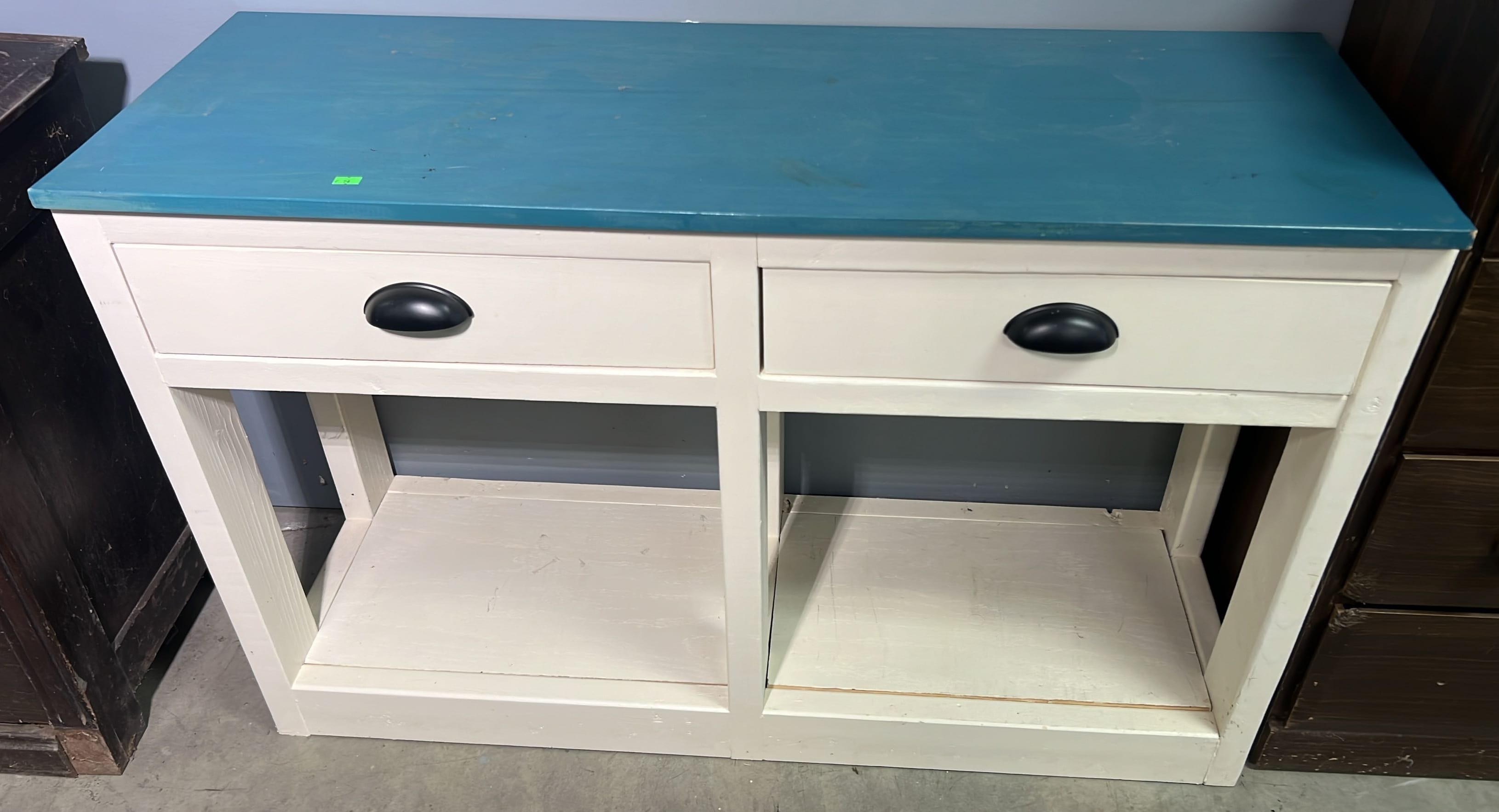 338 Painted Wood Table, white top with black frame - contents on and under NOT included 35.5”x59”x 29.5”