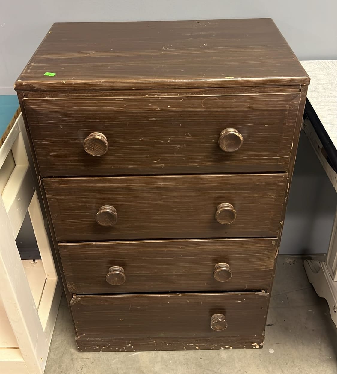 75 Four Drawer Painted Dresser (missing knob) 22.25”x35.25”x14.25”