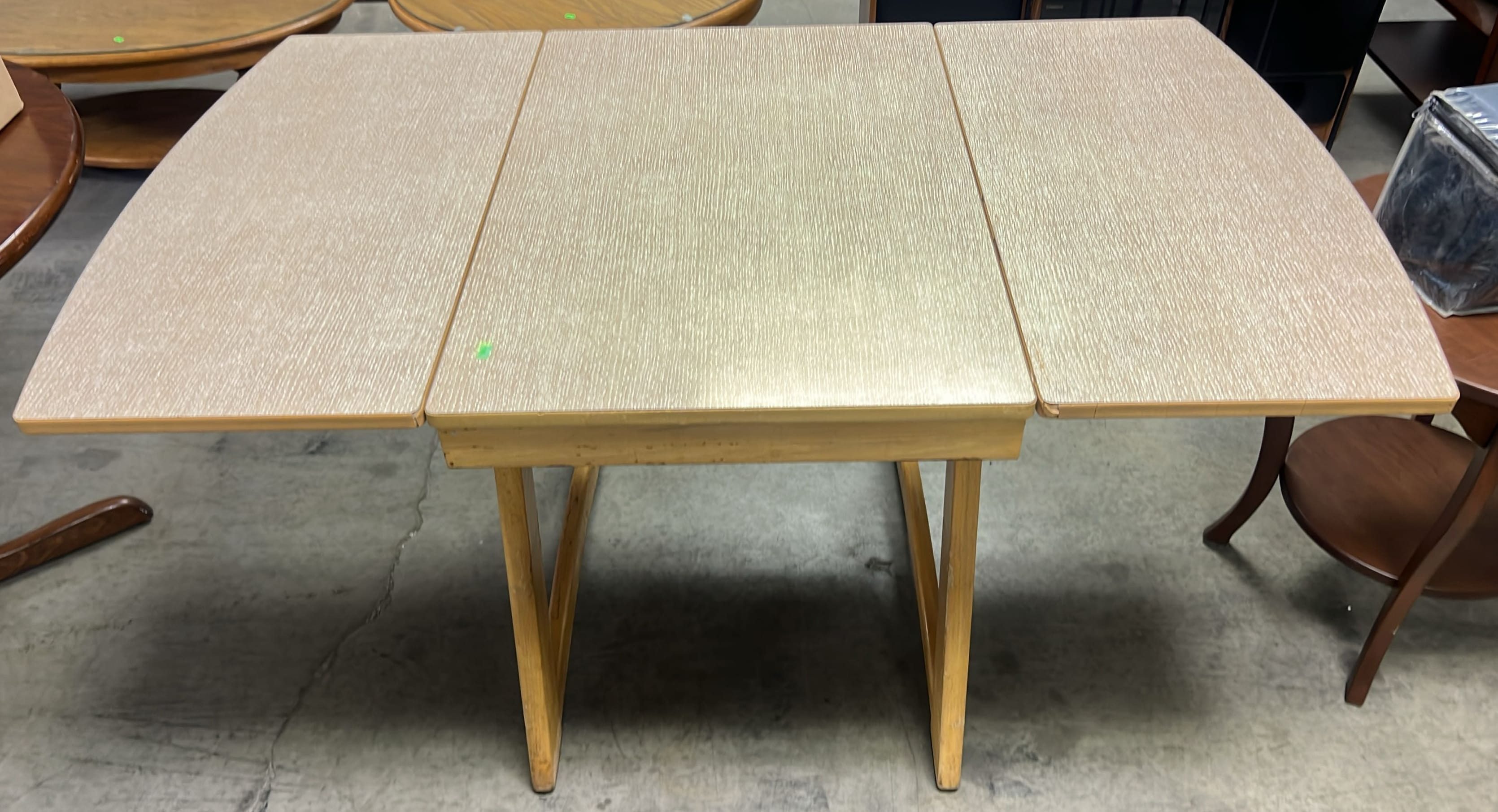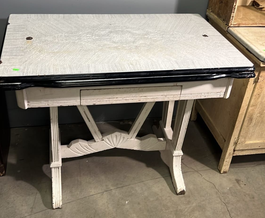 77 Enamel Top Dining Table with pull out leaves and Drawer 40”x30.75”x24.75” (has some chips)