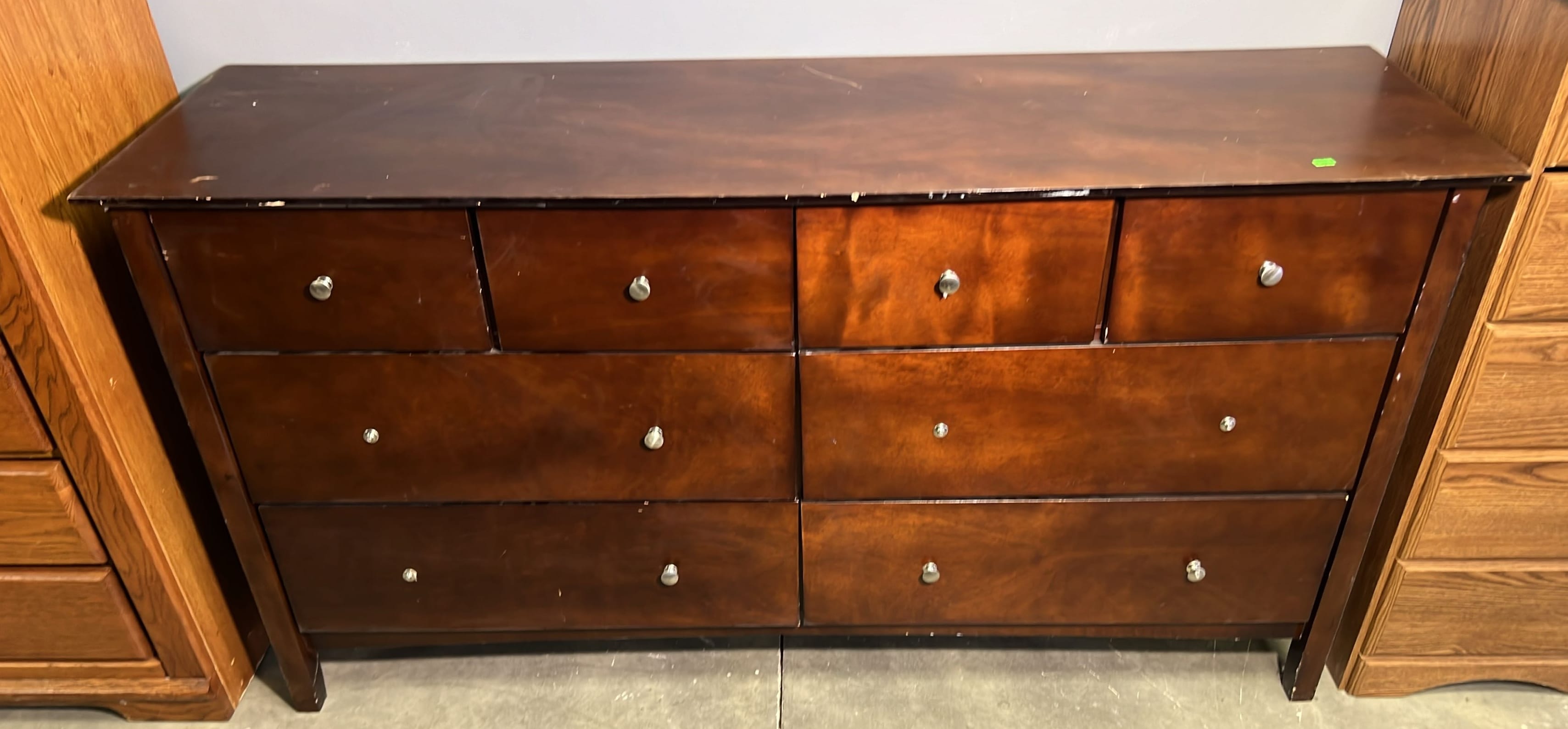 86 Dresser with Eight Drawers 63.5”x34.25”x17.75” (missing Four Drawer Pulls)