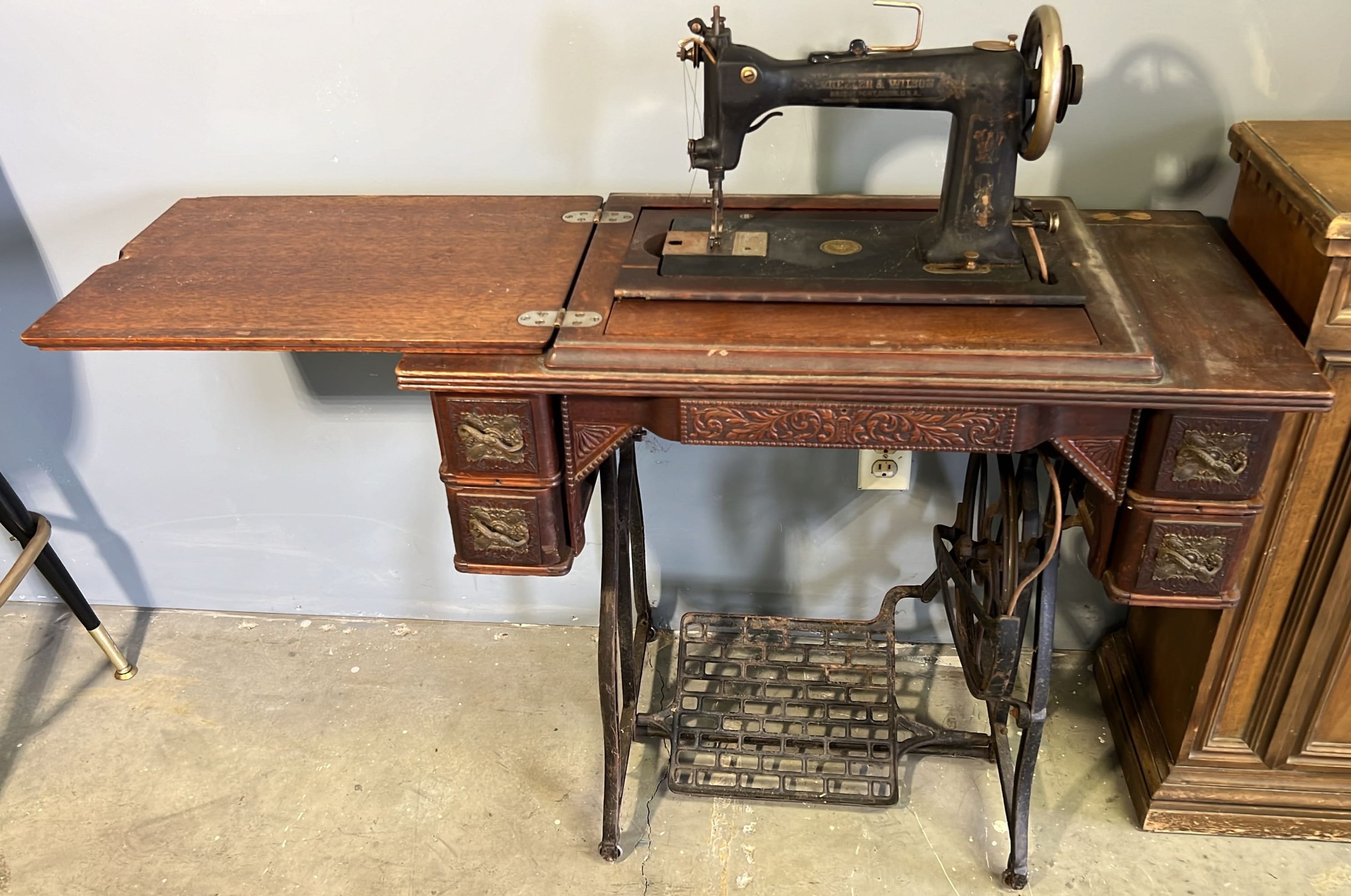 90 Wheeler & Wilson Mfg. Co. Treadle Sewing Machine #2530062 in Ornate Wood Sewing Cabinet 32”x29.5”x16” with Accessories