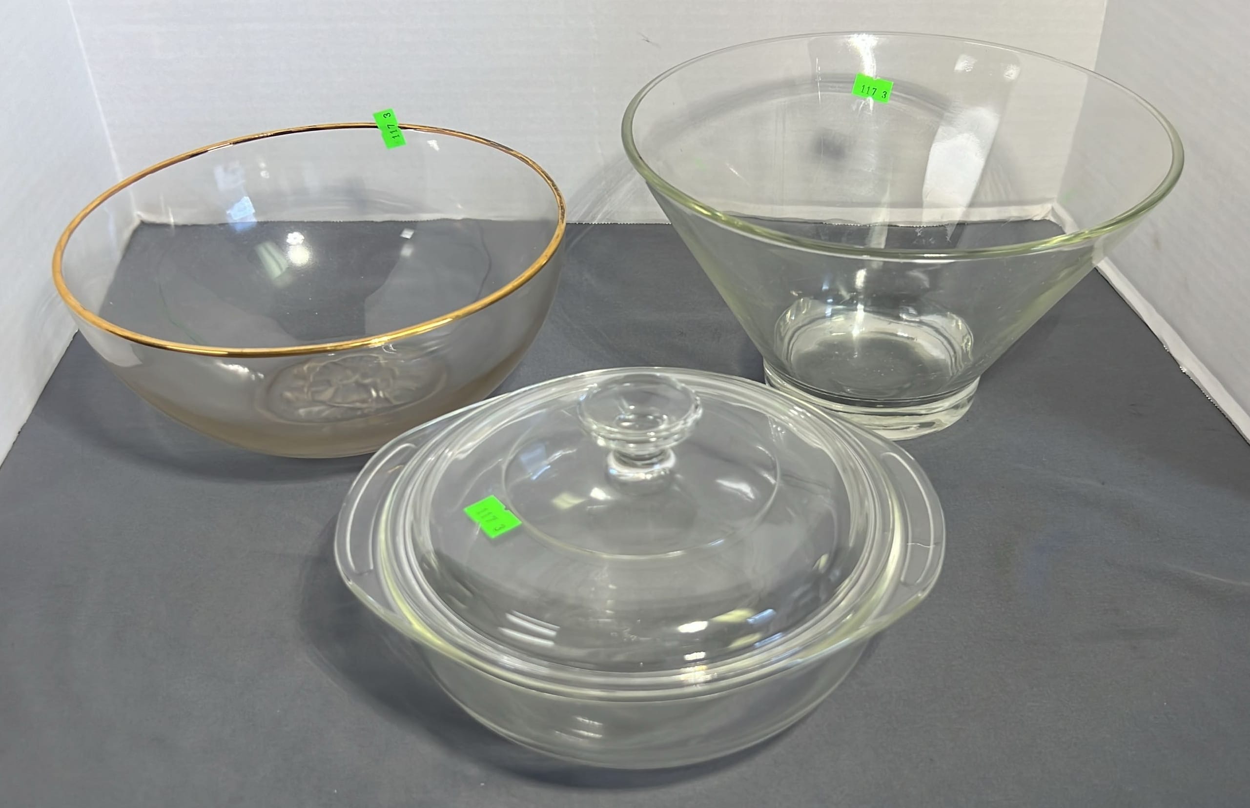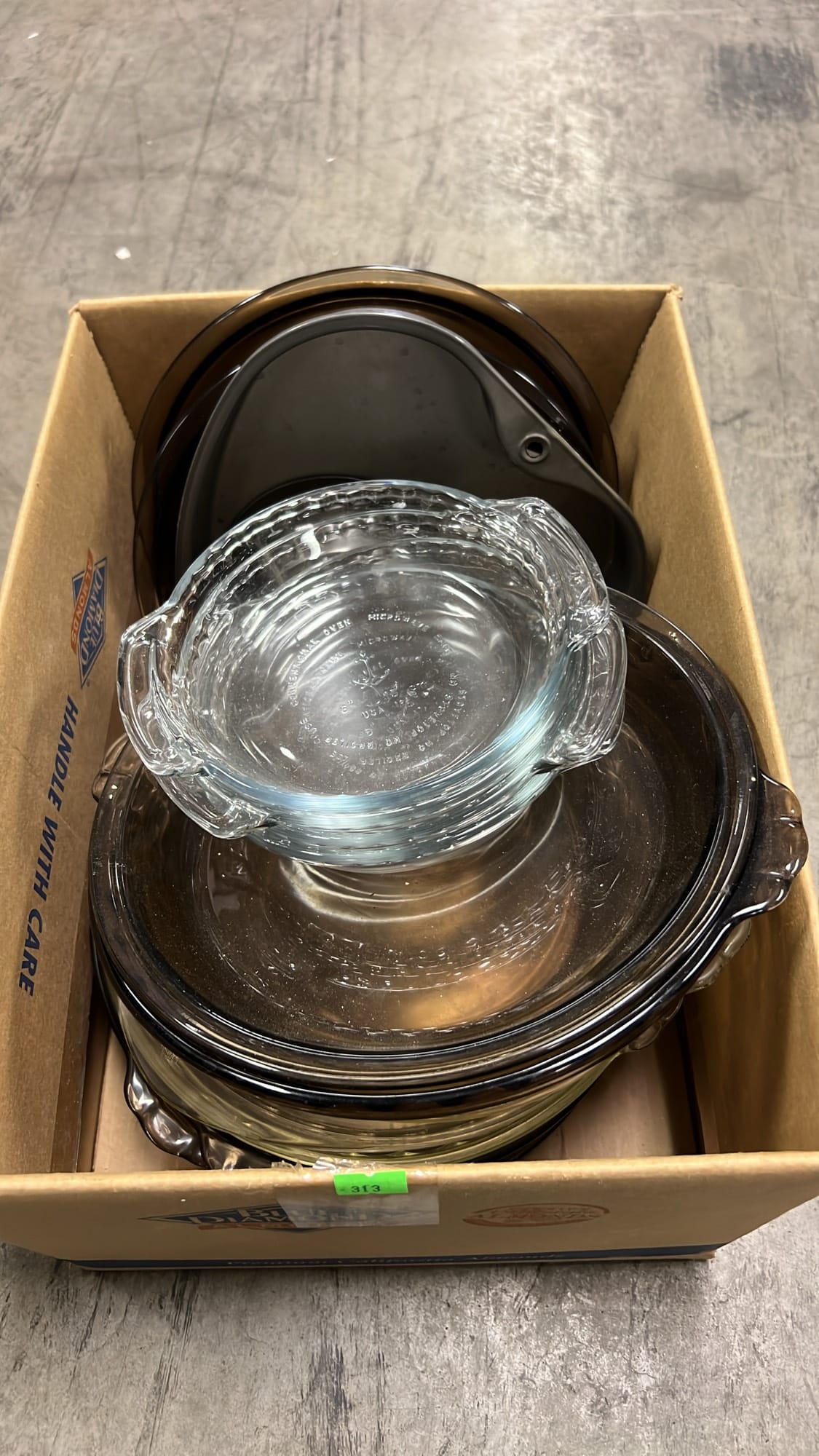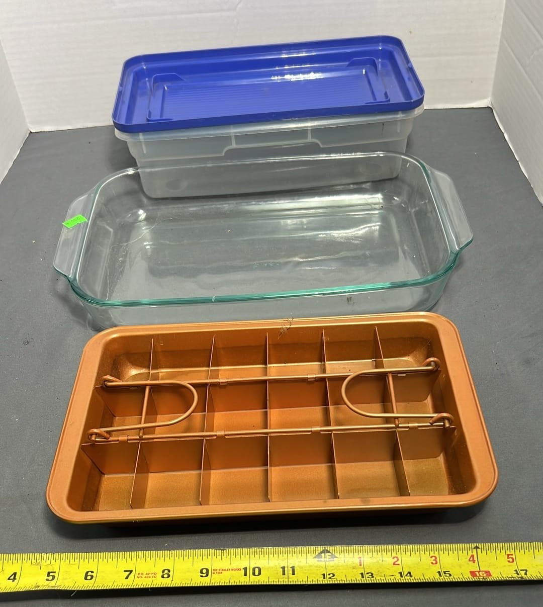 295 Brownie Pan 8”x12”, Pyrex 3 Quart • Plastic Storage 7.25”x3.5”x3.25”