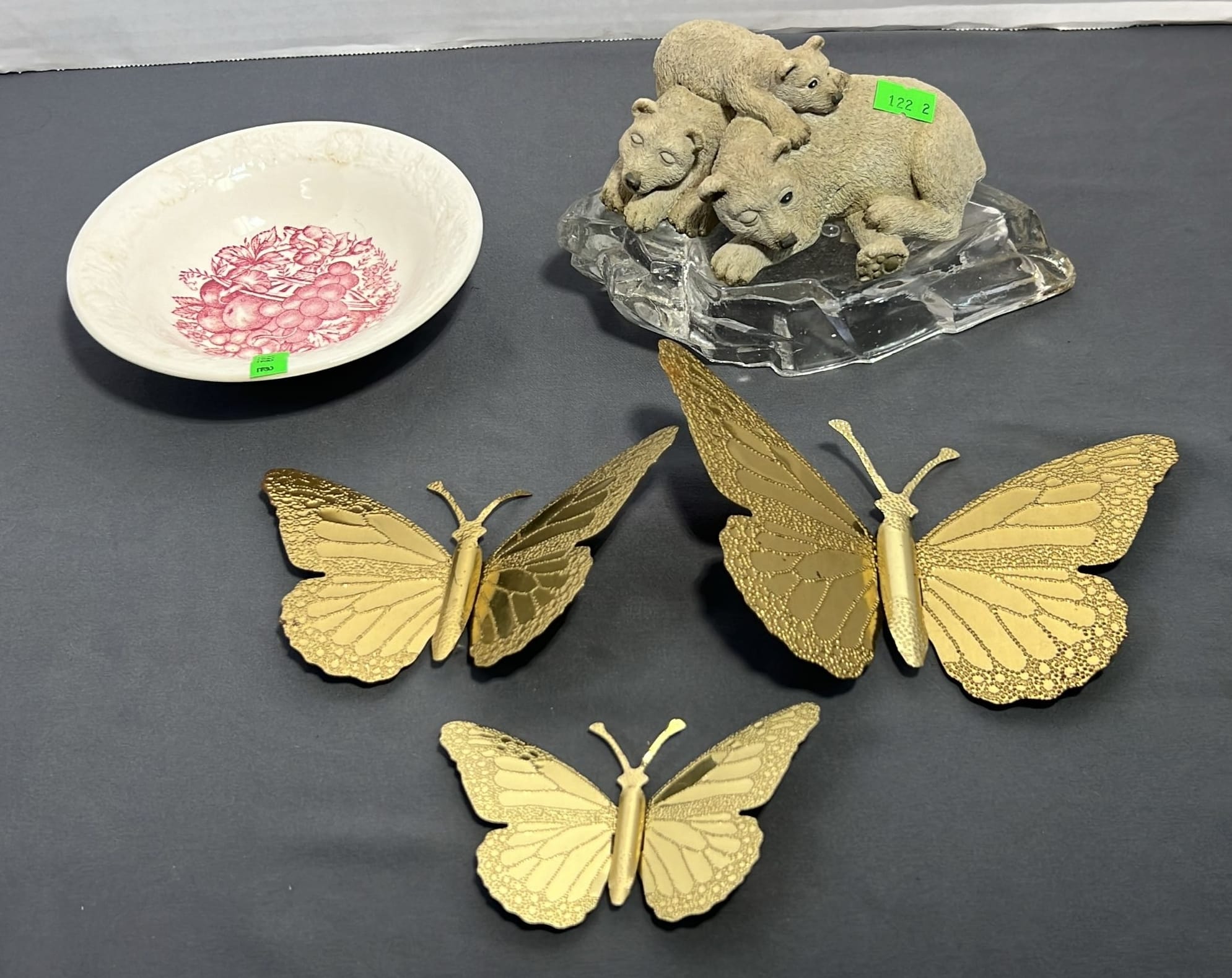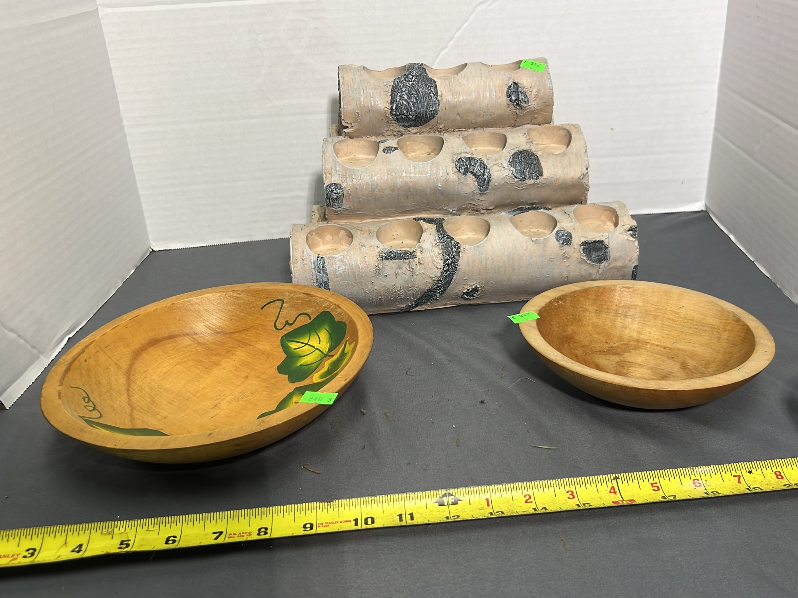 246 Two - Wood Bowls 6.75”, 9” • Woodland Logs 12 Tea Light Candle Holder Hard Plastic 11.75” Long