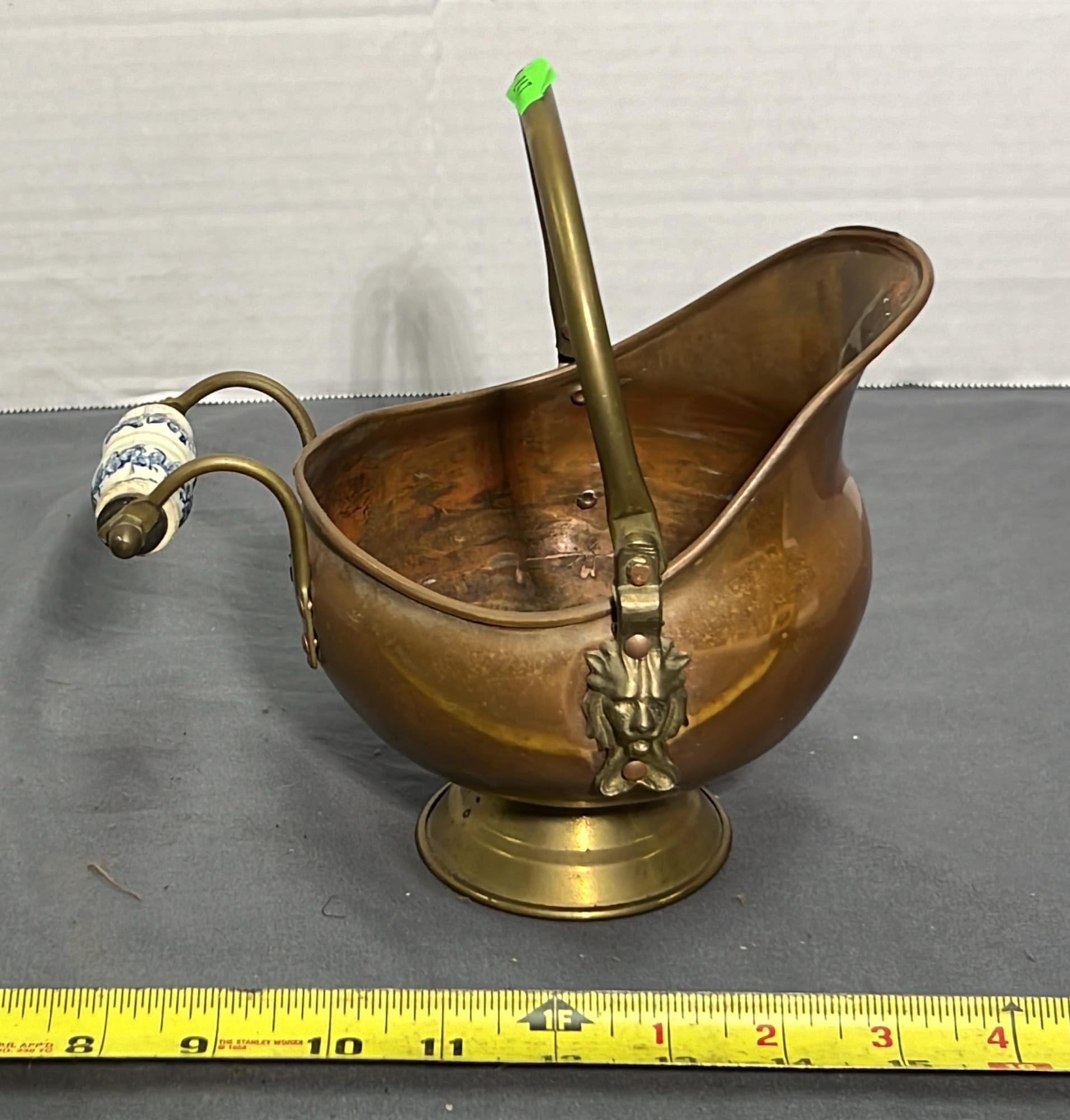 247 Cooper & brass firplace Coal scuttle Bucket Porcelain Handle With Lion Head 8”