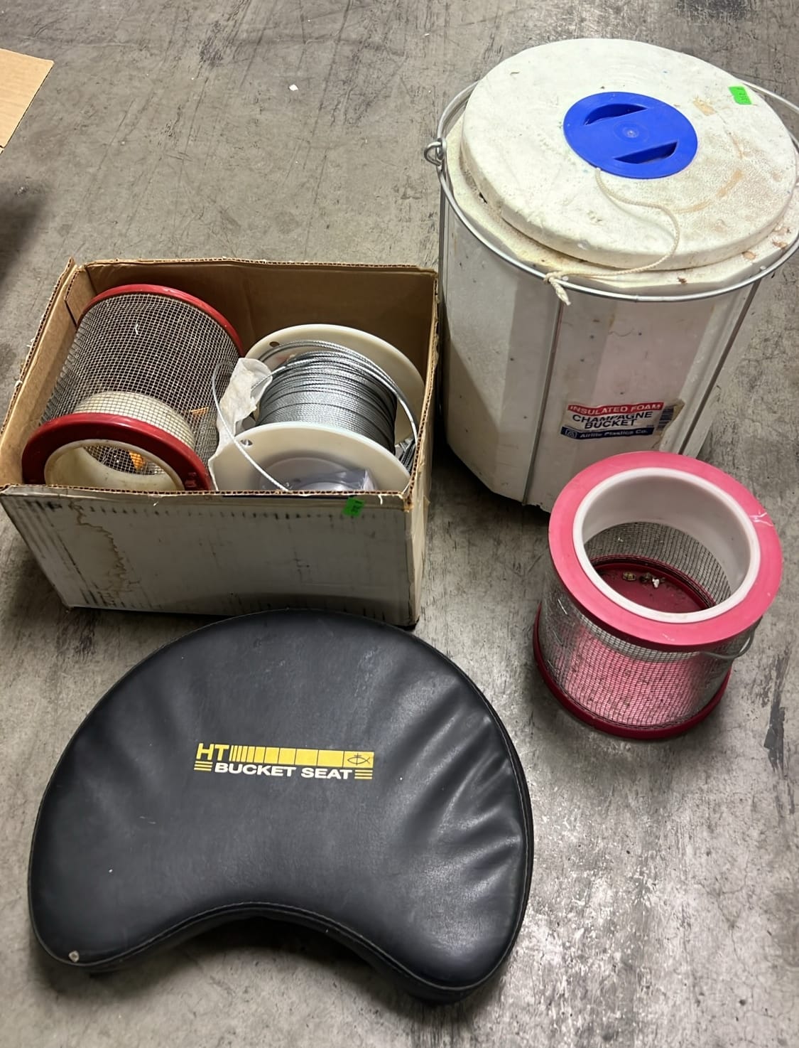 312 Champagne Bucket 10.5”x12.5” & Bait Cans no lids • Cable • Fishing Line • Bucket Seat