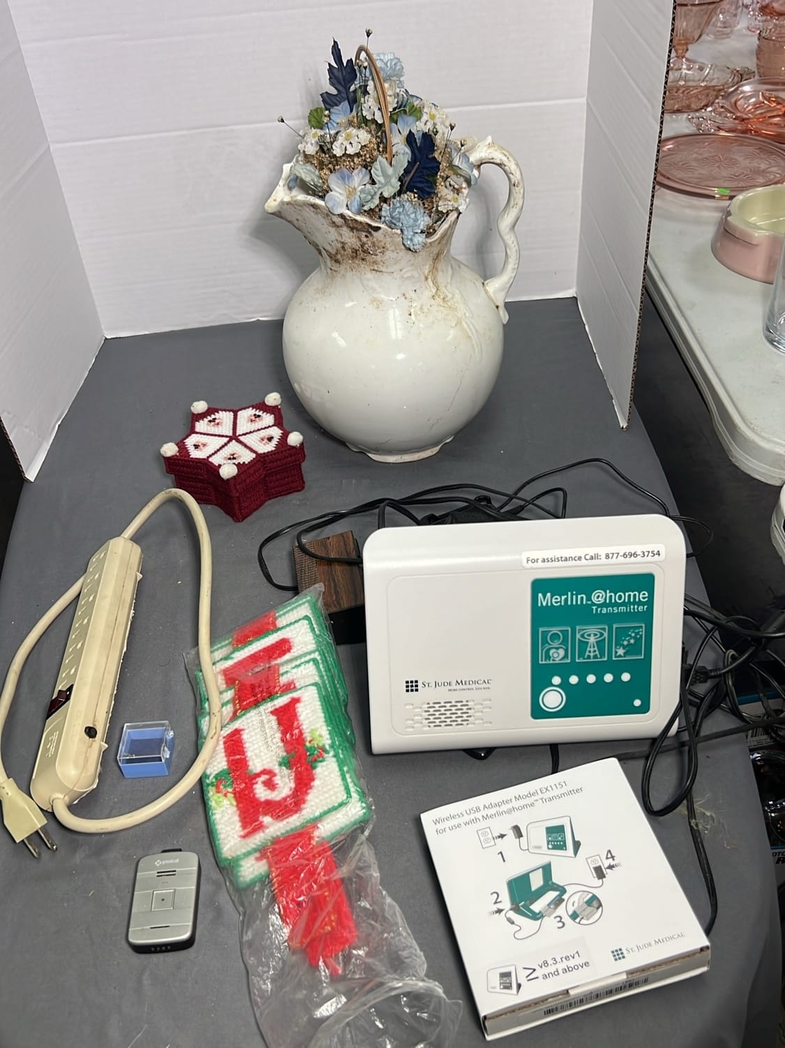 324 Porcelain Pitcher has Crack 11” • Two - Noel Wall Hangings • Hand Made Coasters • St. Jude Medical Wireless USB Adapter Model # EX1151 & Merlin Home Transmitter EX 1150 • Power Strip • Misc.