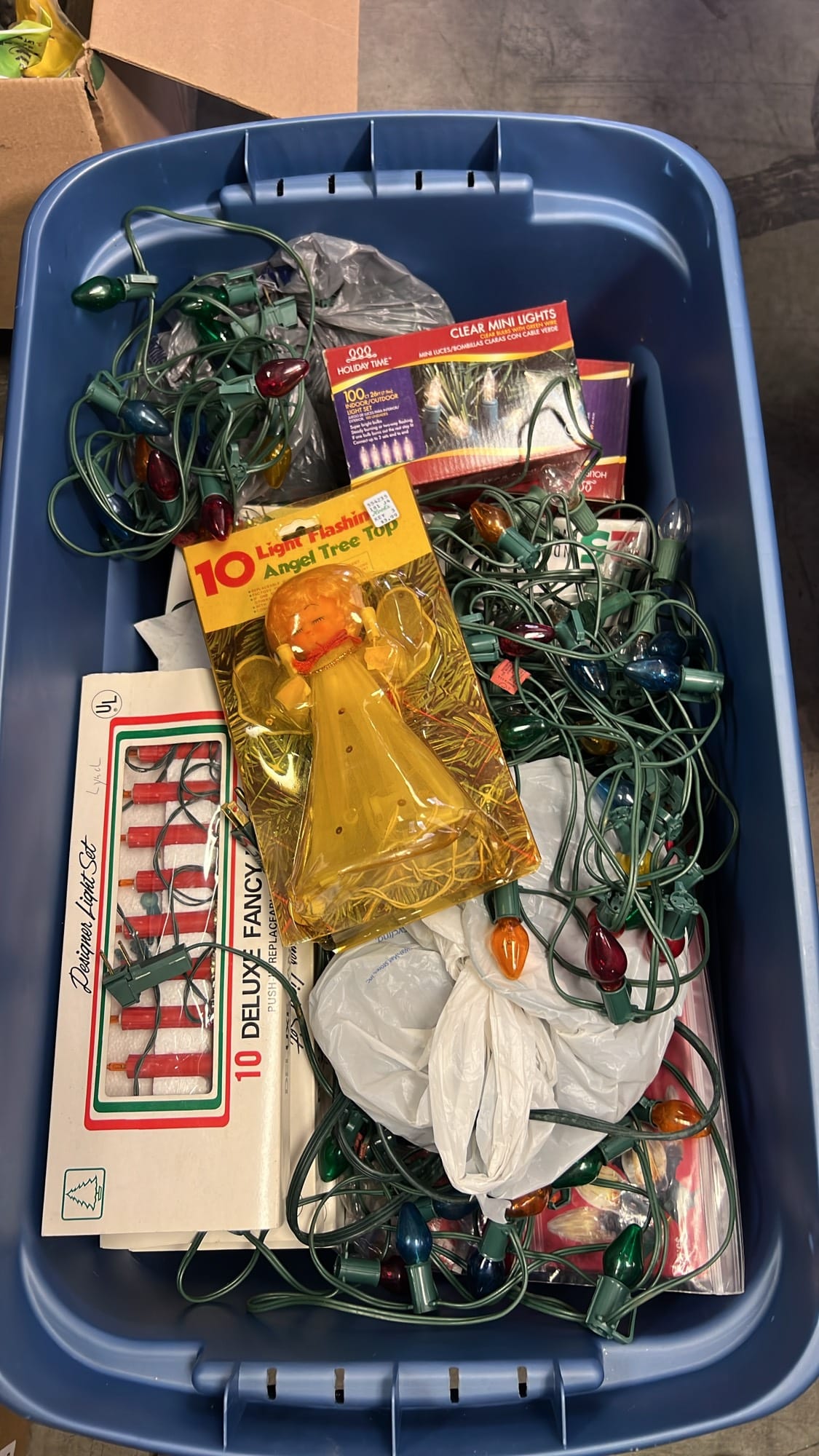 325 Angel Tree Top & Christmas Light assortment (see photos) • Tote with Lid 19”